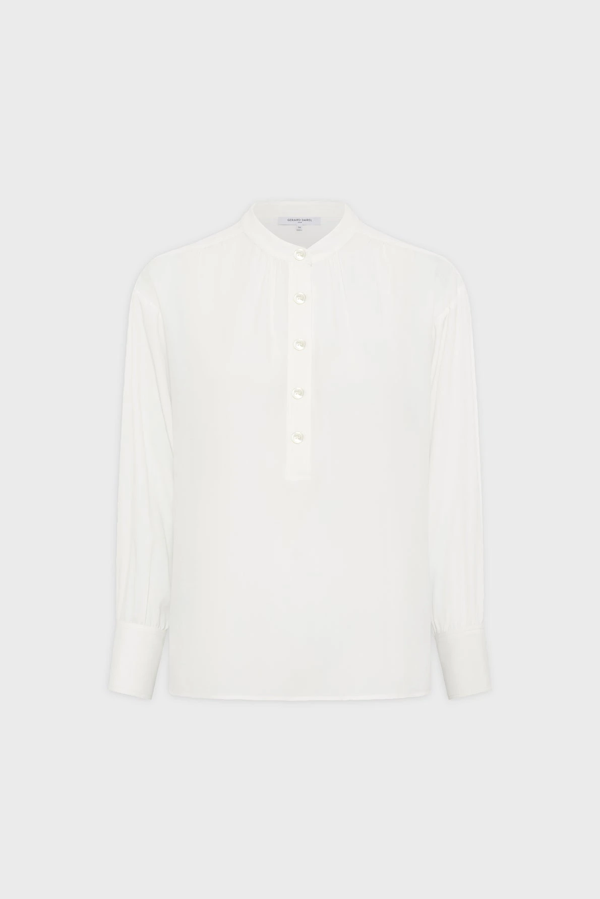 La blouse Cezanne séduit par sa matière fluide en crêpe enrichie de soie, qui apporte légèreté et mouvement à la silhouette. Son col tunisien et ses manches bouffantes lui confèrent une allure à la fois féminine et contemporaine.