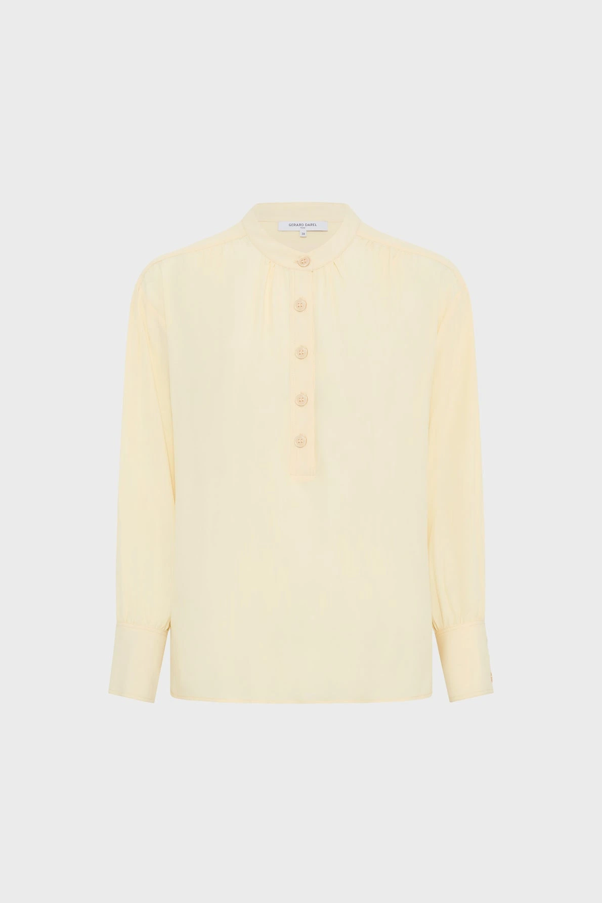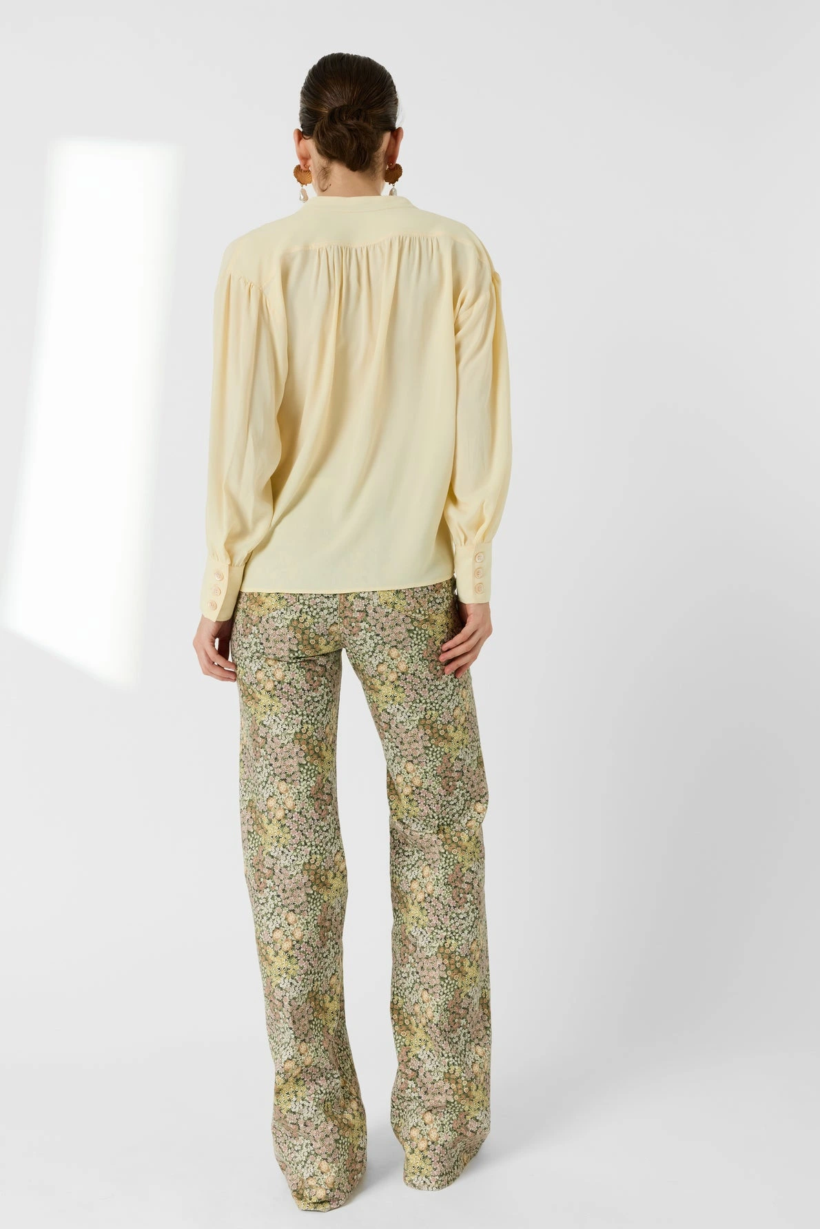 La blouse Cezanne séduit par sa matière fluide en crêpe enrichie de soie, offrant un tombé léger et naturel. Son coloris jaune, à la fois doux et lumineux, illumine la silhouette et apporte une touche de modernité.