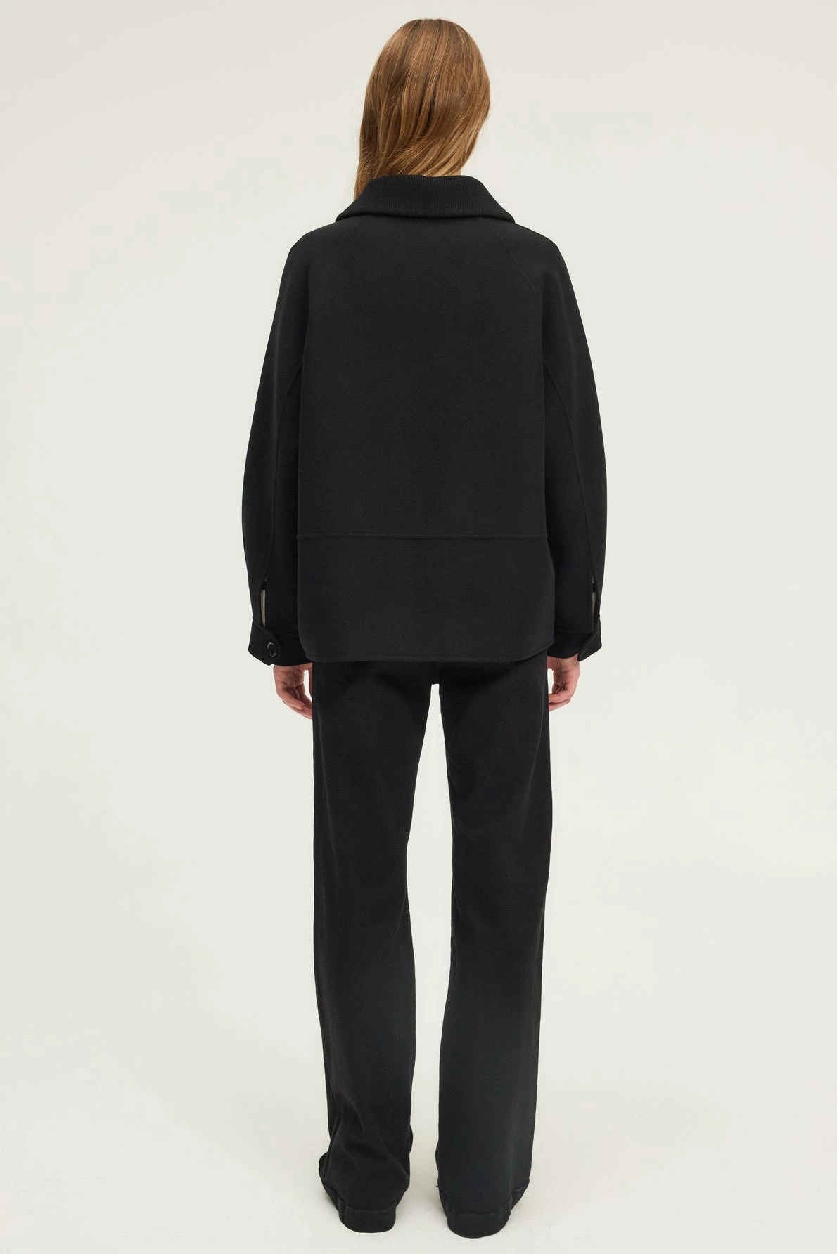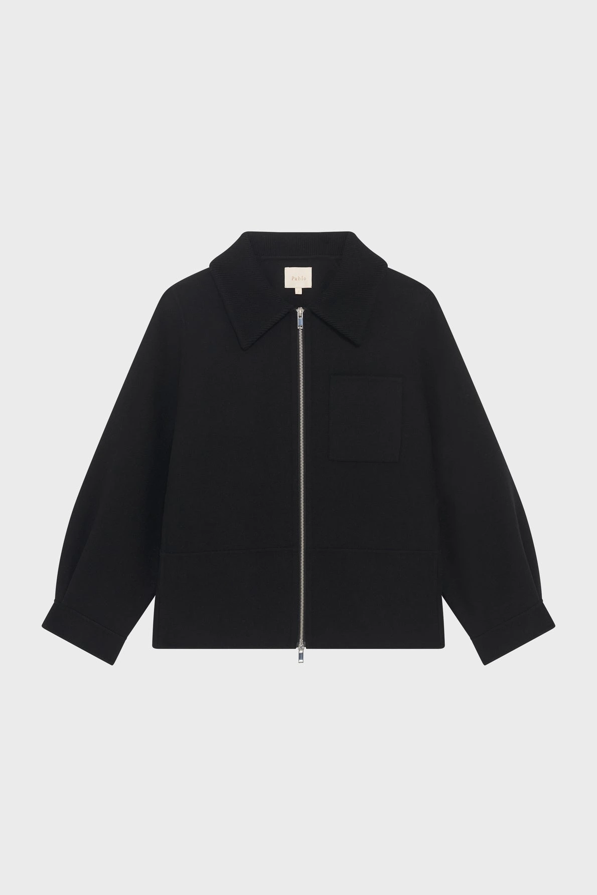 Blouson en laine double face noir, idéal pour l’entrée de saison. Zippé, il est doté d’une poche à la poitrine et d’un col chemise pour jouer le côté masculin féminin. Il se mariera aussi bien avec les jupes que les pantalons.