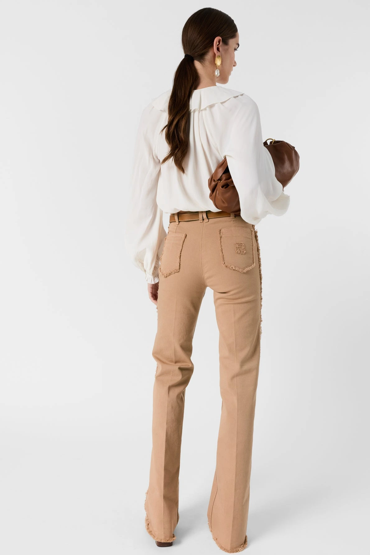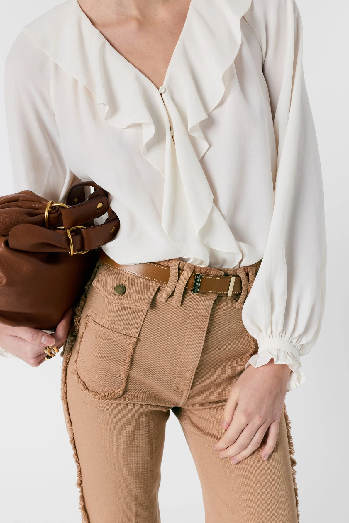 La chemise en crêpe à volants Cisana revisite les essentiels du vestiaire avec une approche fluide et contemporaine. Sa matière légère et ses détails volantés apportent du mouvement à la silhouette tout en conservant une allure structurée propre à la chemise.