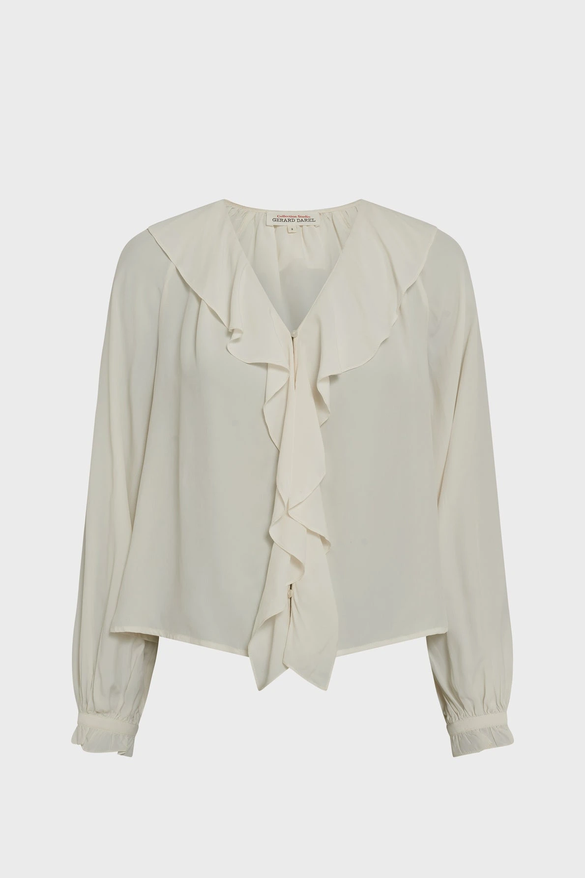 - Volant ornant le col, la patte de boutonnage et les poignets