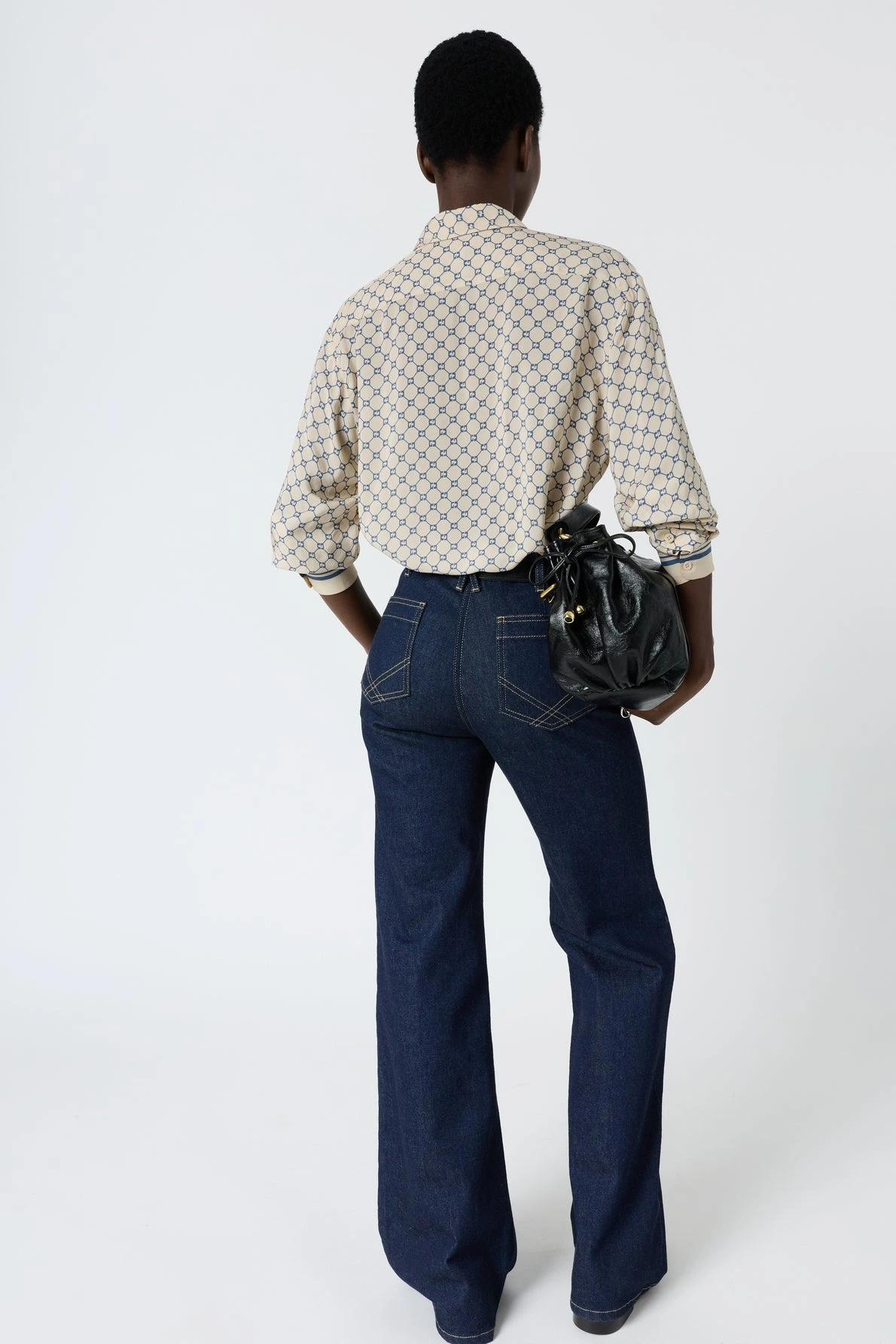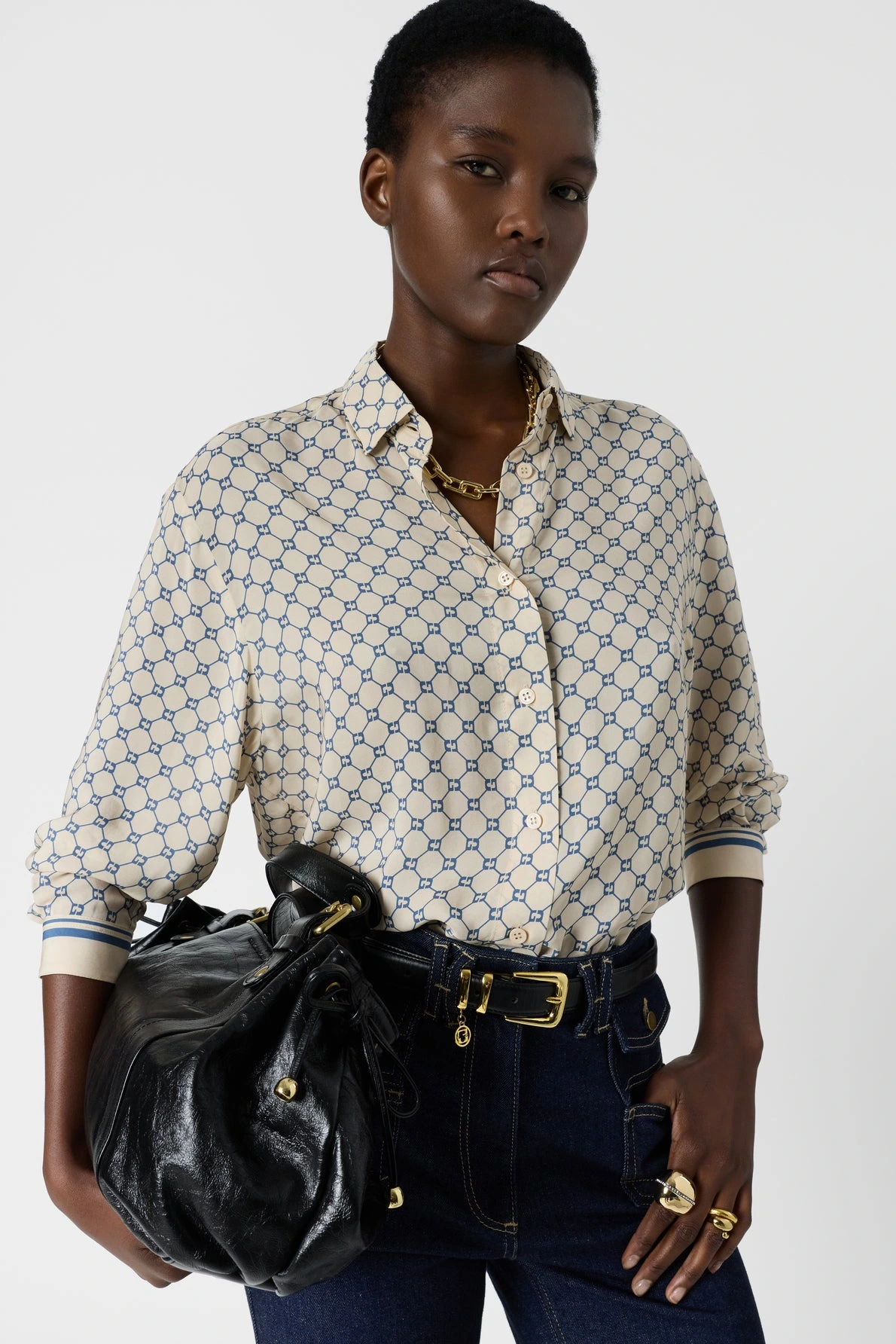 La chemise Clariane revisite les codes classiques avec son motif monogramme bleu sur fond clair, apportant une signature visuelle subtile et raffinée. Sa coupe fluide crée un mouvement naturel tout en conservant une structure élégante propre à la chemise.