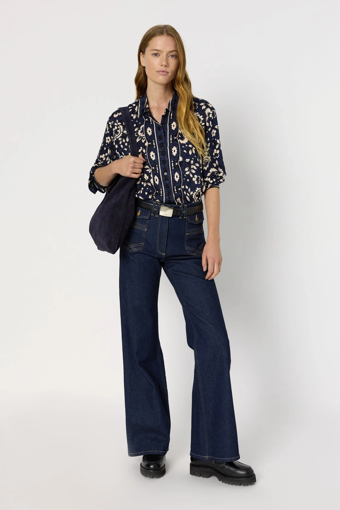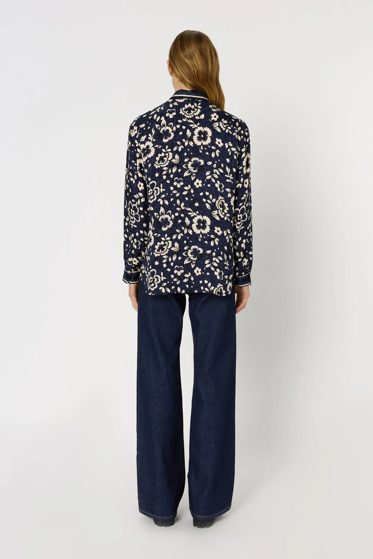 Cette chemise satinée se distingue par son motif floral écru sur un fond jacquard bleu indigo. Confectionné dans une matière légèrement satinée, elle rehaussera avec chic un bas uni.