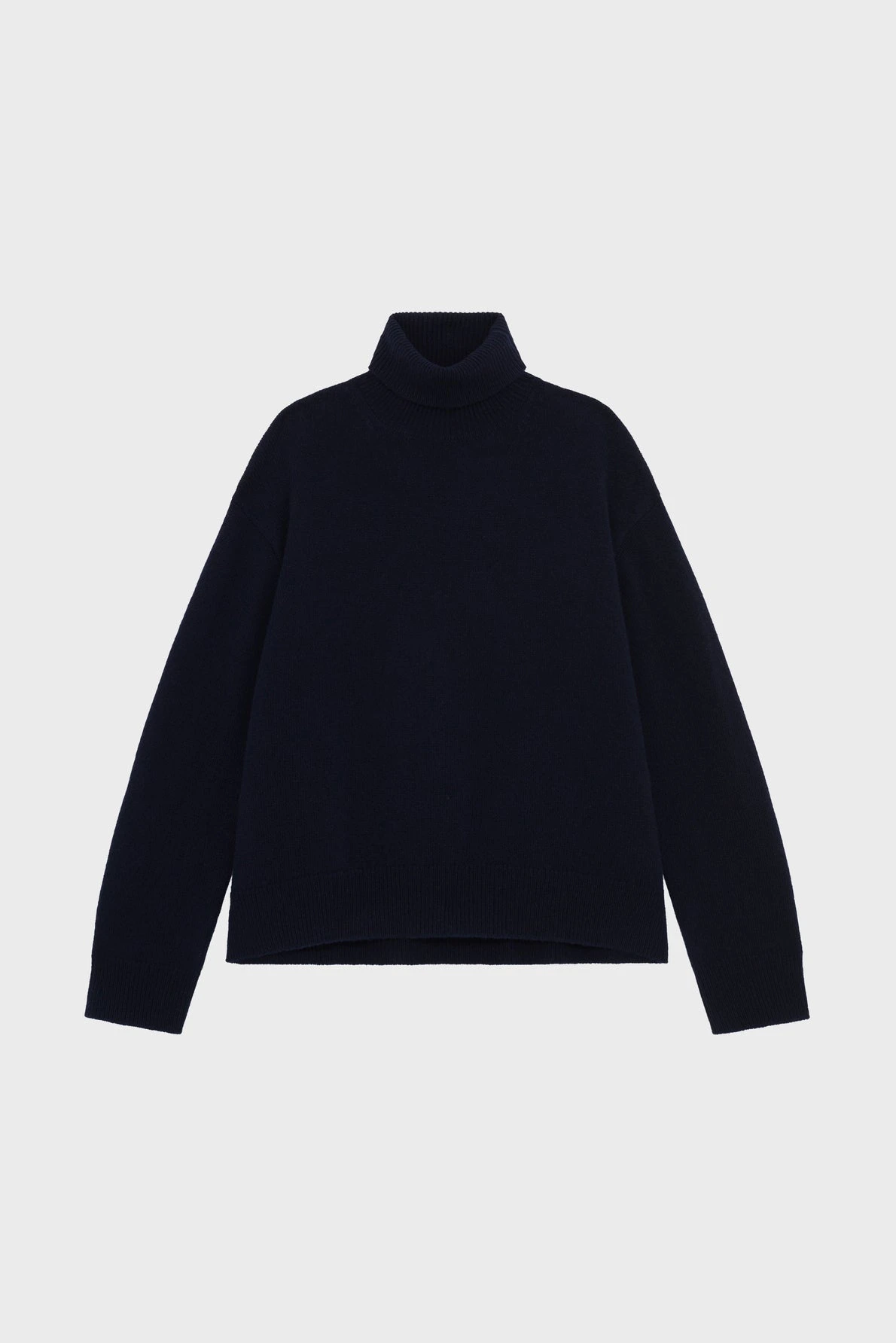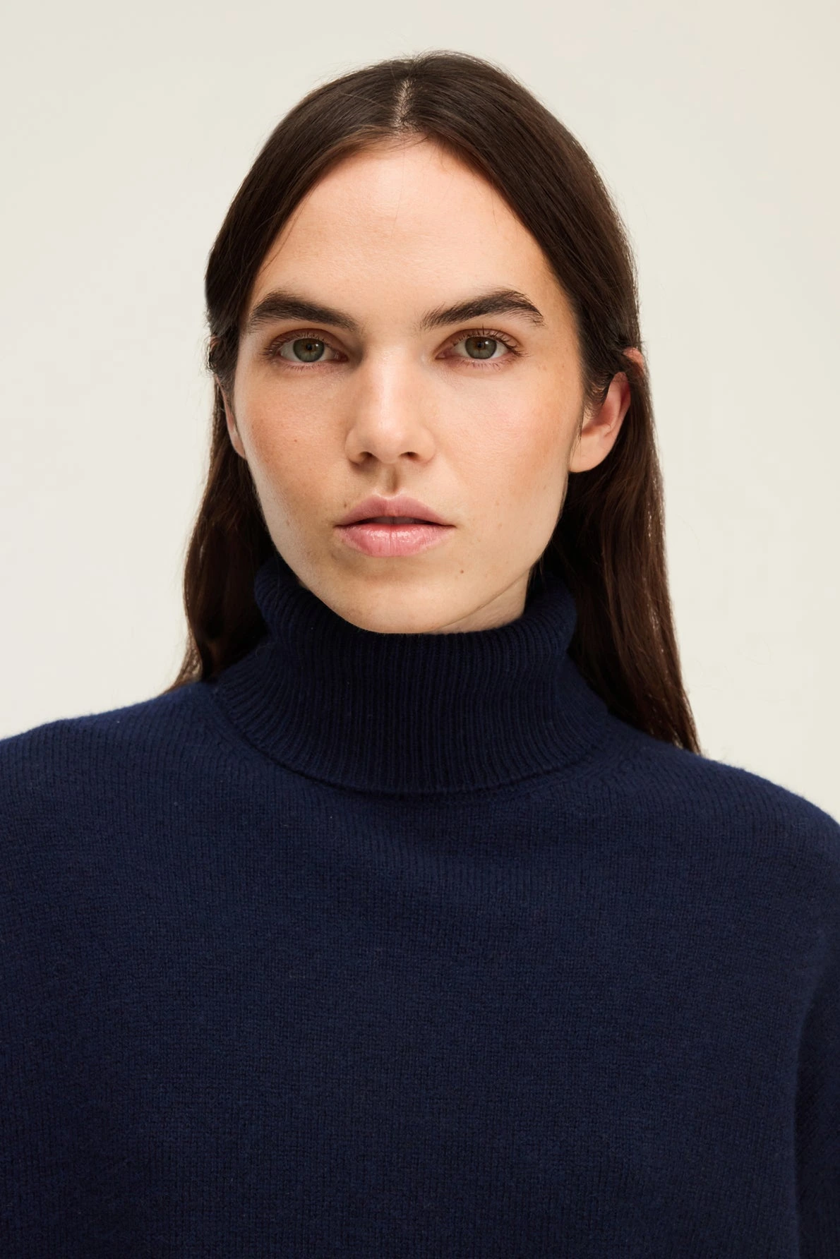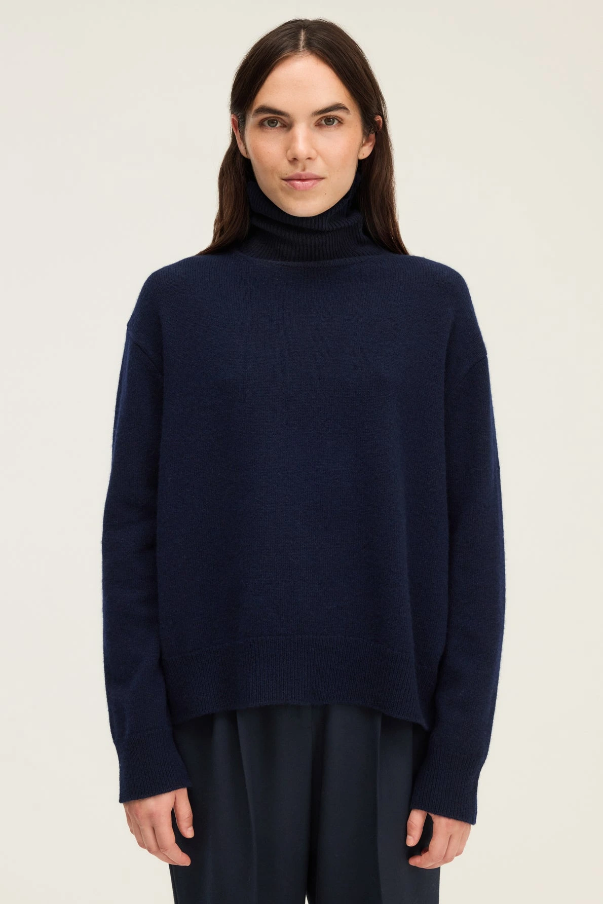 Le pull à col roulé en laine Evana est l’allié du plein hiver. De coloris bleu marine, au volume ample et épaules tombantes, il offre un look chic et contemporain. Confectionné en 100% laine.