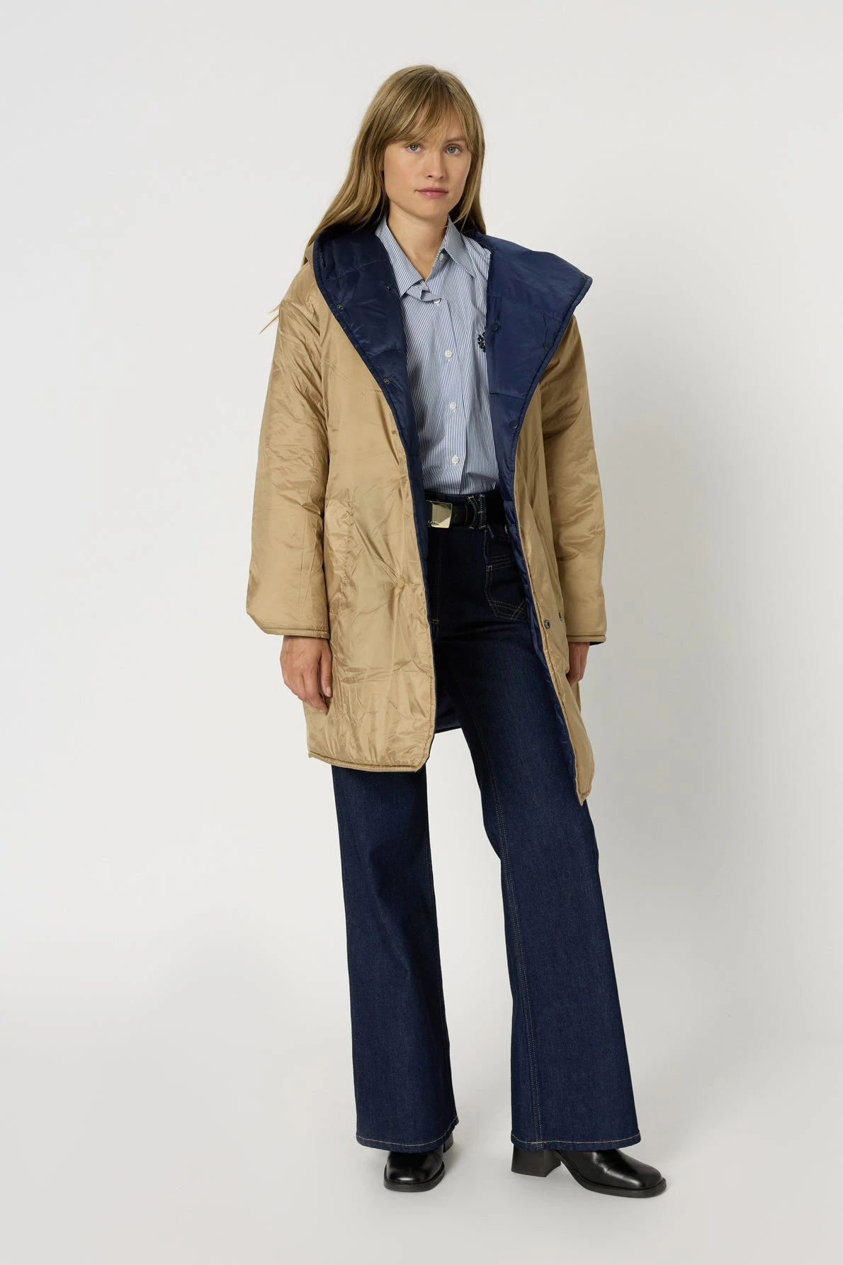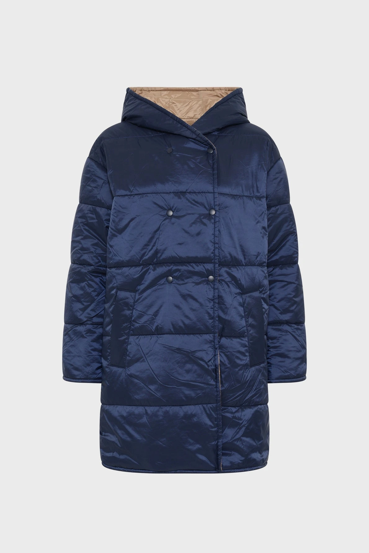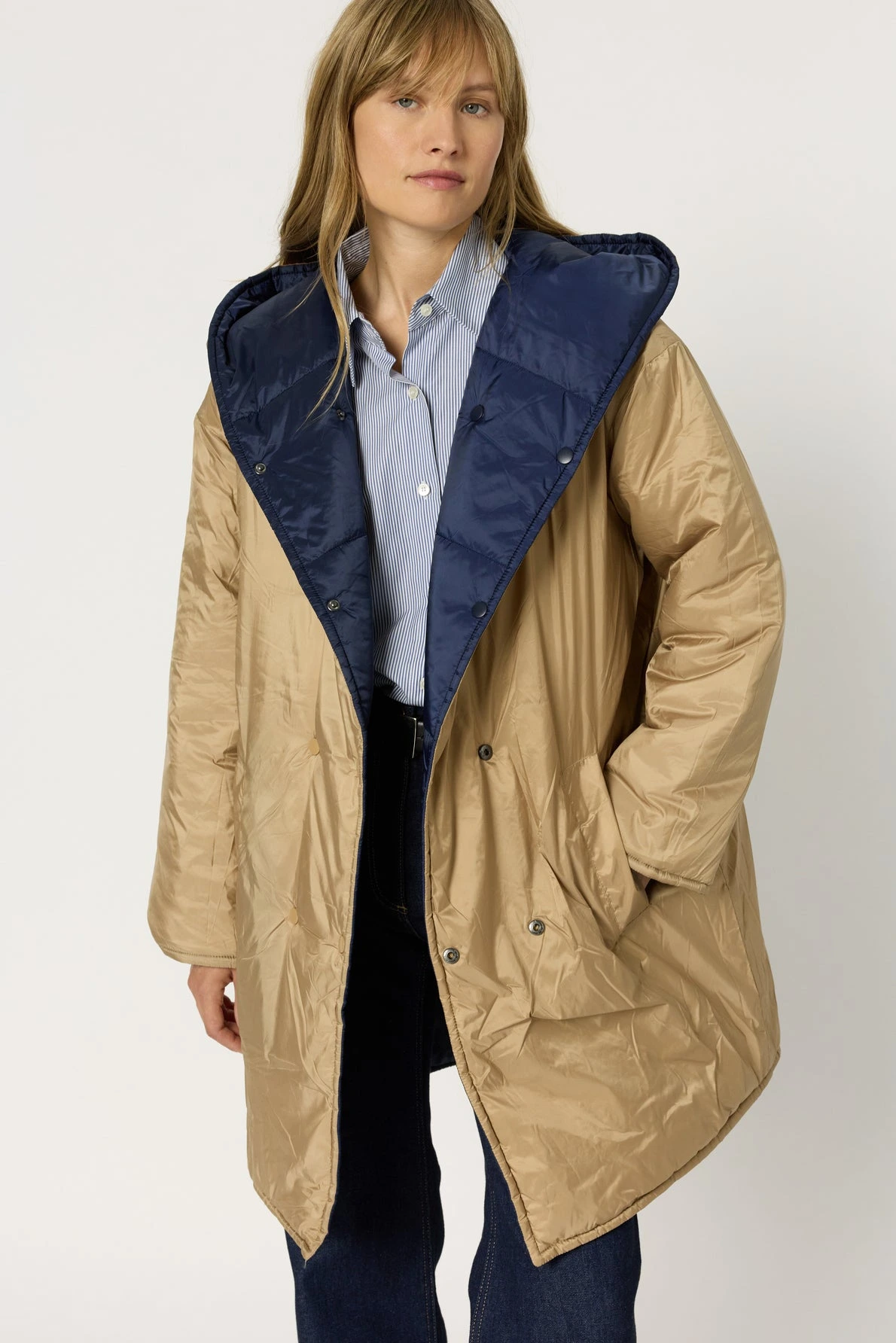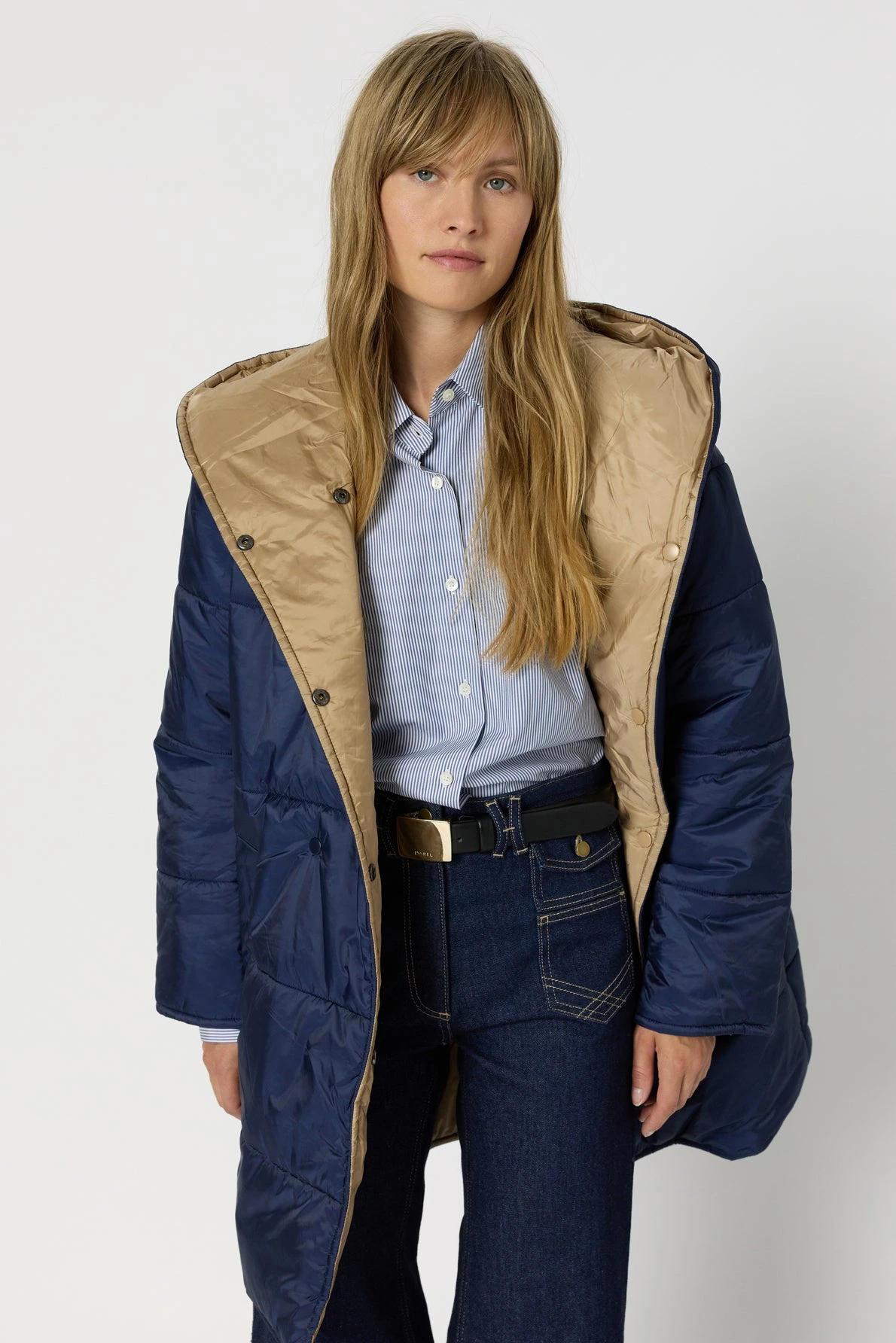 La doudoune à capuche réversible Matilde se distingue par son boutonnage croisé et sa matière à l’aspect satiné. Elle se portera côté bleu électrique ou camel selon les envies. Sa forme enveloppante en fait une pièce idéale pour le plein hiver.