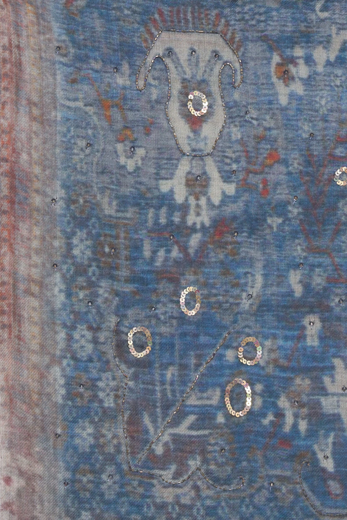Echarpe à motifs indiens brodés de sequins. Confectionnée en laine et soie.