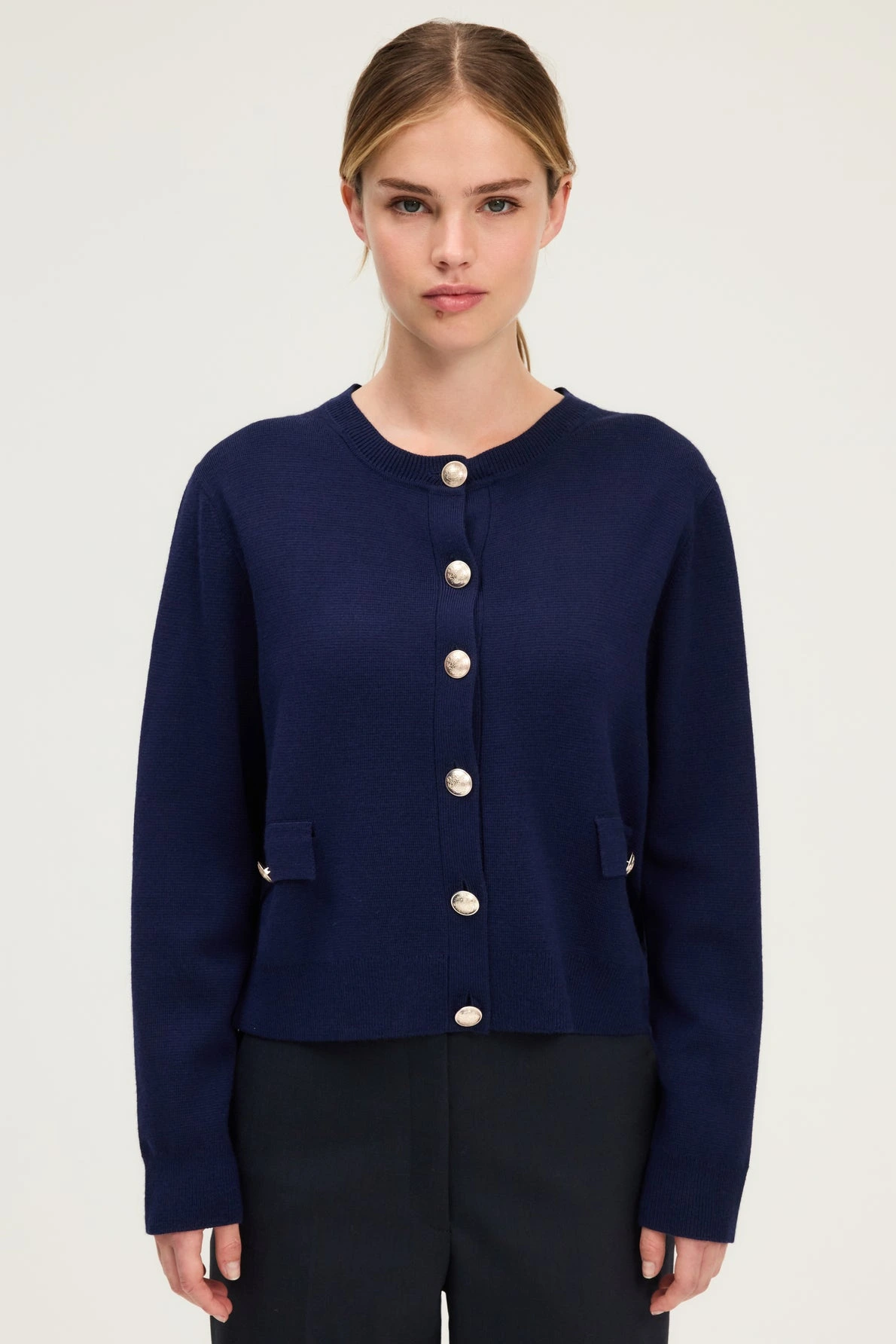 • Gilet fermé par des boutons ronds argentés gravés
