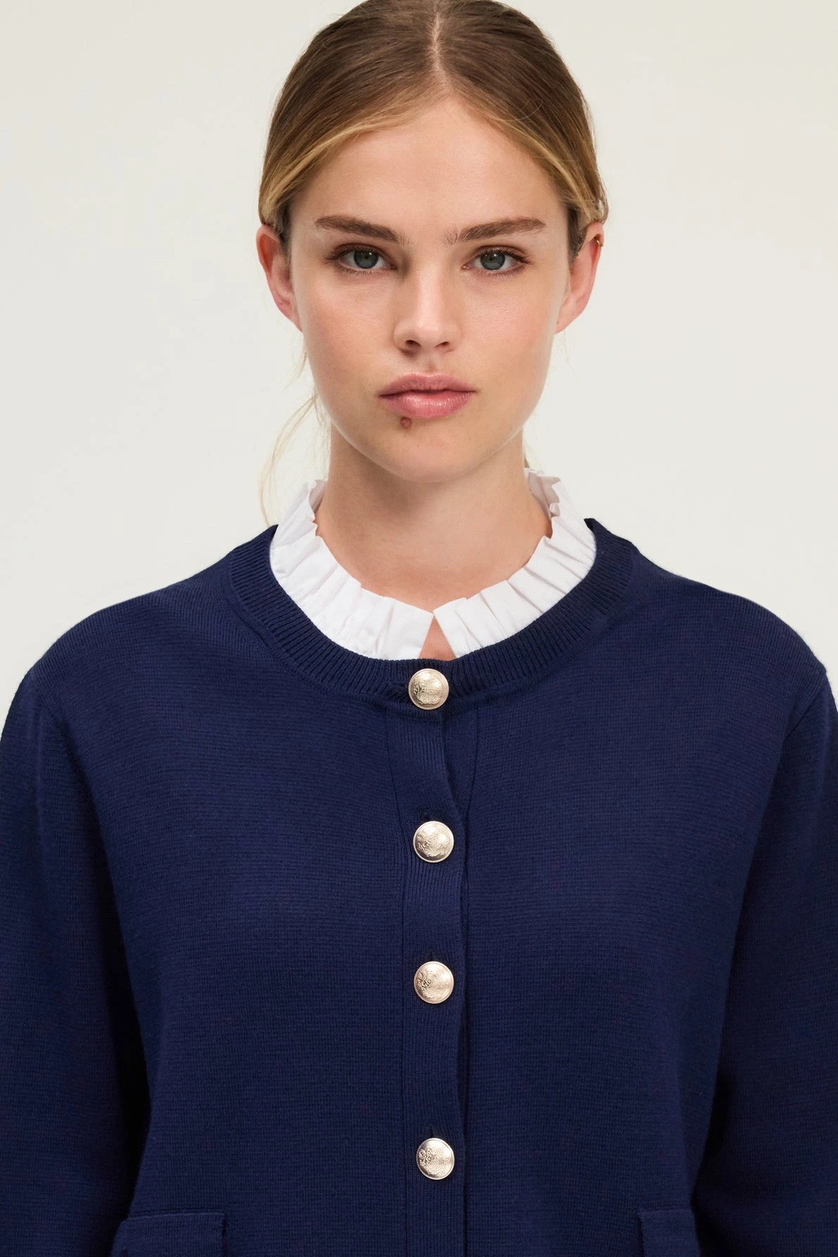• Gilet à col rond orné d’un col plissé façon chemisier