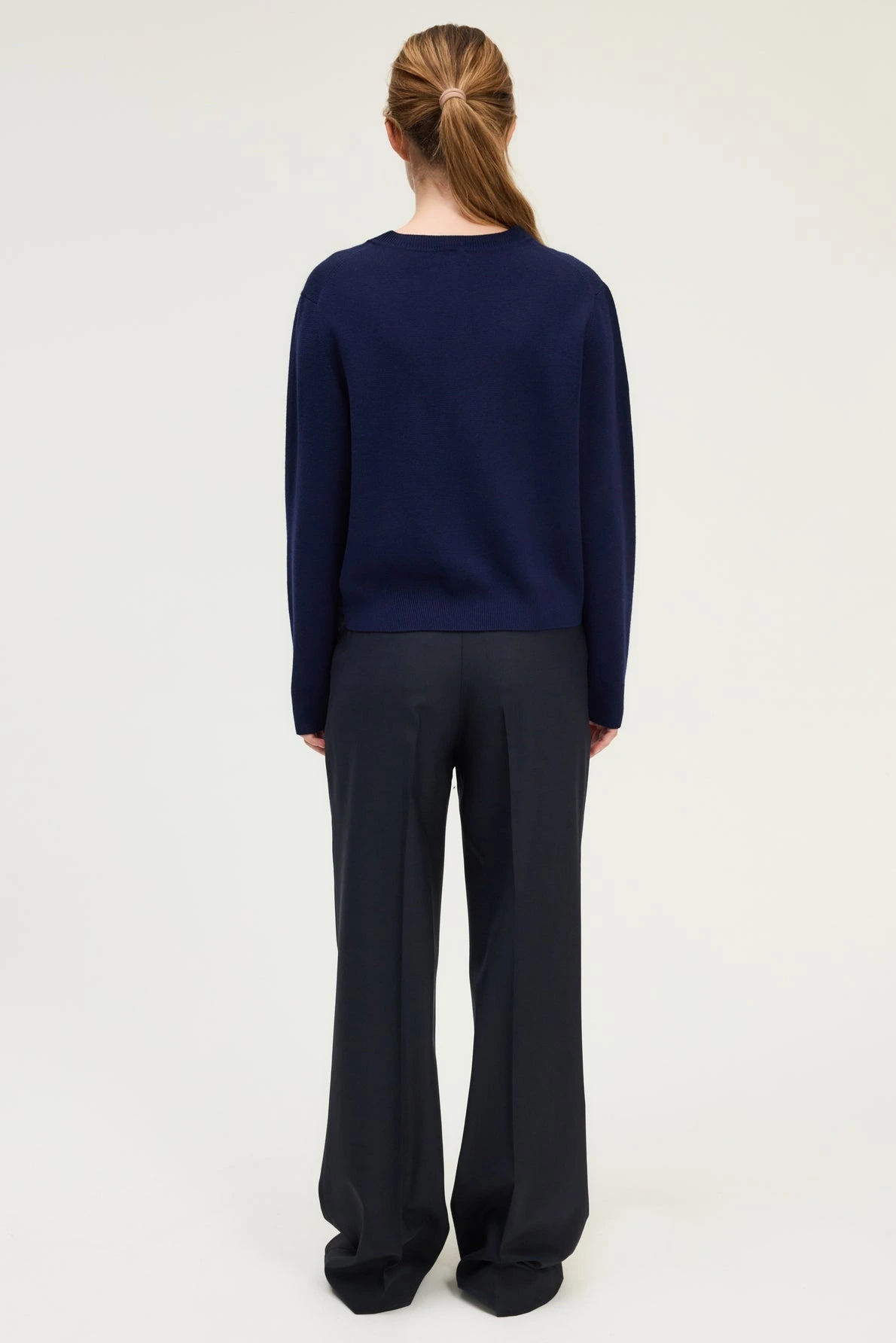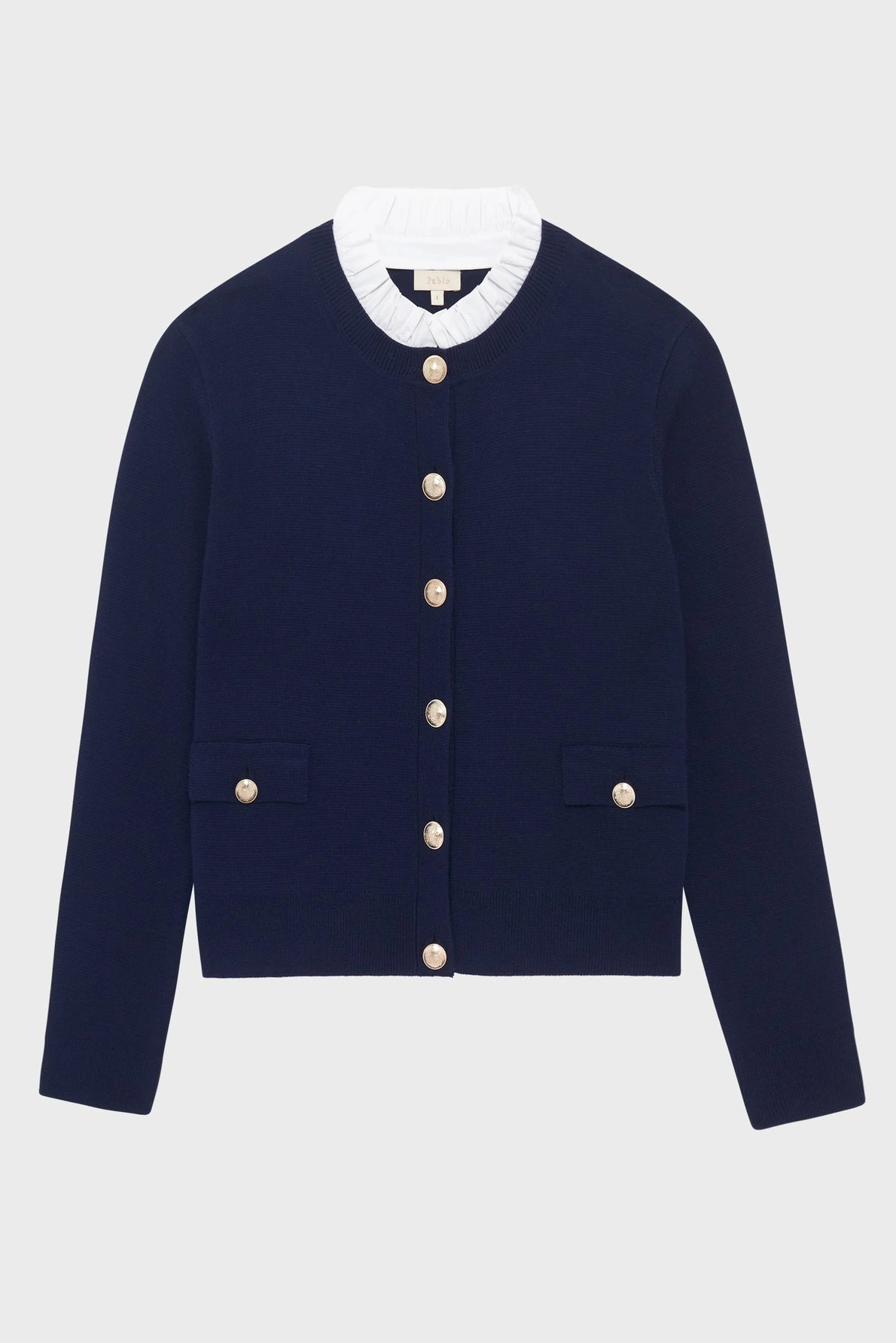 Gilet à col façon chemisier bleu marine orné d’un col blanc dans un esprit chemisier. Confectionné en laine mélangée. Col amovible.