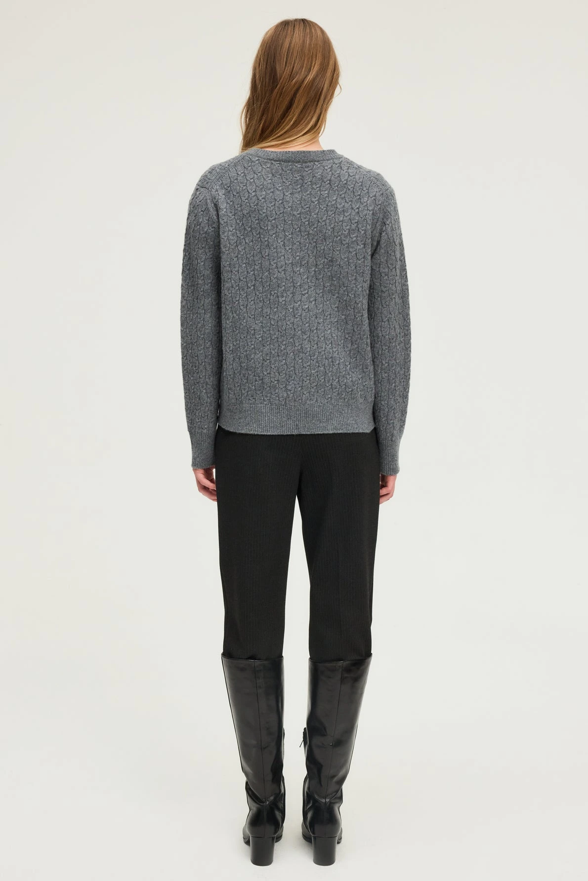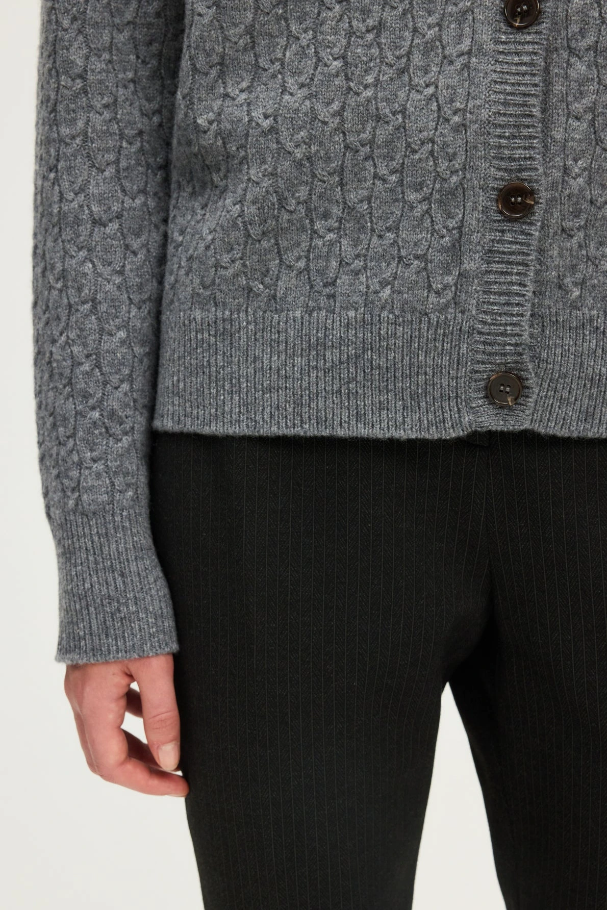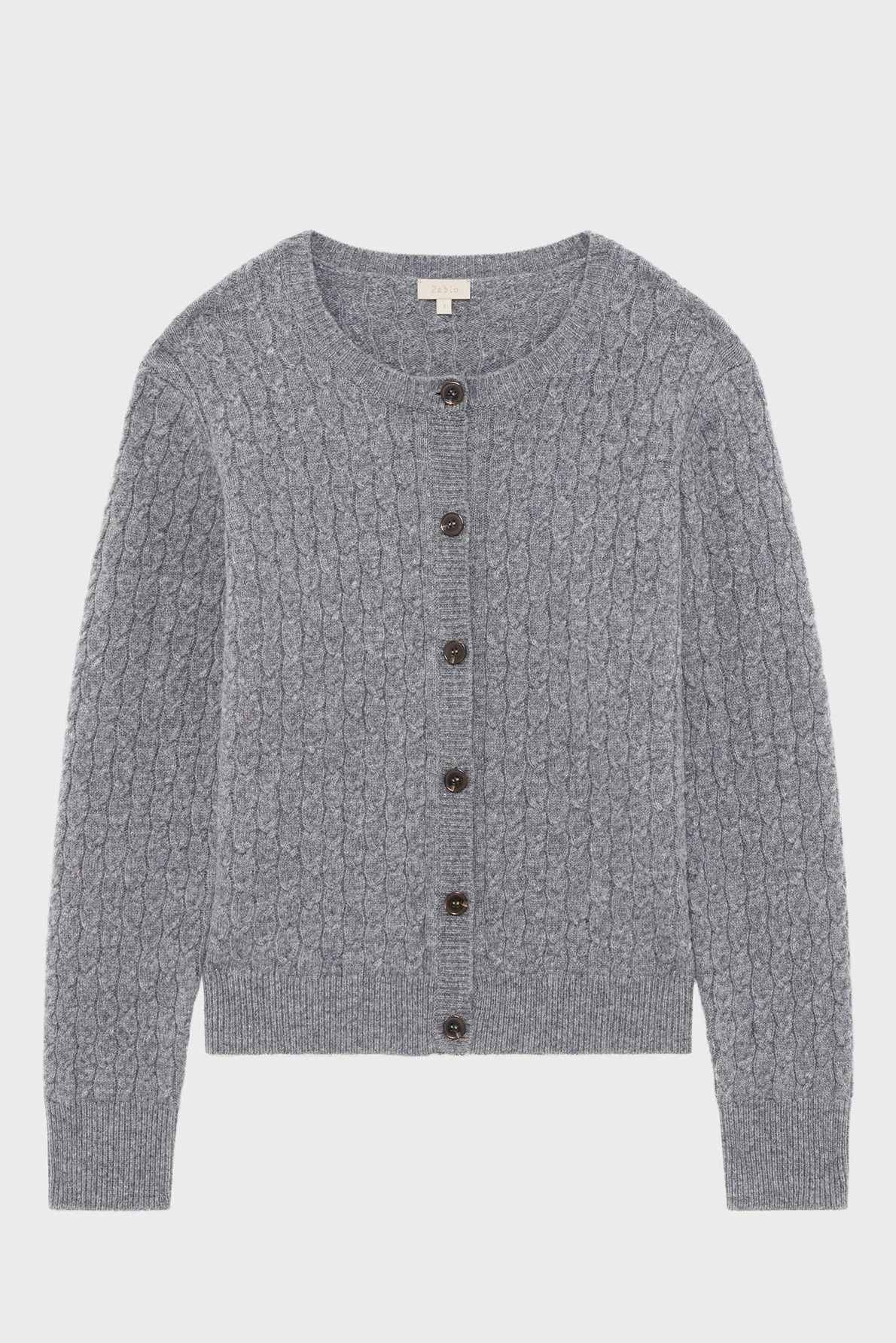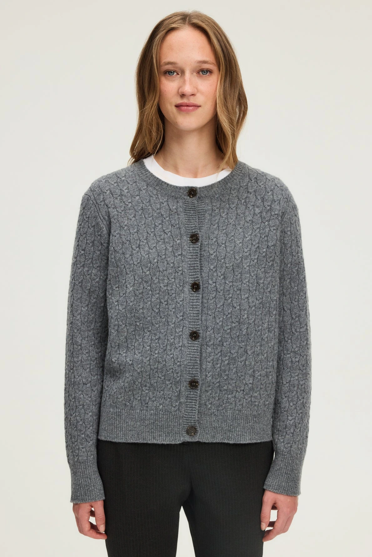 Gilet à torsades à la fois chic et casual. Confectionné dans un coloris gris intemporel, il sera facile à porter avec une robe ou un pantalon. 100% laine.
