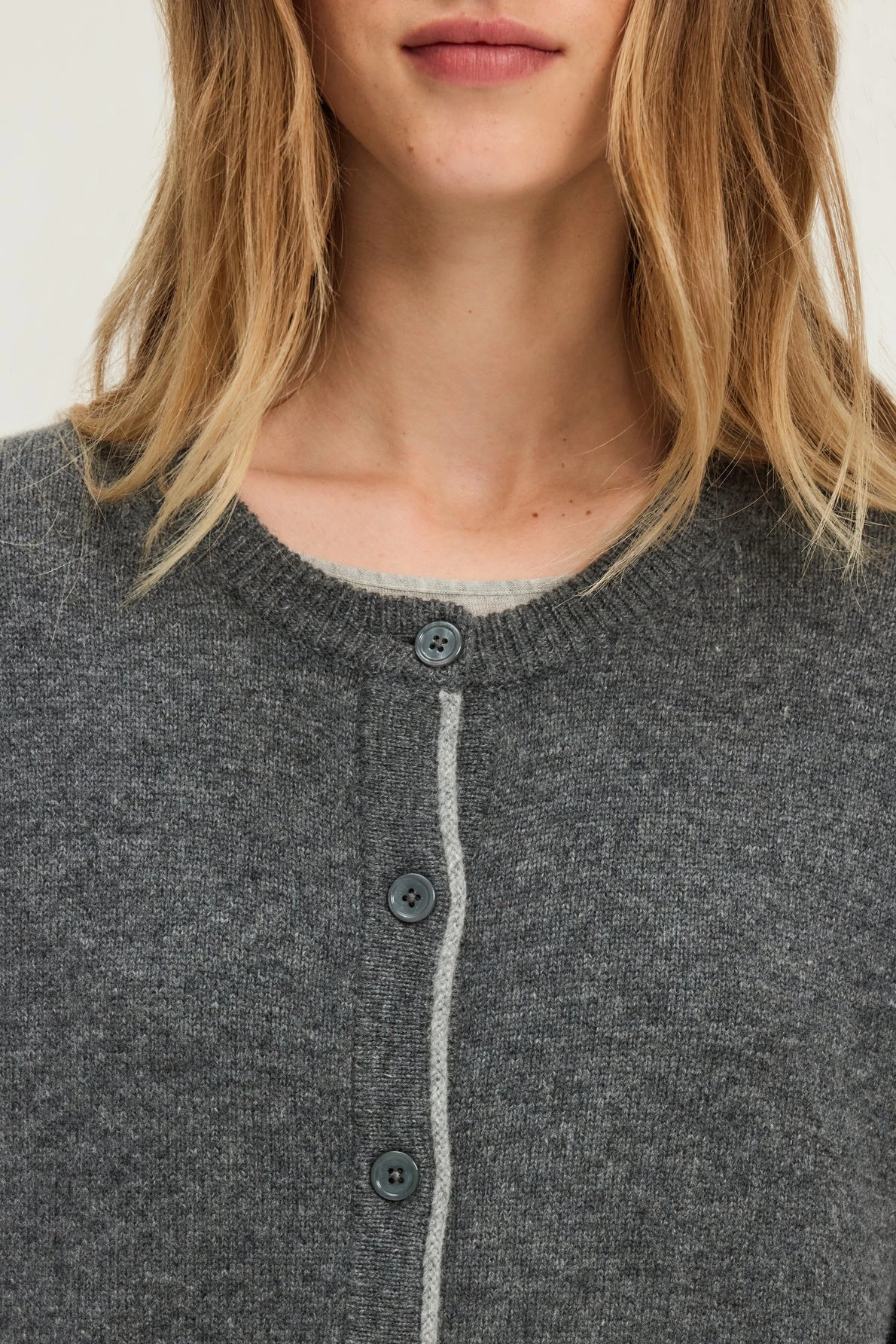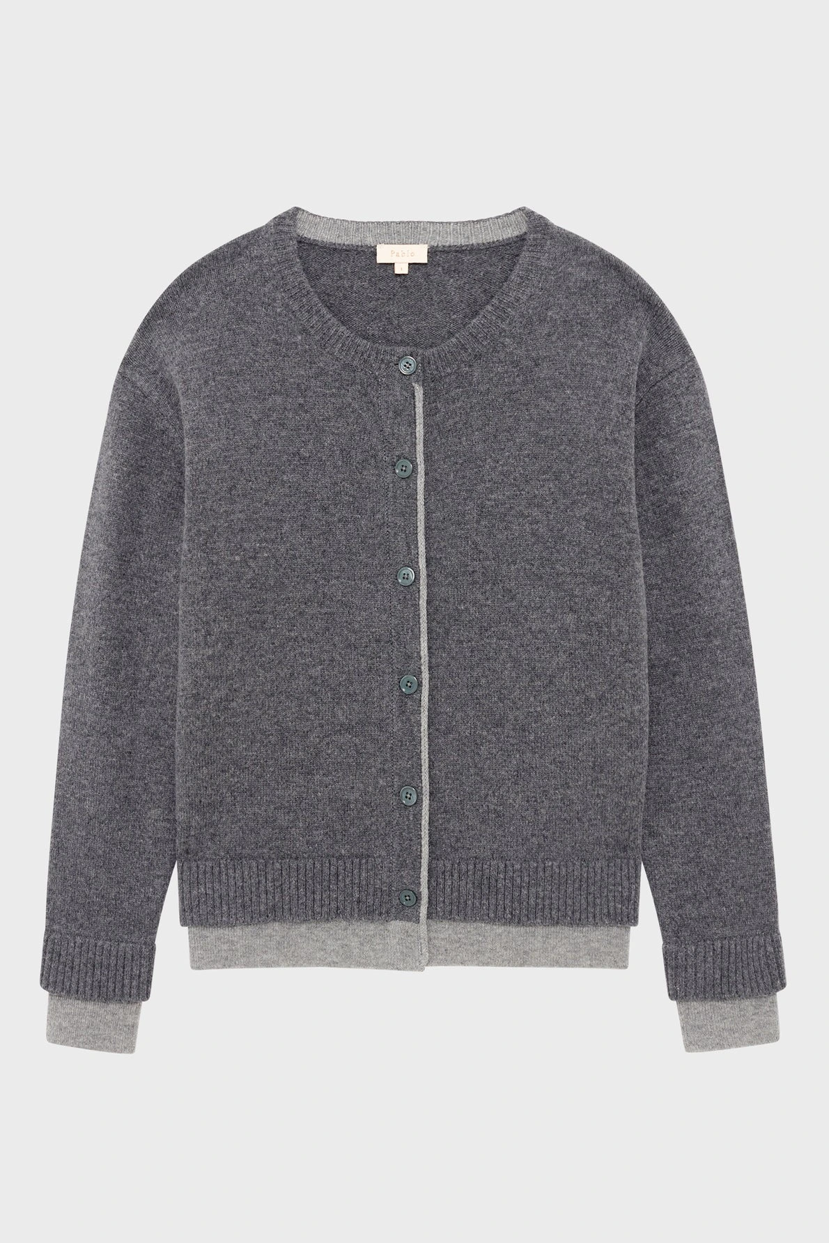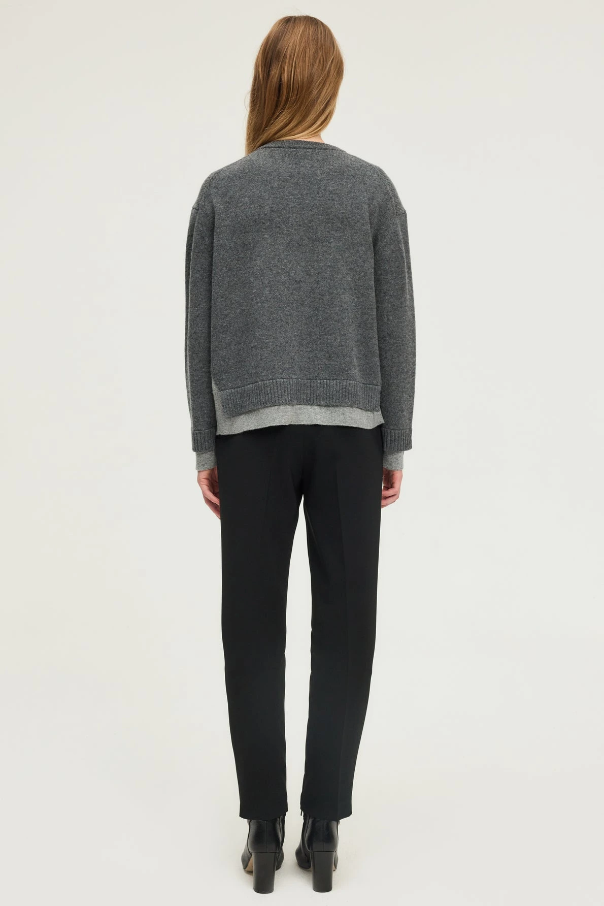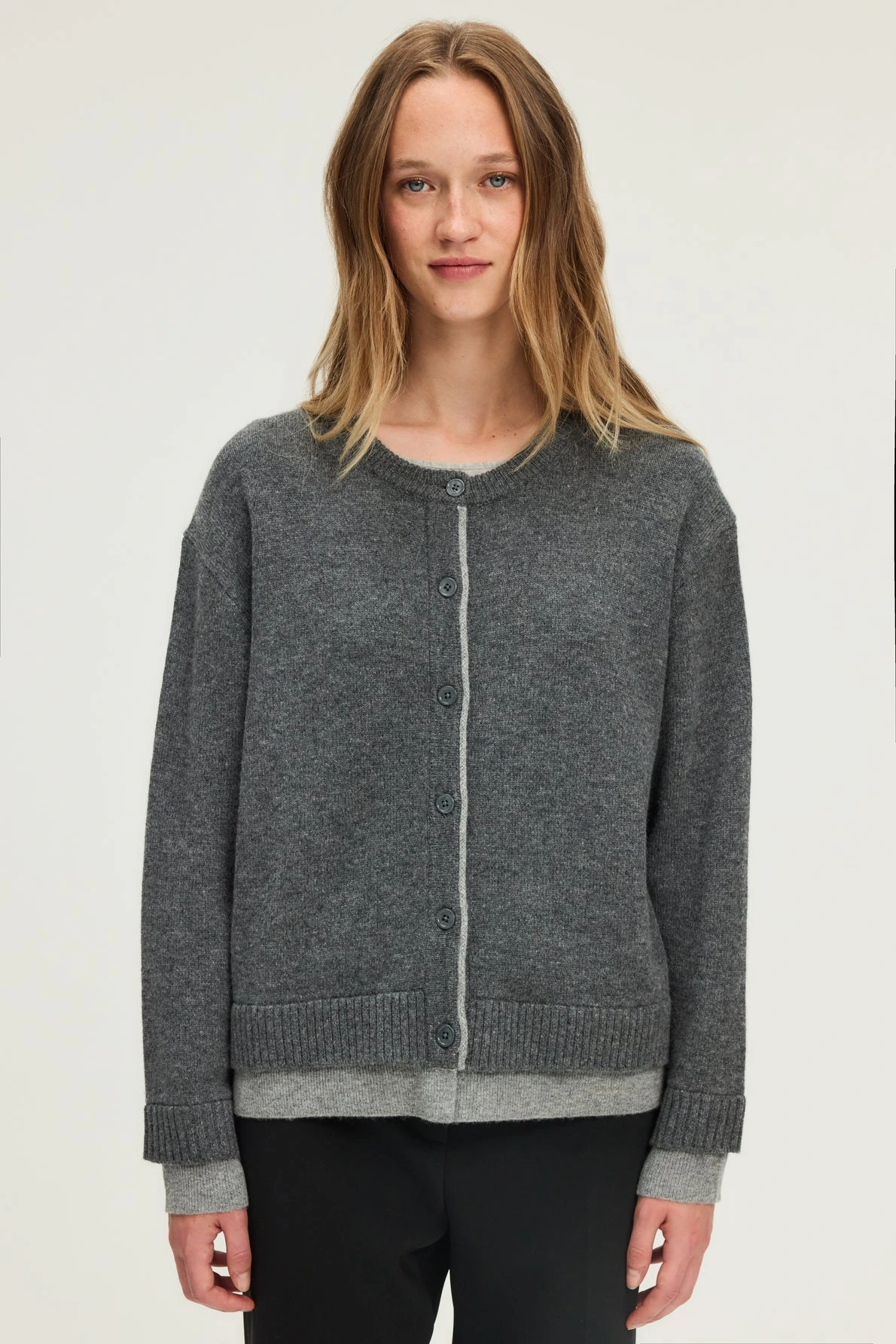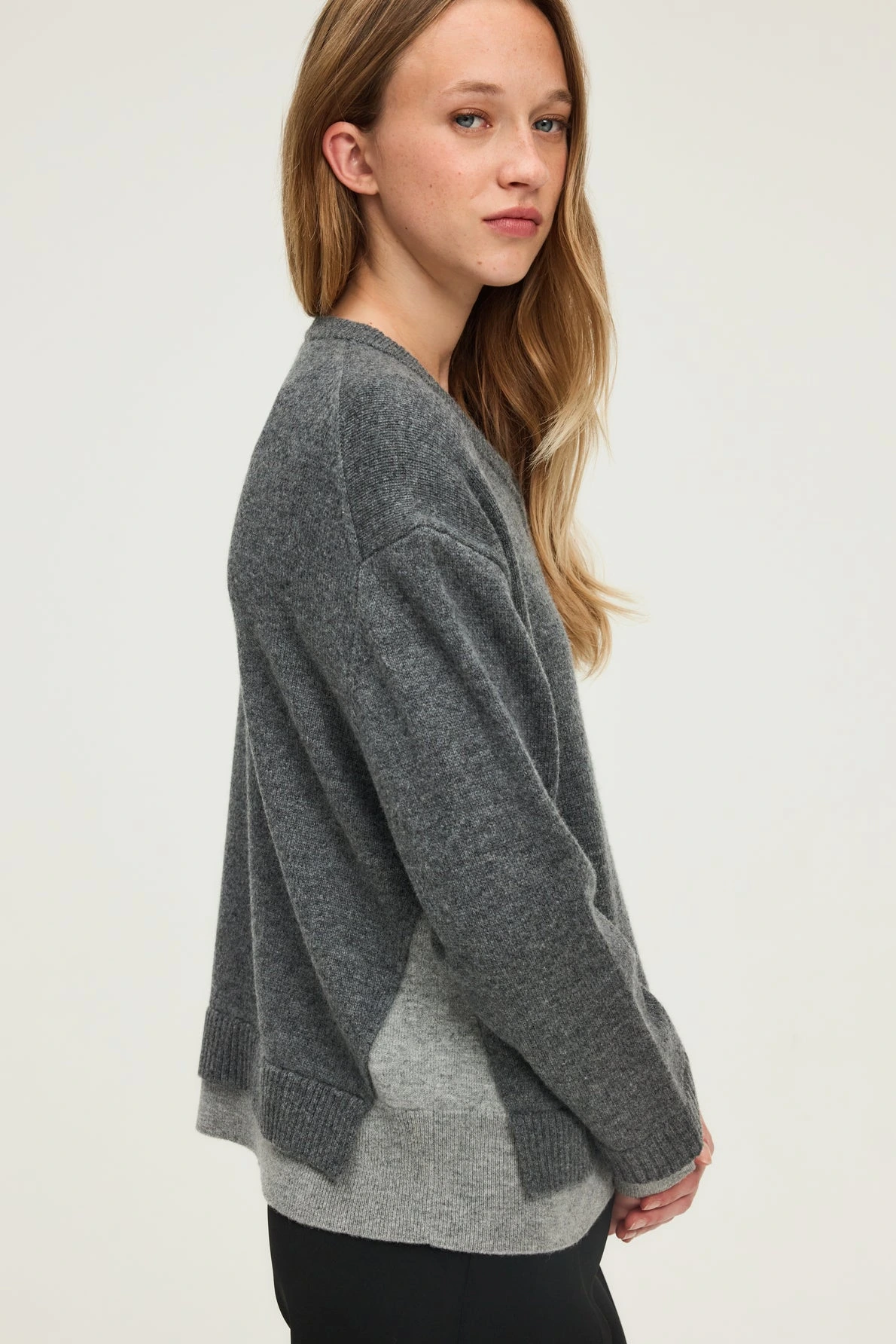 Gilet bicolore en laine dans des teintes de gris, avec un effet de superposition dans le bas des manches et le bas du gilet. 100% laine.