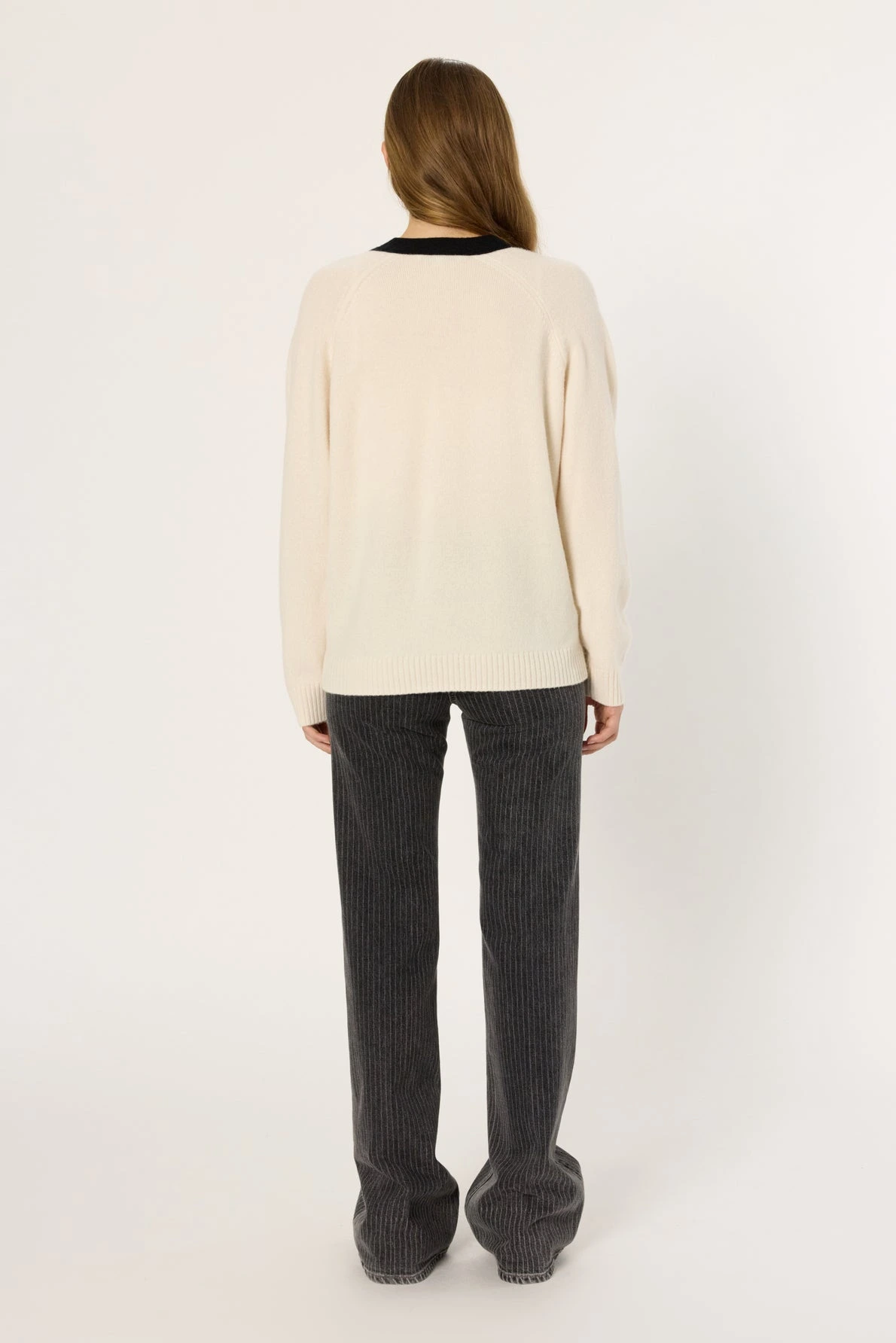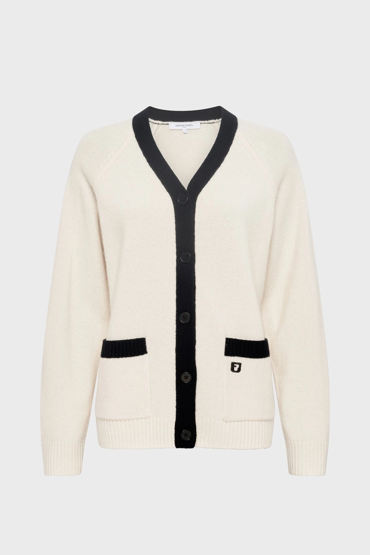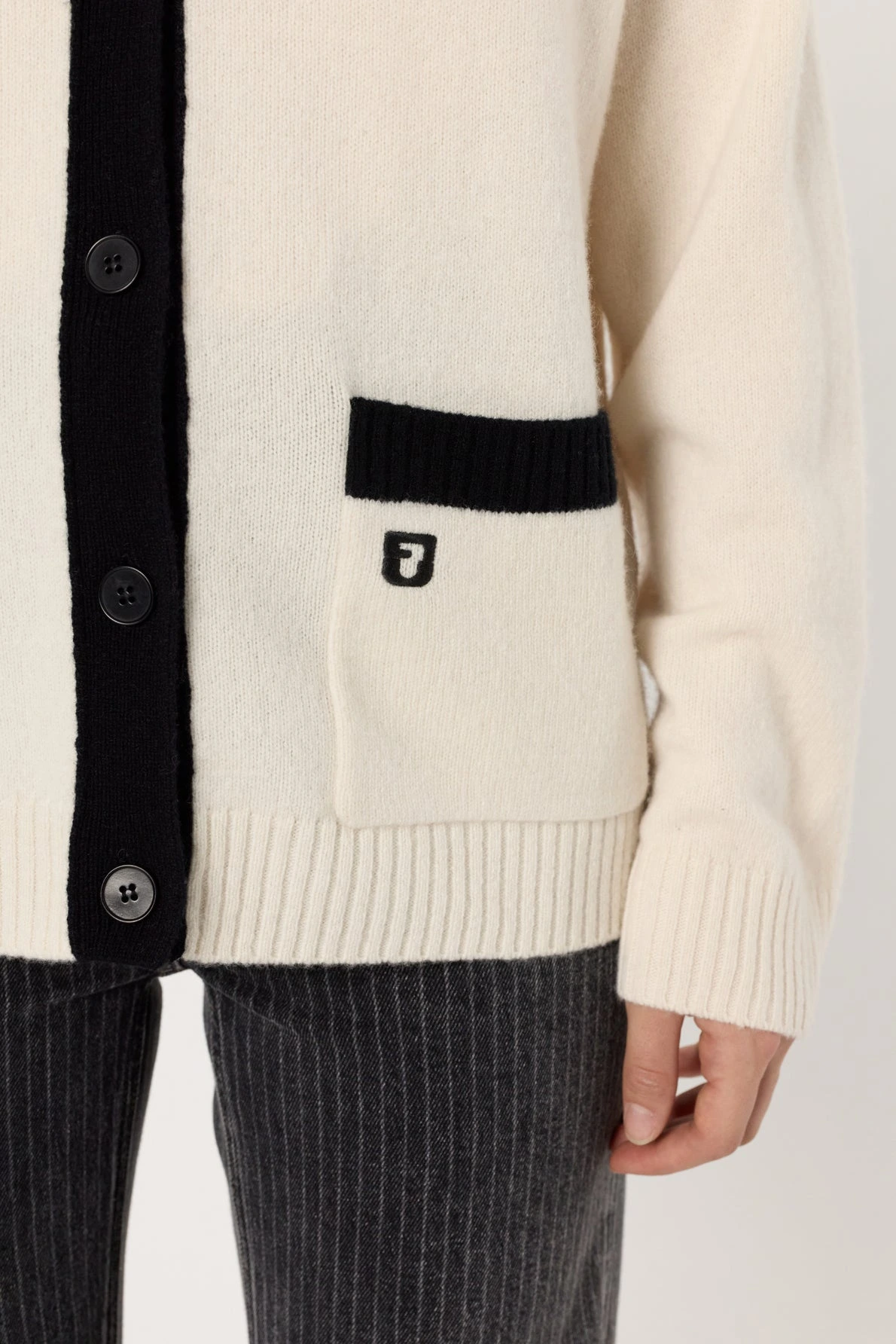 Gilet bicolore blanc rehaussé de noir, de forme ample pour jouer le côté masculin féminin. Confectionné en 100% laine au toucher très doux. A porter sur une chemise ou à même la peau dans un esprit sensuel.