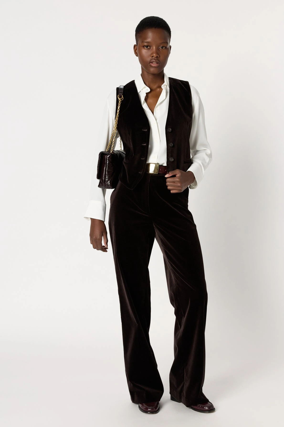 Le gilet de tailleur sans manche, pièce inspirée du vestiaire masculin, est décliné en velours ras marron. Porté avec une chemise blanche et le pantalon assorti, il donnera à la tenue une allure chic et délicieusement vintage.