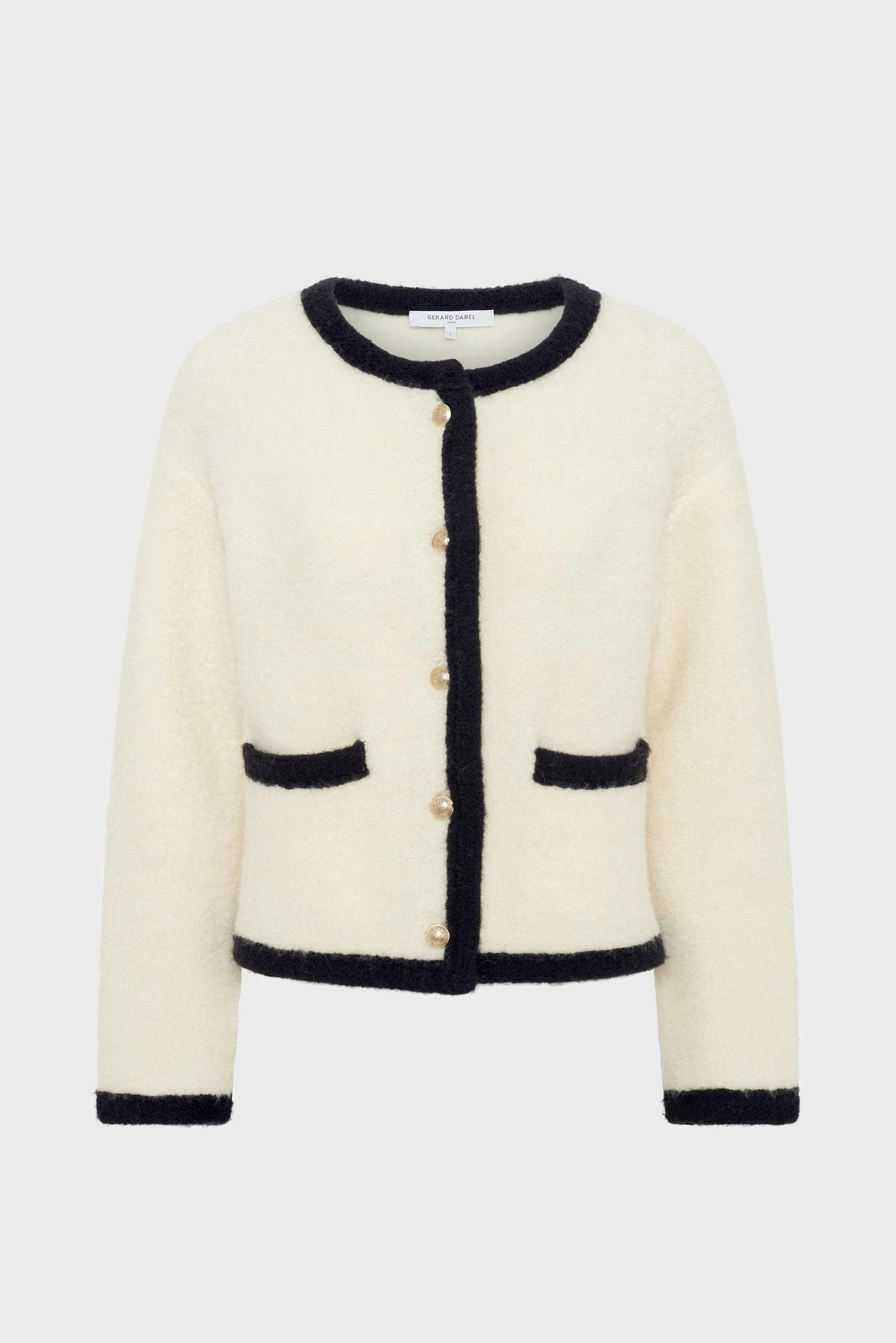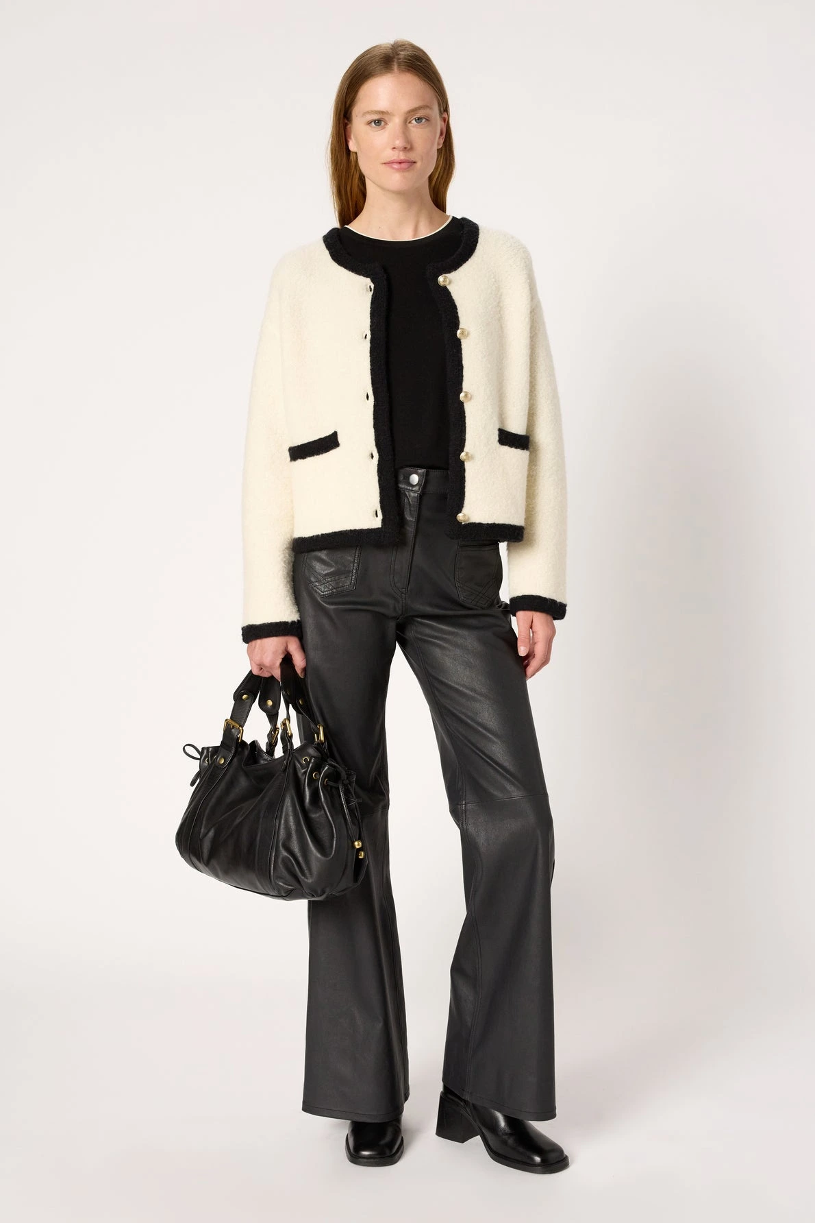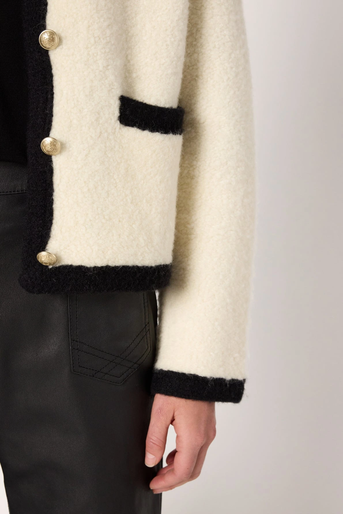 Esprit cocooning chic pour ce gilet en bouclette blanc et noir à boutons argentés. Confectionné en laine mélangée à l’effet bouclette.