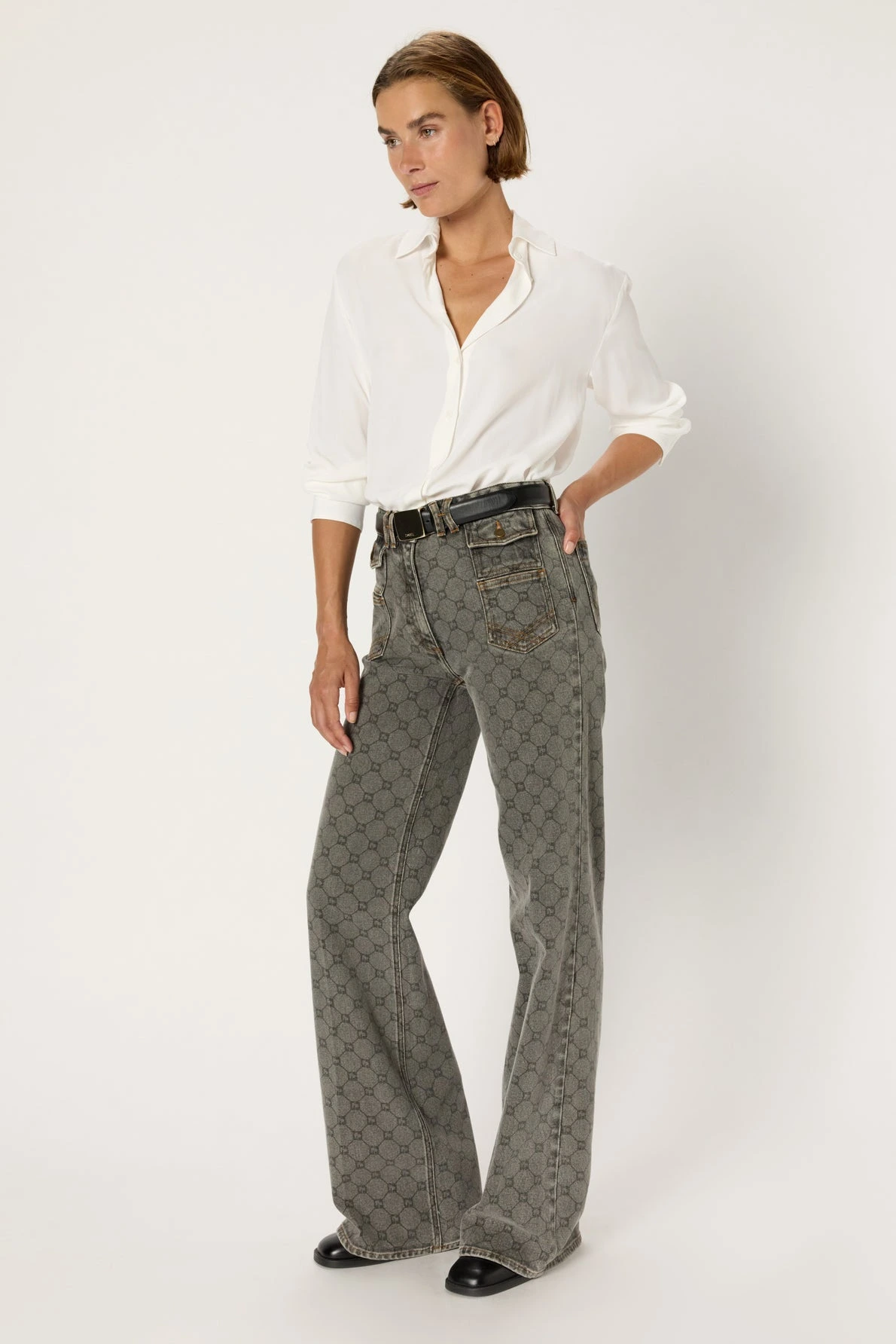 Jean flare ANNA, modèle iconique de la maison Darel, décliné avec le monogramme GD en all-over.