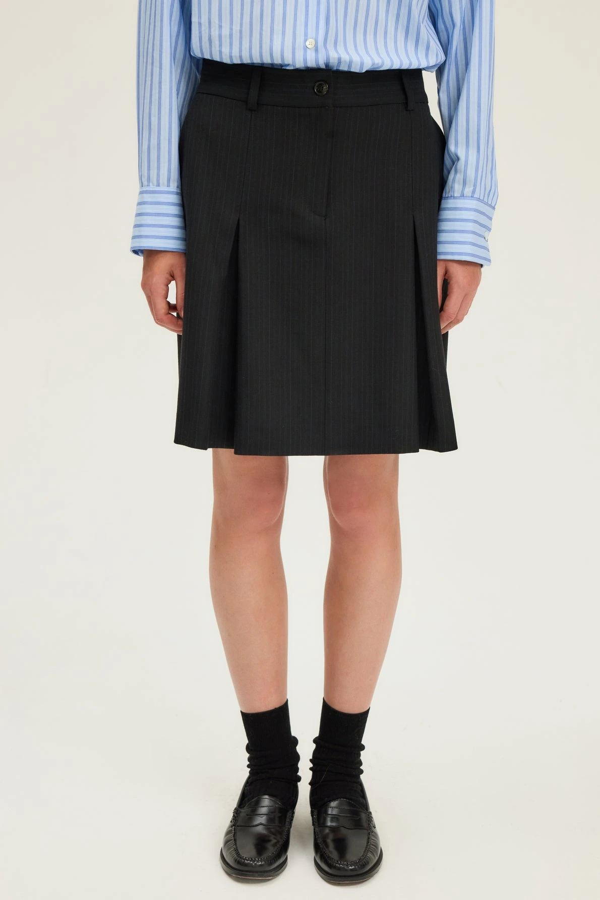 Esprit preppy pour cette jupe courte plissée, ornée de fines rayures bleues sur fond noir. A porter avec le gilet et la veste de tailleur assortis pour un look tailleur.