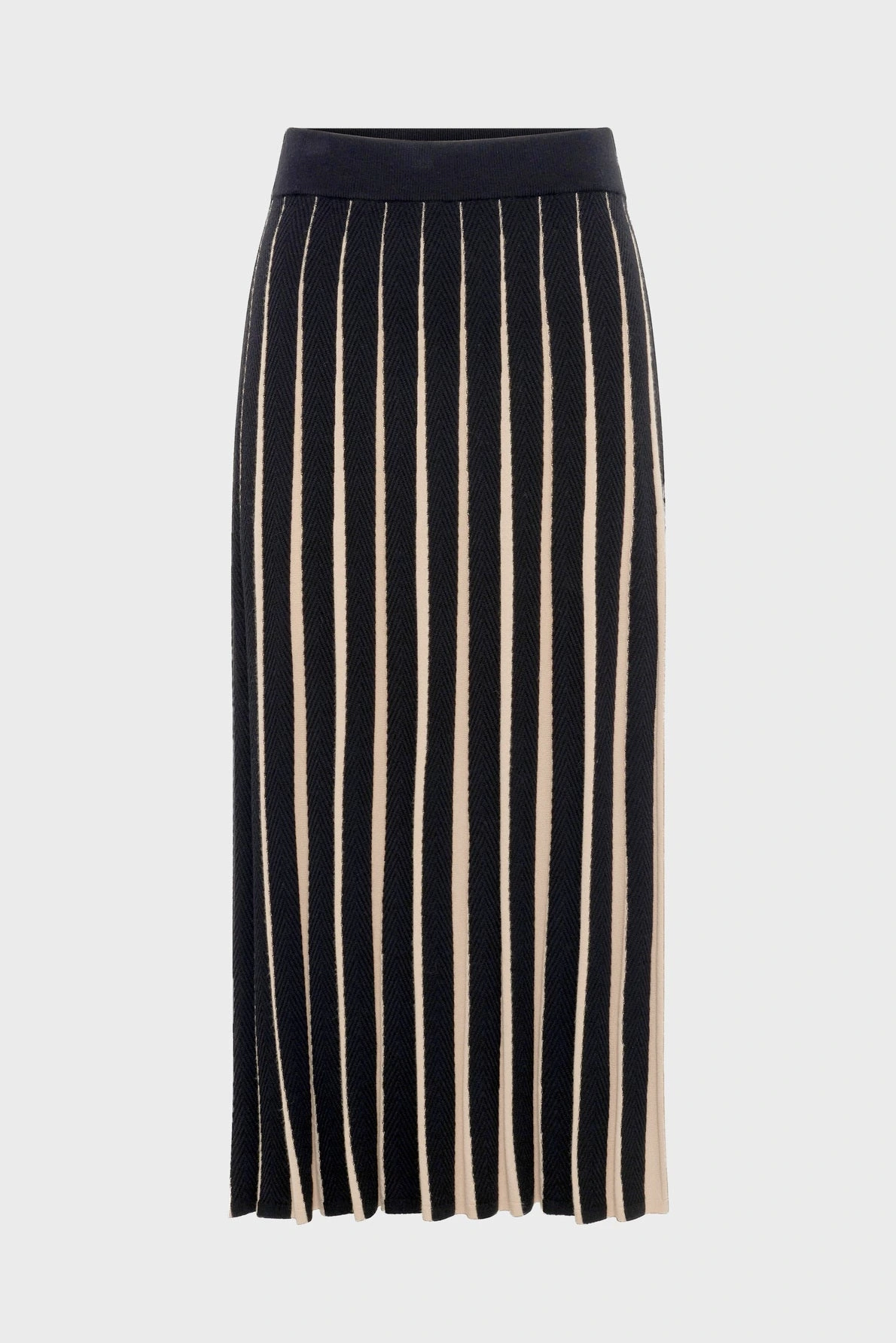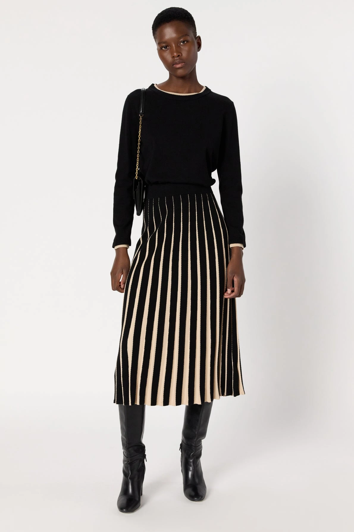 La jupe en maille plissée Bibiane se démarque par son plissé bicolore pour un effet rayé graphique. Elle alterne maille unie écrue et maille à chevrons noire. A porter chic avec une chemise, ou casual avec un pull en cachemire.