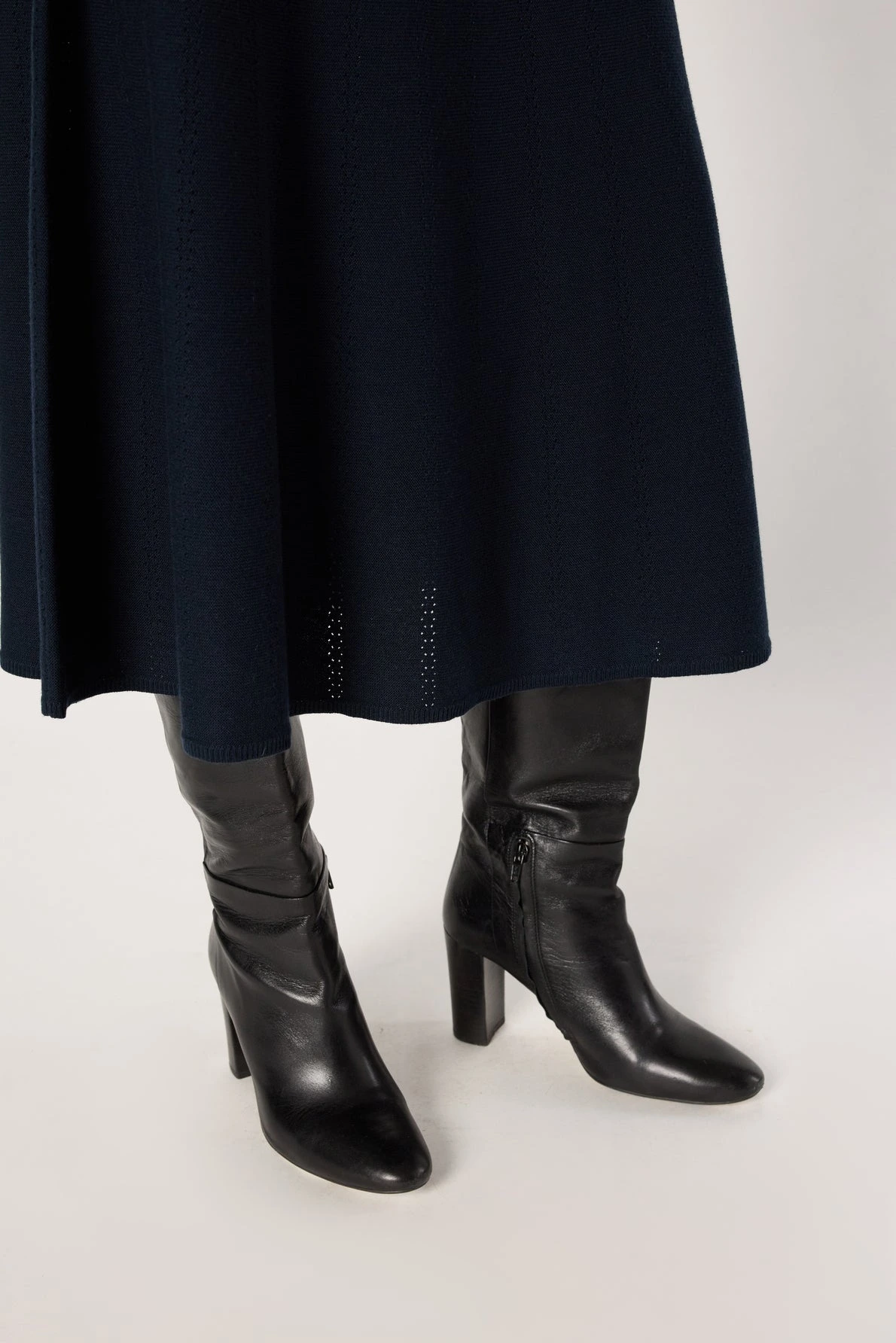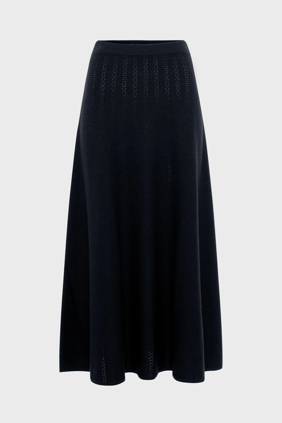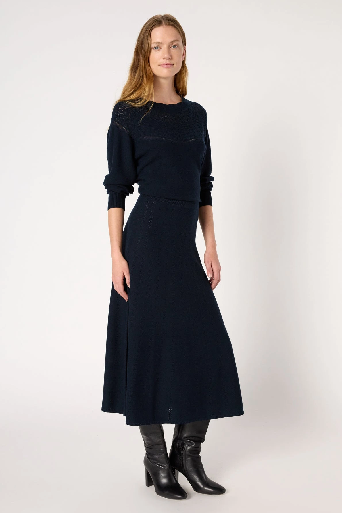 Jupe mi-longue en maille bleu marine, agrémentée d’un délicat jeu d’ajourés. Confectionnée en laine mélangée.