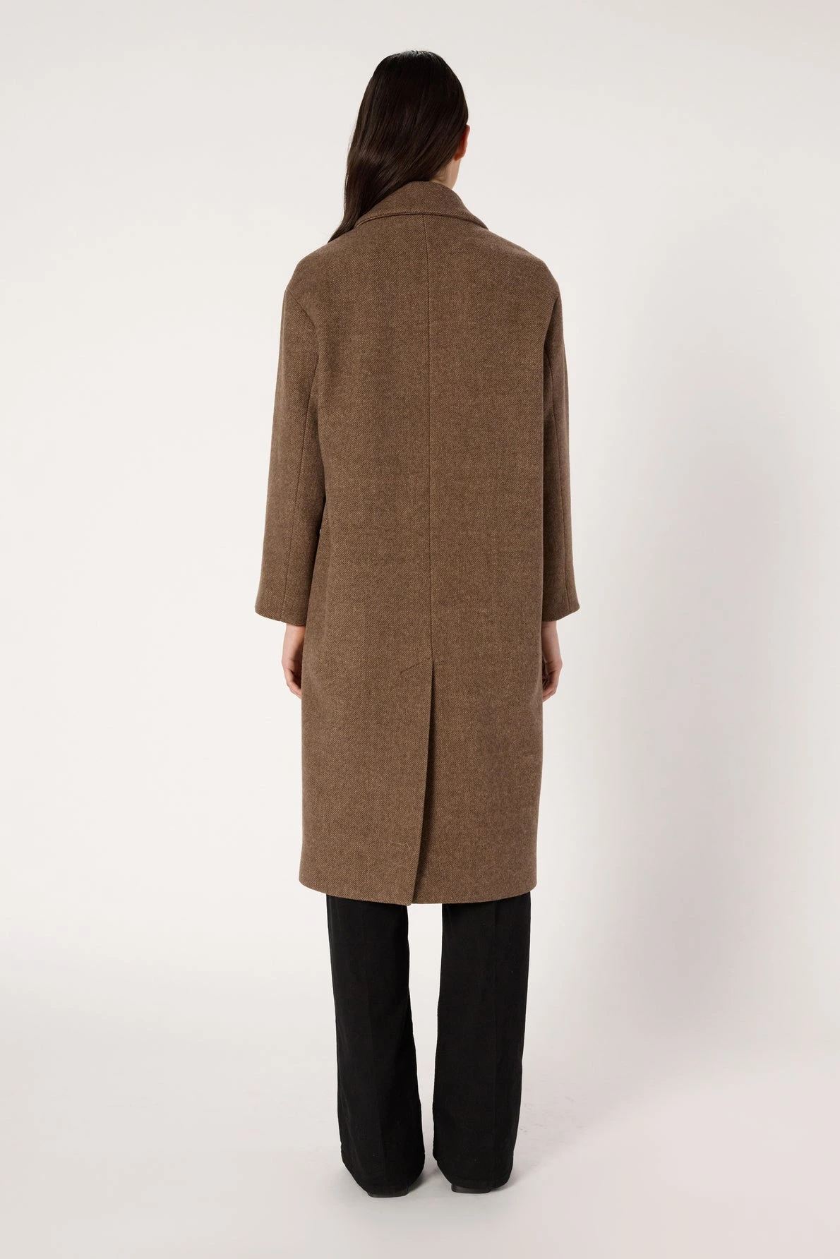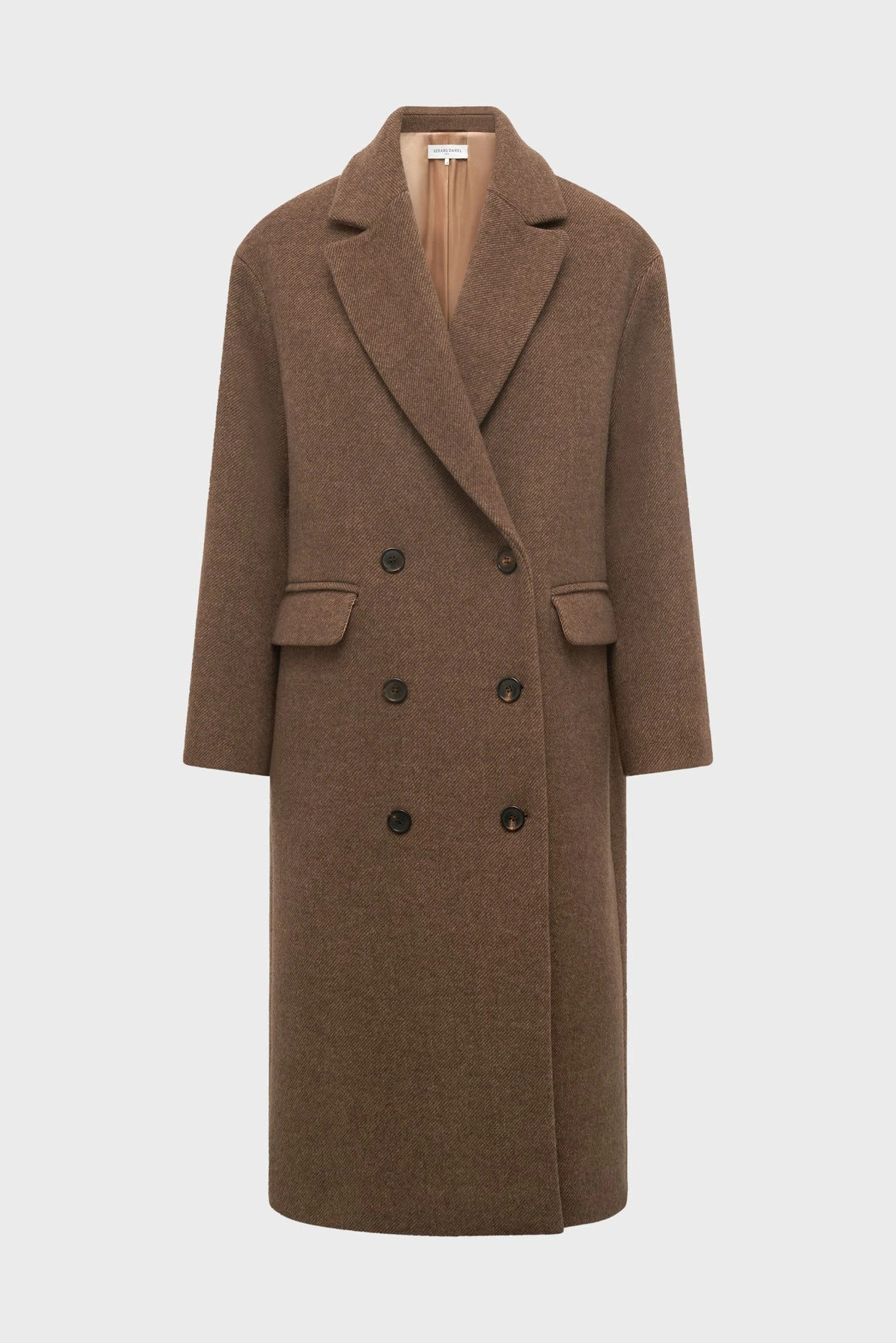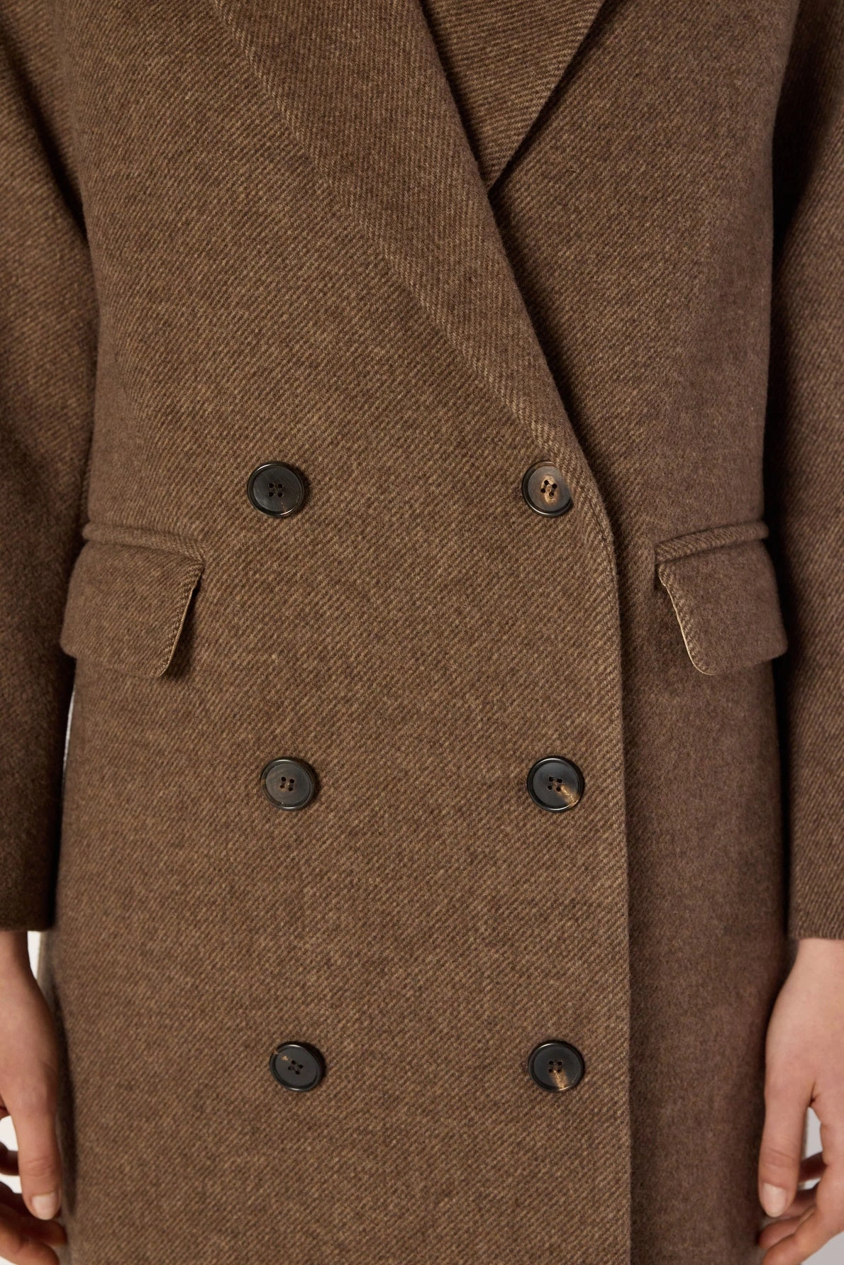 Allure chic et atemporelle pour ce manteau croisé en laine sergée mi-long  et à la stature arrondie. Il est confectionné en laine mélangée sergée dans un coloris marron taupé.