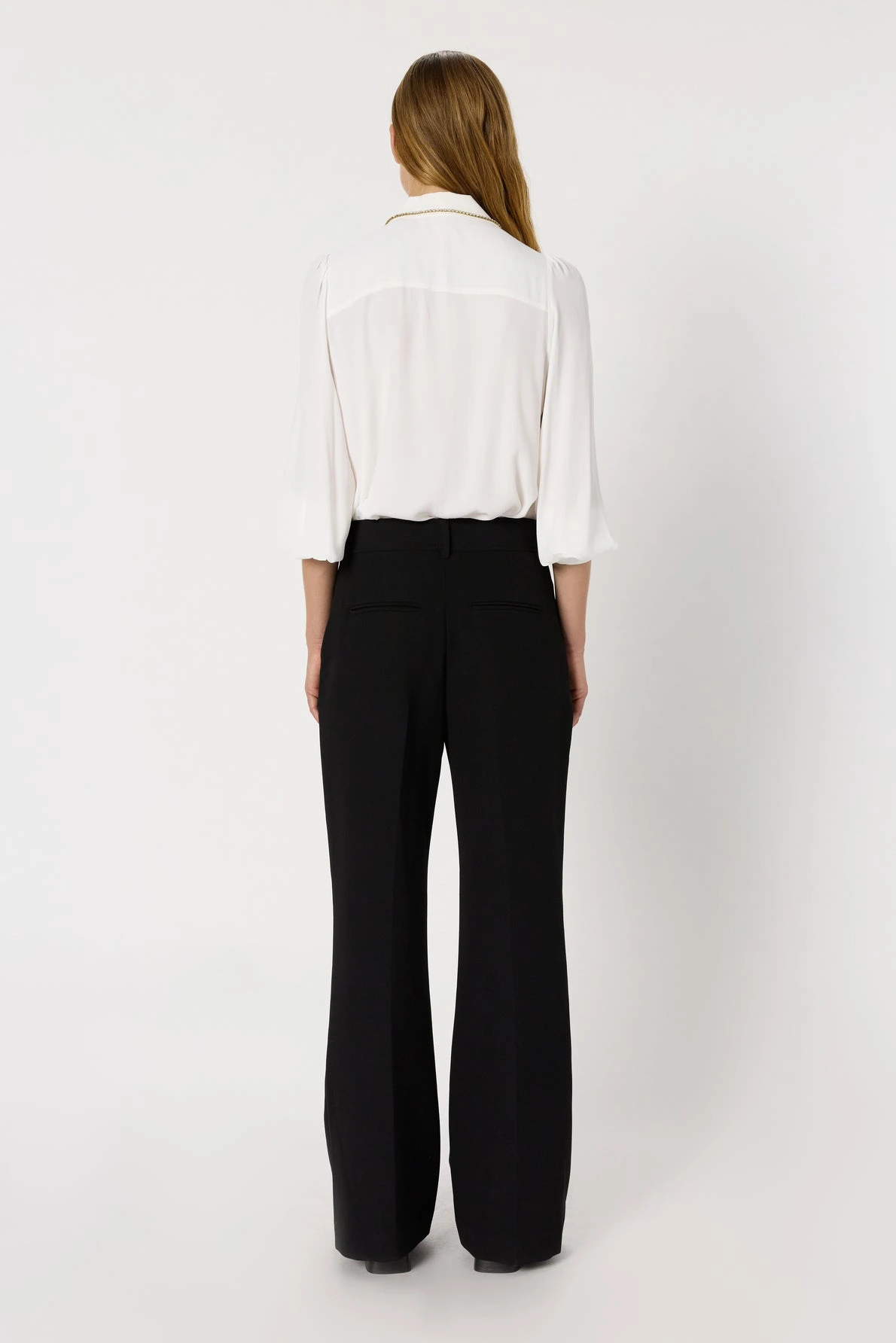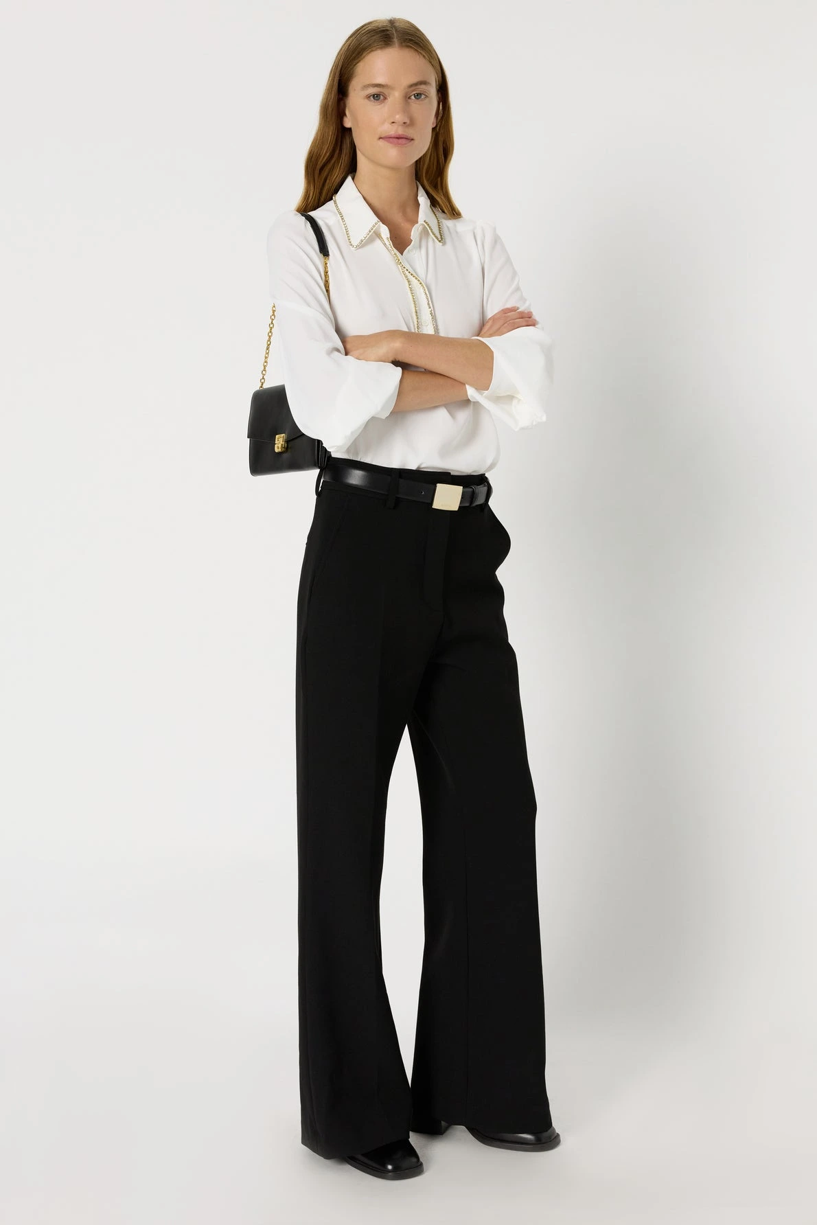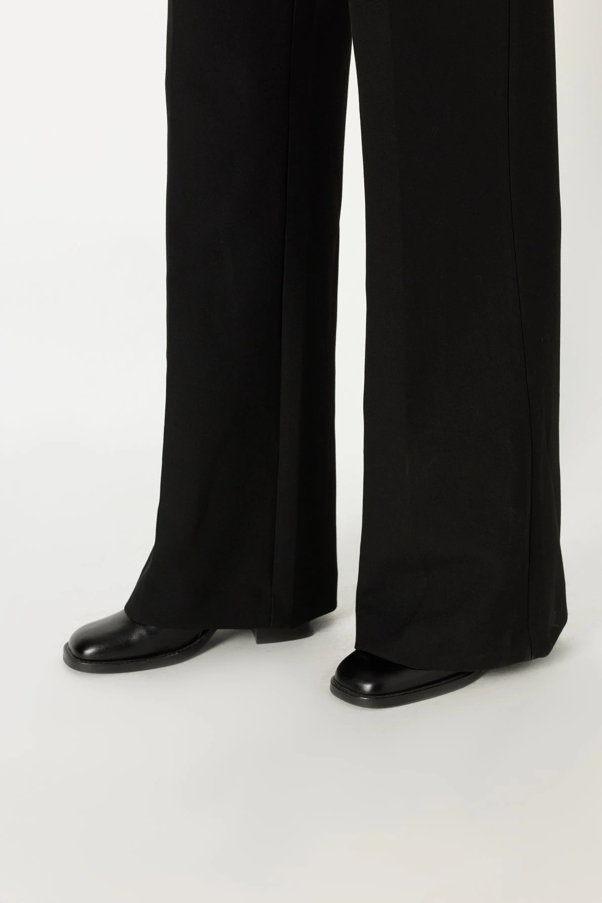 Esprit chic sans effort pour ce pantalon large et légèrement évasé en jersey noir. Il s’adaptera à toutes les occasions : sophistiqué avec une chemise et un blazer, ou casual avec un pull en laine. Un essentiel du dressing.