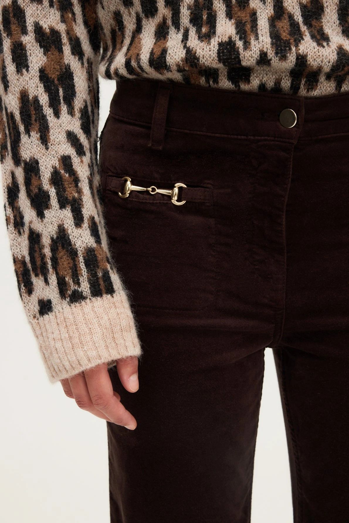 Avec ses poches ornées de mors dorés et sa coupe flare qui allonge la silhouette, ce pantalon flare en velours marron offre un délicieux côté vintage. A porter avec le gilet sans manche assorti pour parfaire le look, ou avec un pull léopard pour accentuer l’esprit vintage.