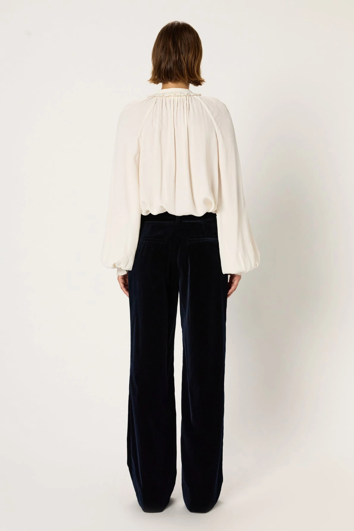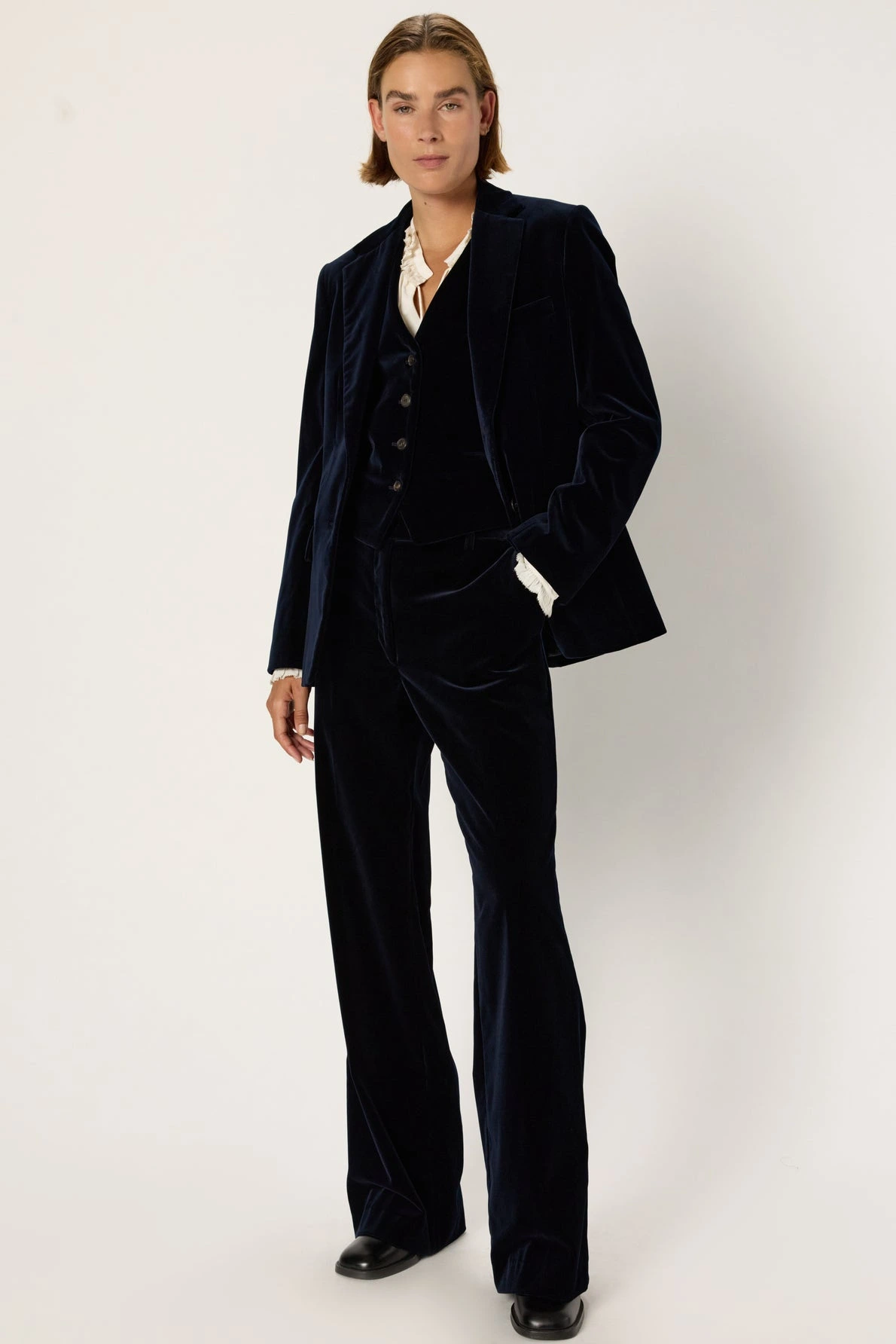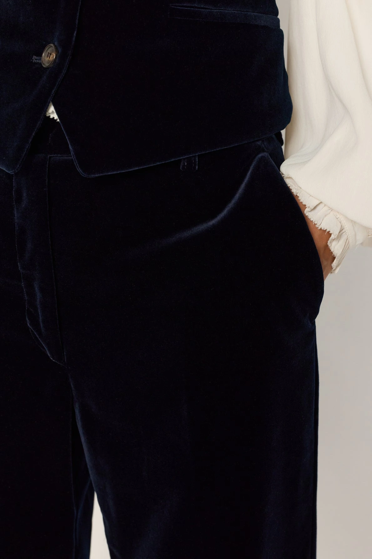 Le pantalon large en velours ras est la pièce maitresse des vestiaires chic. Décliné dans un bleu nuit intense, il pourra se porter avec la veste et le gilet sans manche assortis dans un esprit tailleur.