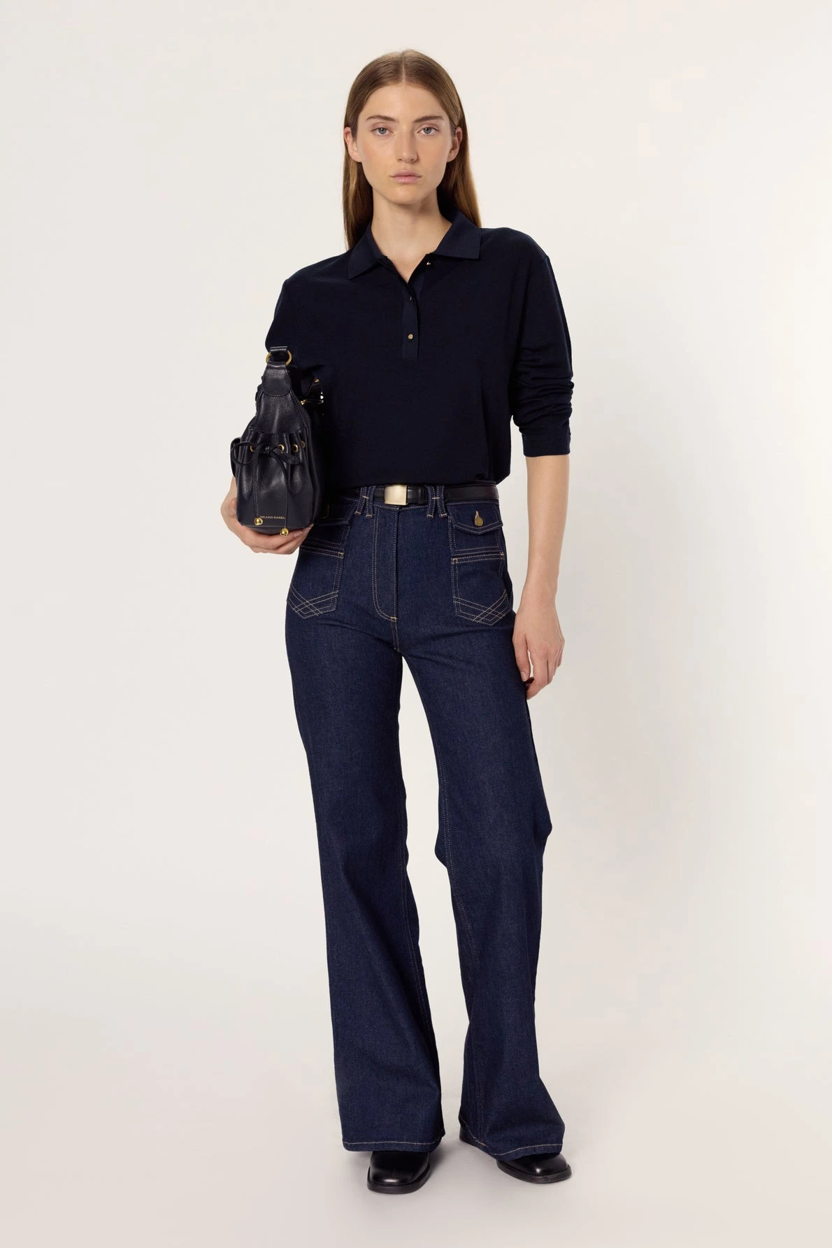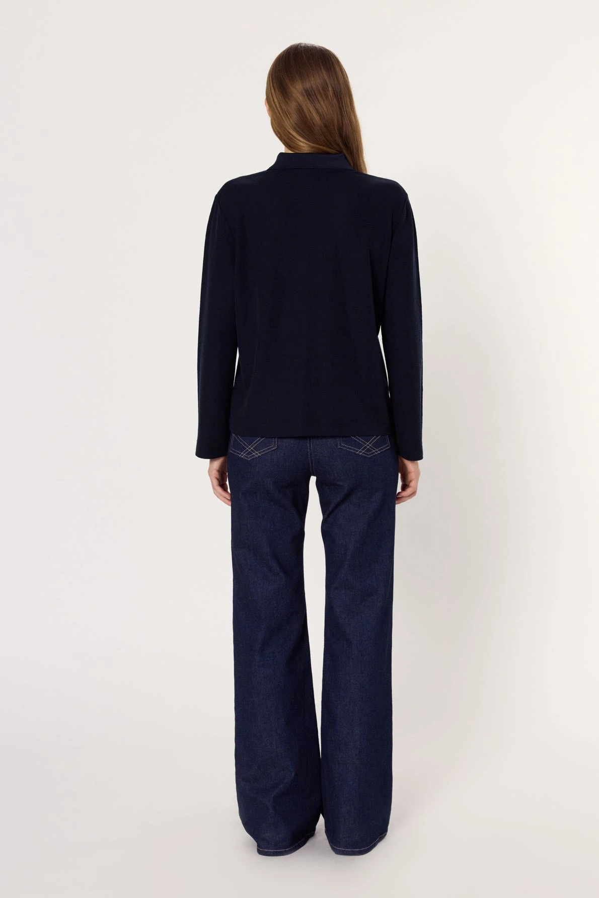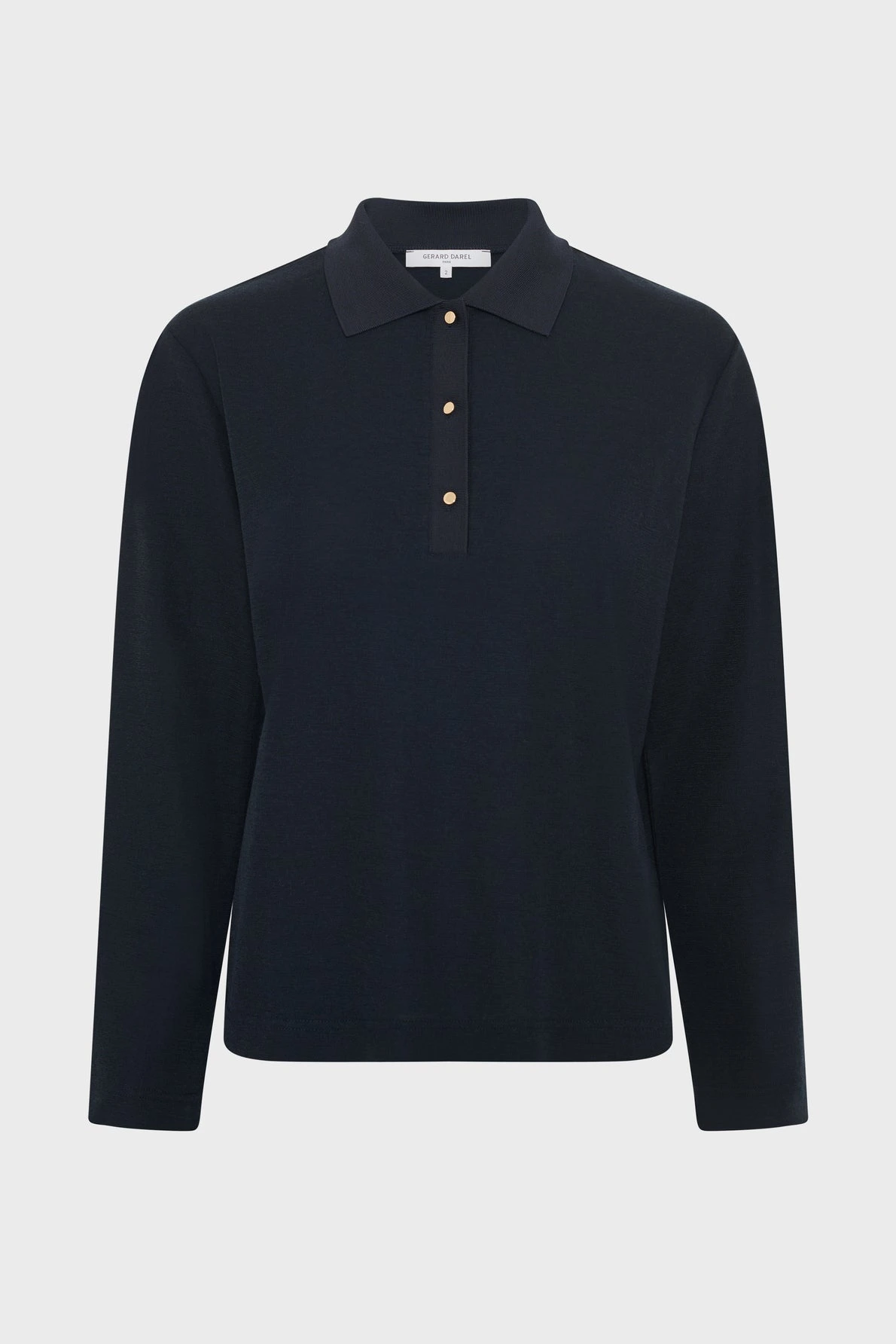 Esprit chicissime pour le polo en laine fine Hilary en bleu marine, et à l’encolure ornée de boutons dorés. Son volume ample et sa coupe fluide lui offrent un aspect contemporain.