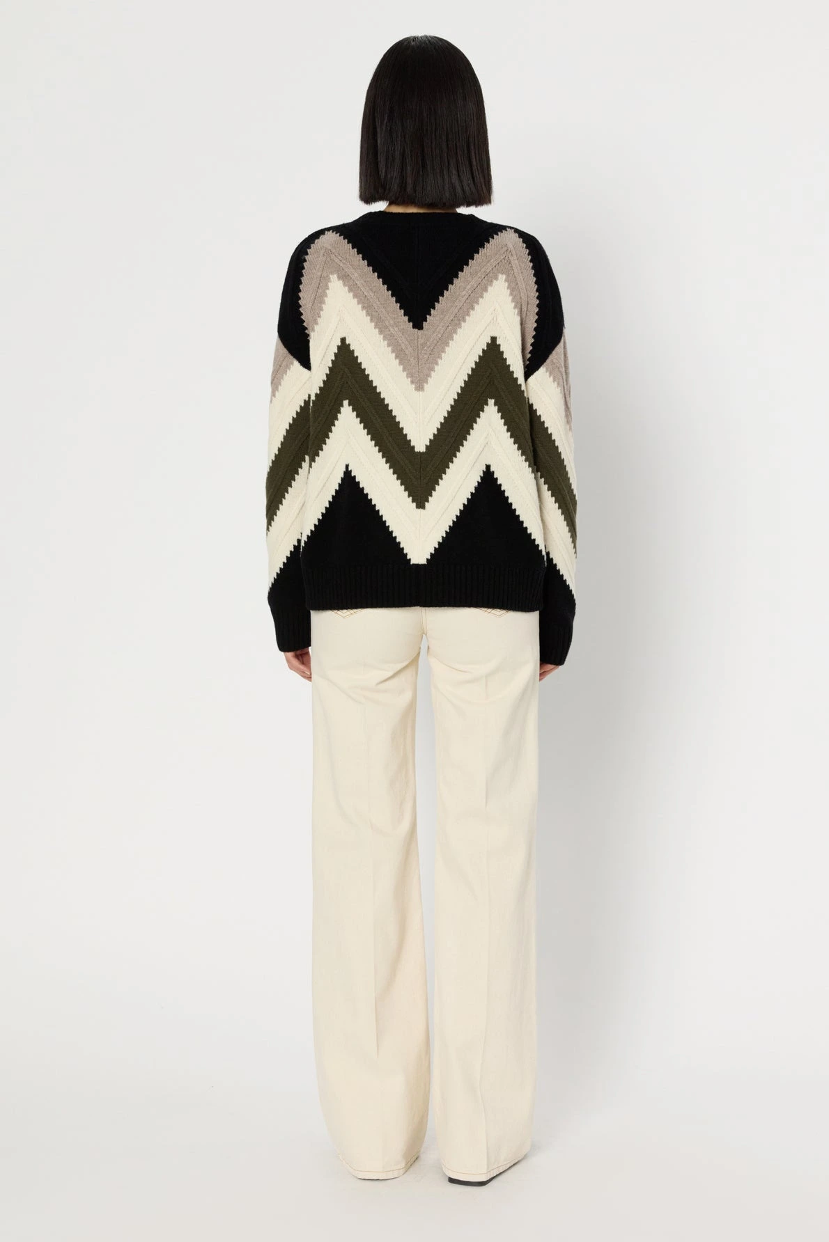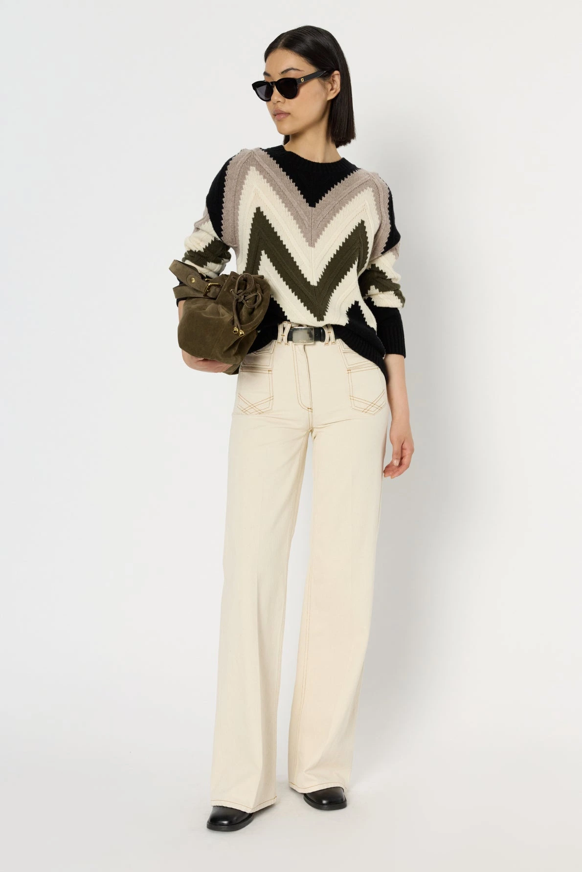 Pull à chevrons blanc, kaki et beige sur fond noir dans un esprit graphique très contemporain. Confectionné en 100% laine.