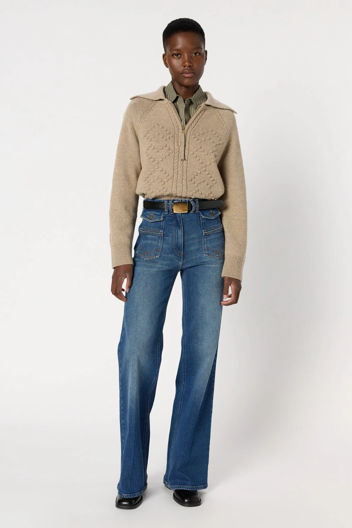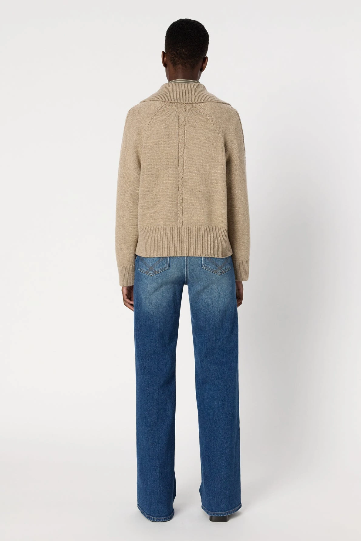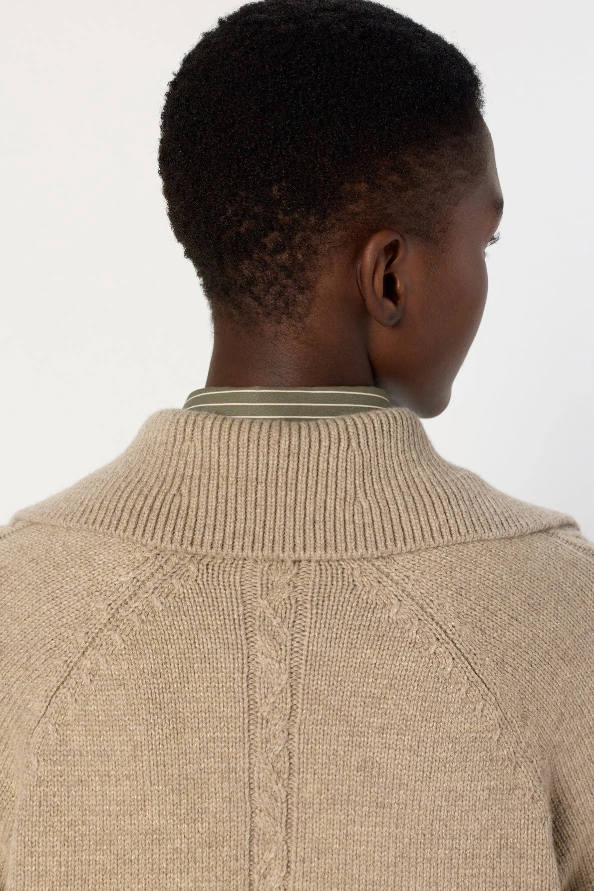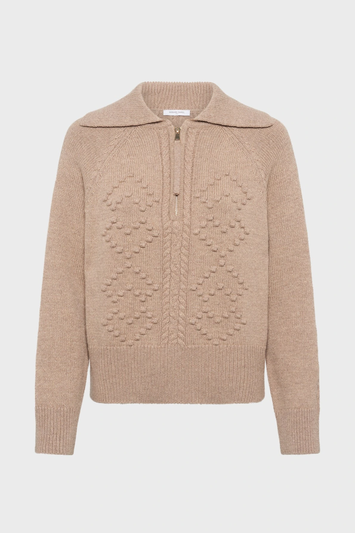 Le pull à lurex et col zippé Edena se distingue par son jeu de maille à losanges et torsades, son coloris beige incrusté de lurex doré et son col à encolure zippée. Pour donner une touche de fantaisie à l’hiver.
