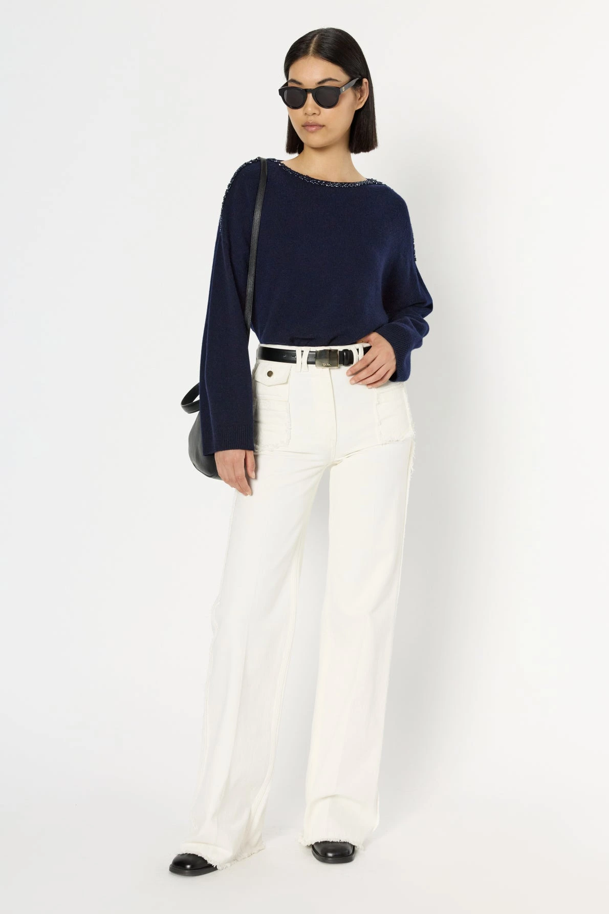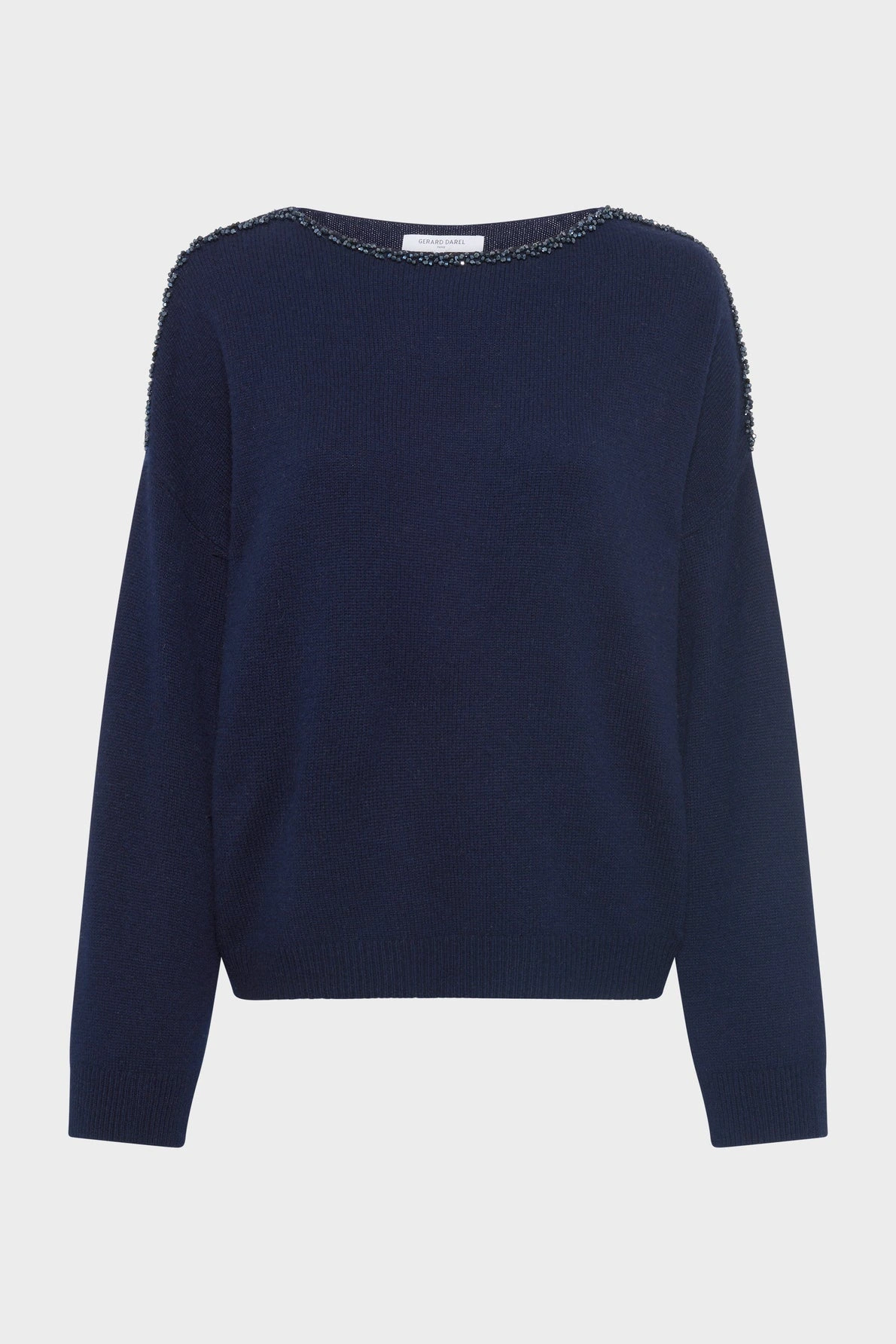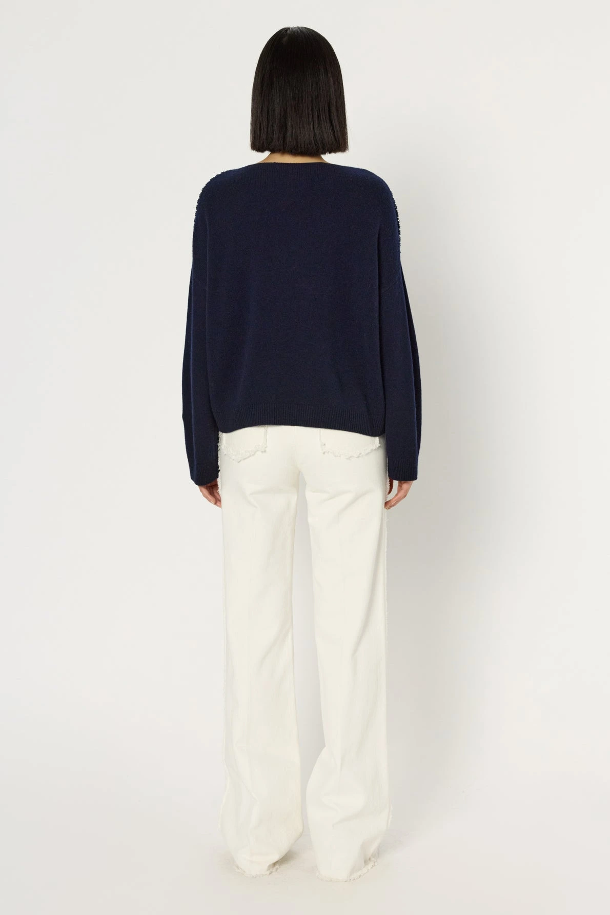D’allure contemporaine avec ses épaules tombantes et son volume ample, le pull ample en laine Esme se démarque par une double rangée de strass le long du col et sur le haut des épaules. Il est confectionné en 100% laine bleue marine.
