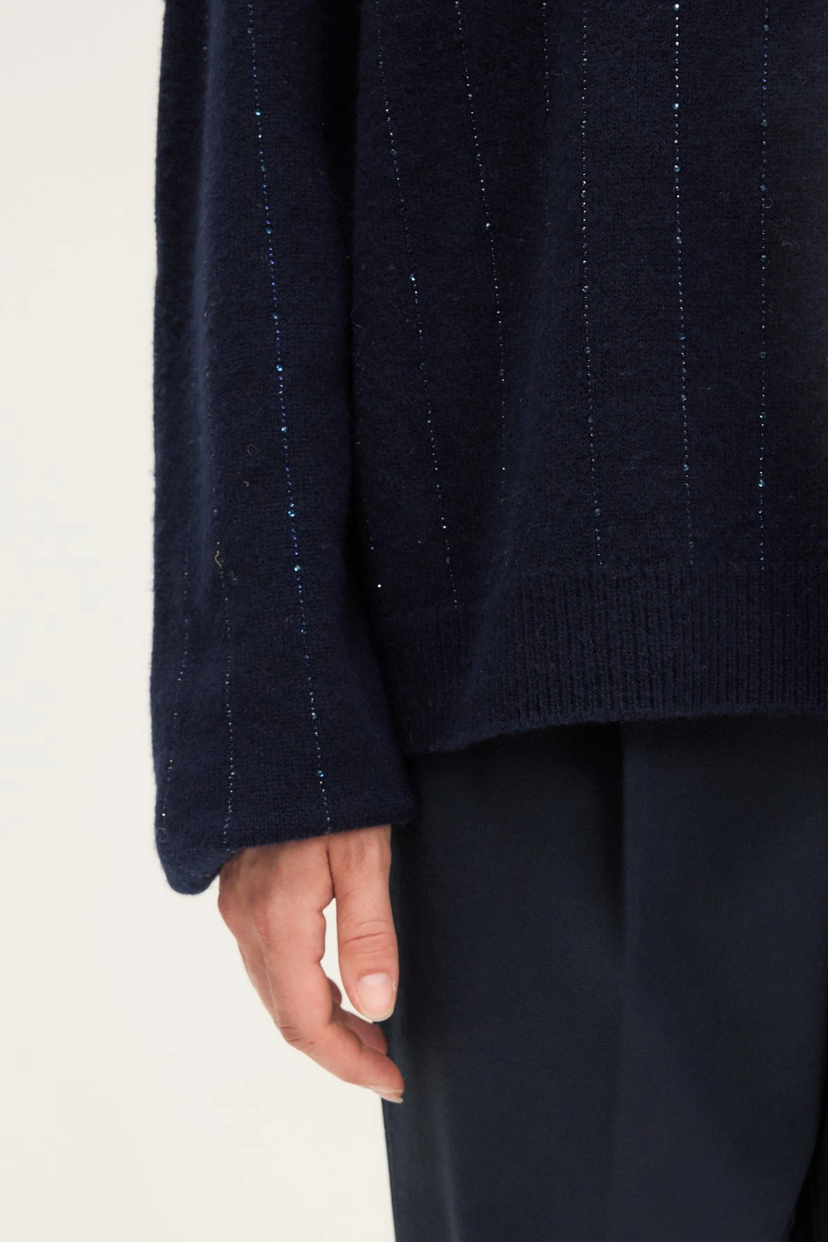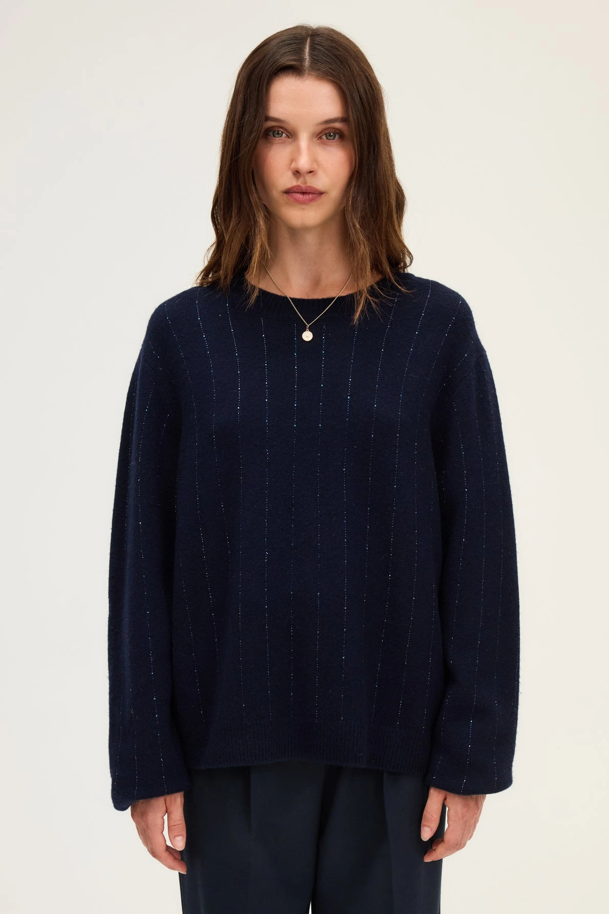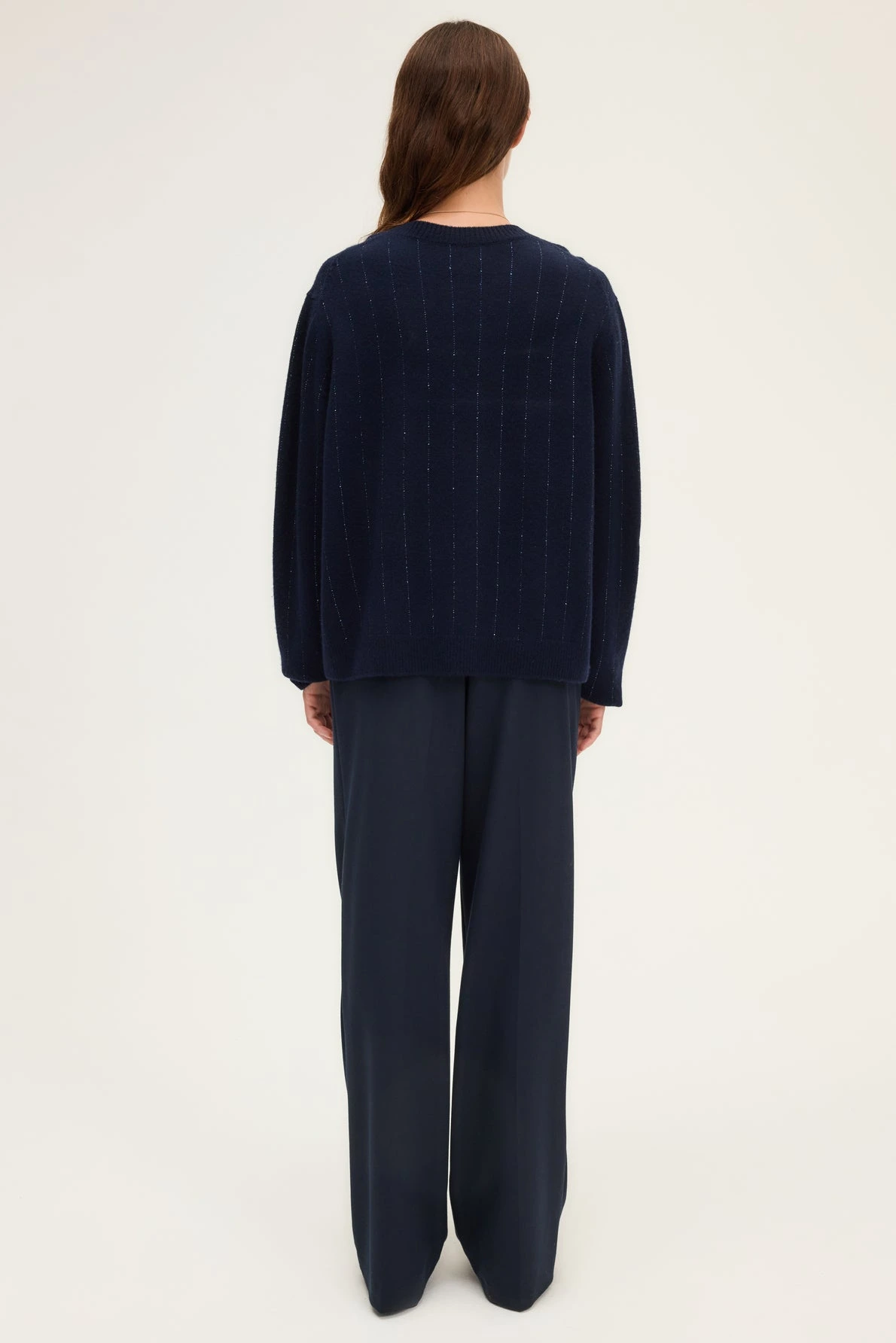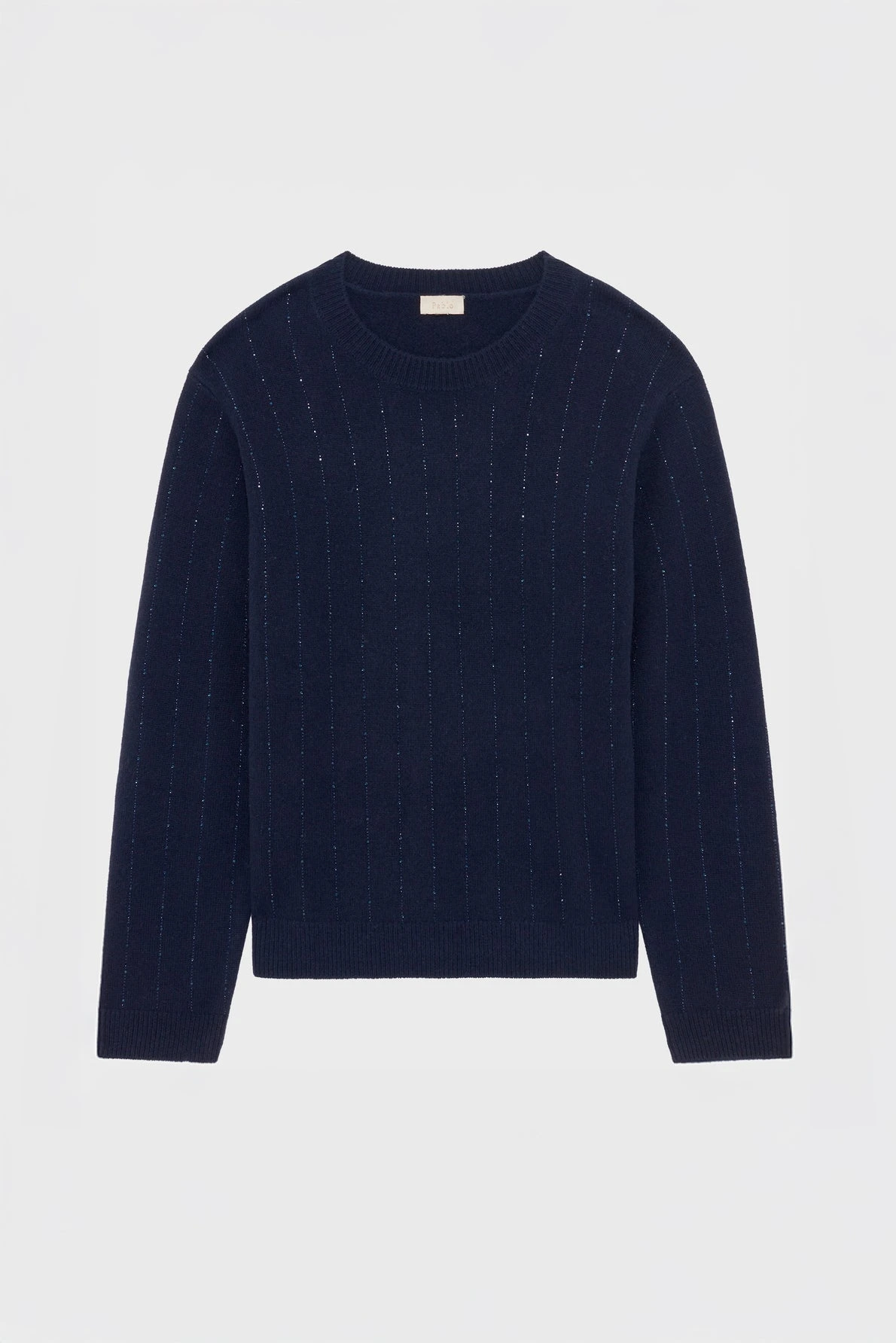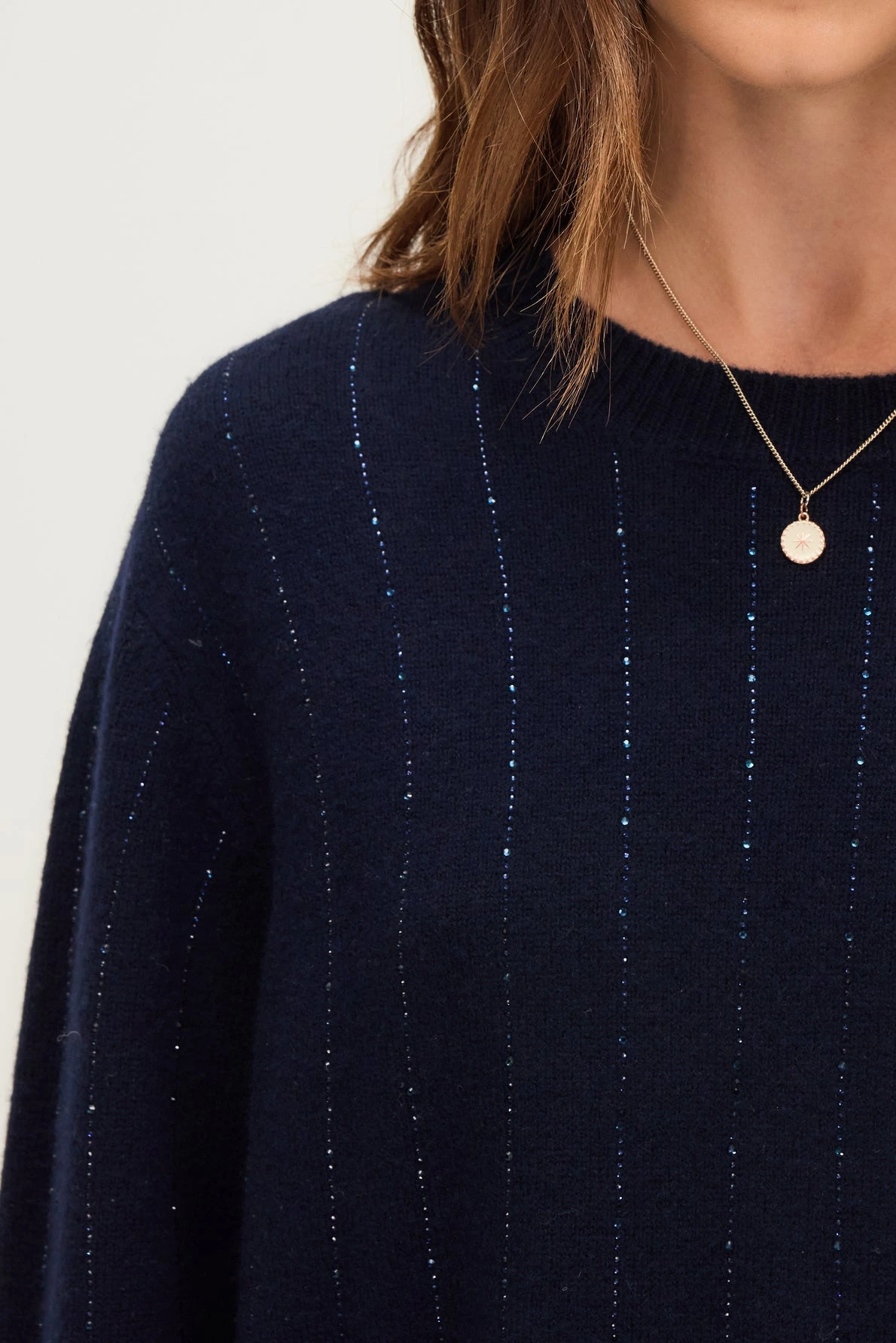 Pull en laine à strass bleu marine en 100% laine orné de petits strass bleus dans un esprit fantaisie discrète.
