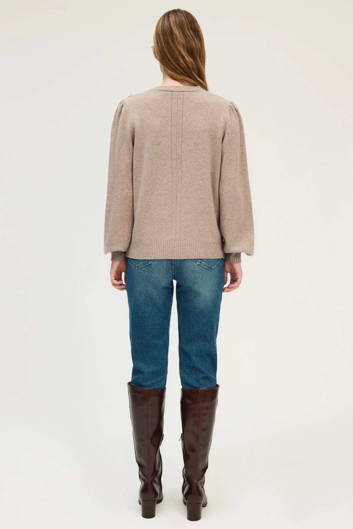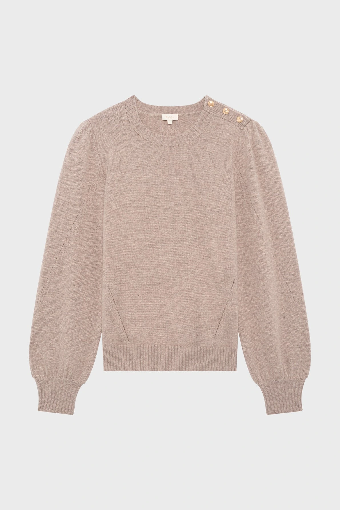 Confectionné en 100% laine au toucher doux, le pull en laine Eloïse séduira par ses épaules légèrement plissées et ses manches bouffantes. Il est proposé en beige pour contraster avec les boutons dorés. Il est orné d’un délicat motif ajouré.