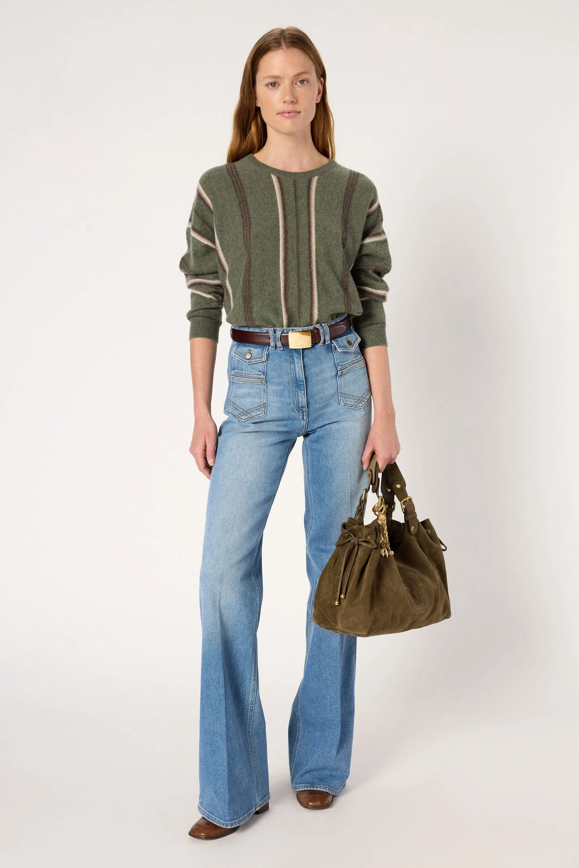 Pull rayé en cachemire orné d’un jeu de rayures verticales et horizontales sur les bras, dans des teintes de marron et de kaki clair. Confectionné en 100% cachemire pour porter à même la peau.