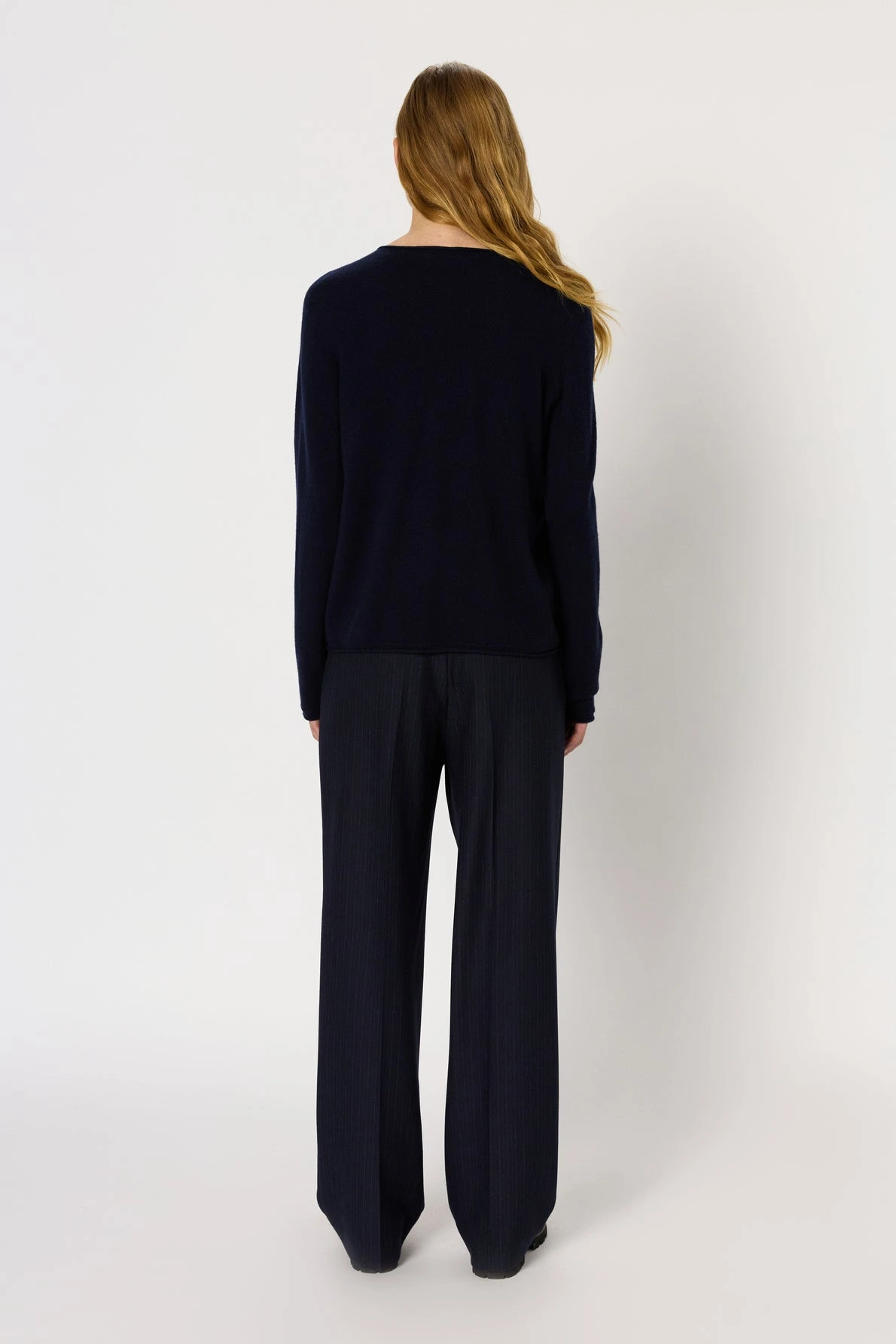 Confectionné en 100% laine bleue marine, ce pull rouloté en laine offre des finitions roulotées qui apportent une note de légèreté à la coupe.