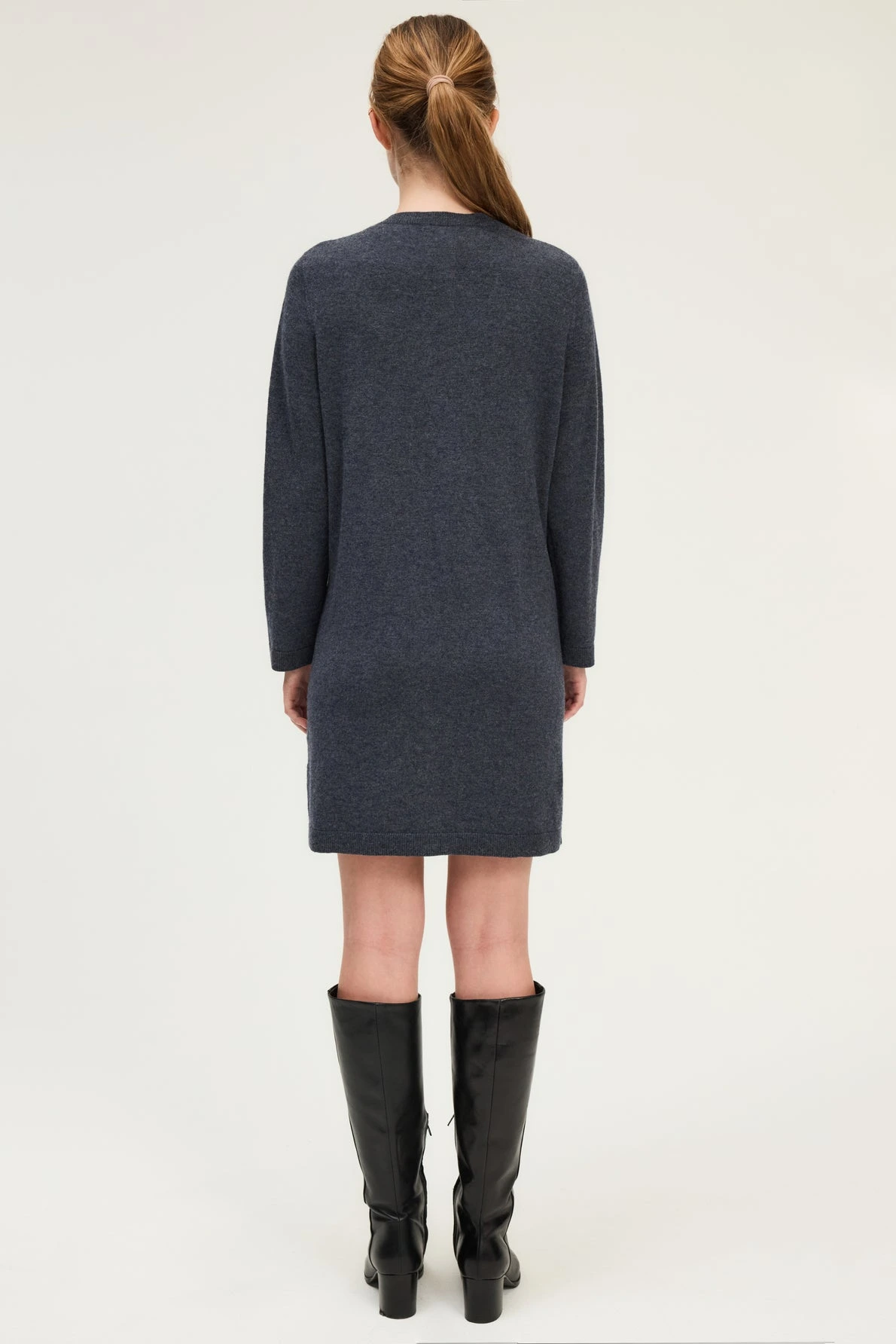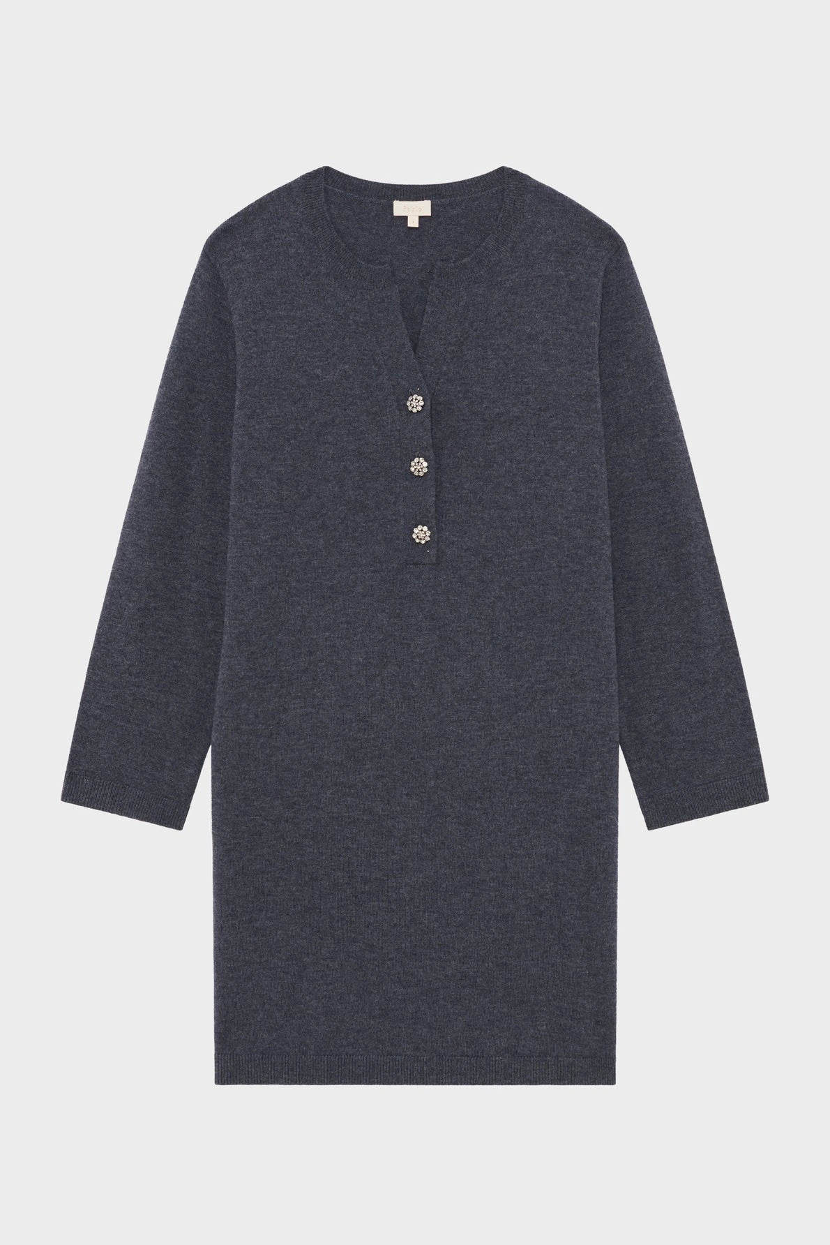 Avec son encolure ornée de strass, cette robe courte en laine grise allie décontraction et sophistication. Elle se fera casual avec des bottes ou chic avec des talons.
