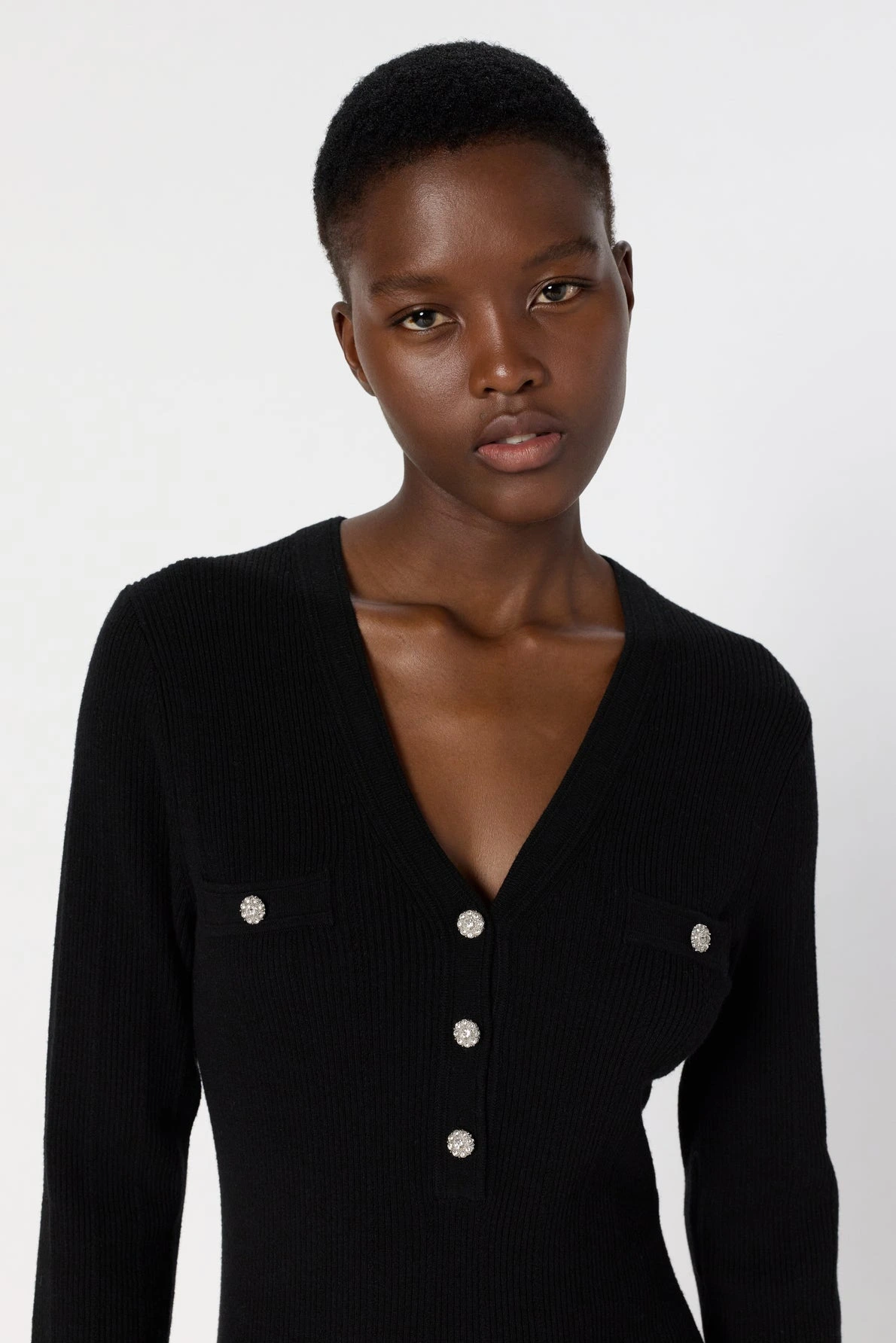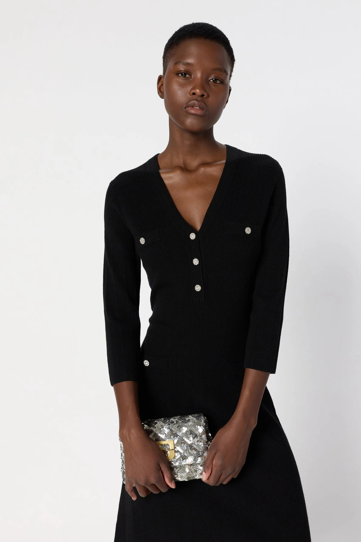 Confectionnée en maille stretch, la robe en maille Lais épouse la silhouette grâce à sa coupe ajustée et évasée dans le bas. Ornée de boutons en strass sophistiqués, elle se portera aussi bien la journée que pour des occasions spéciales.
