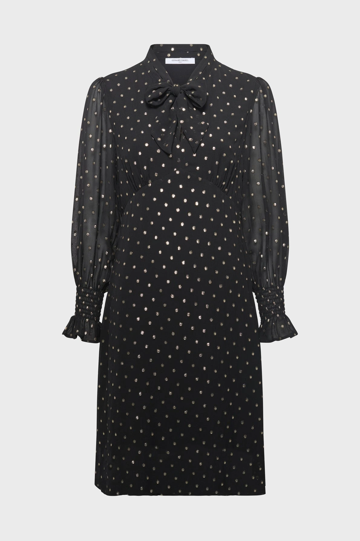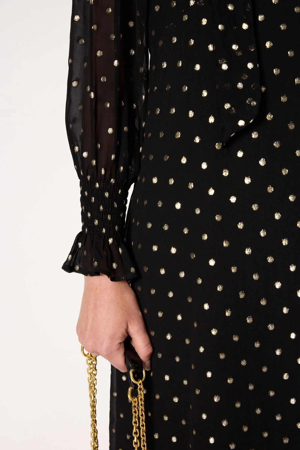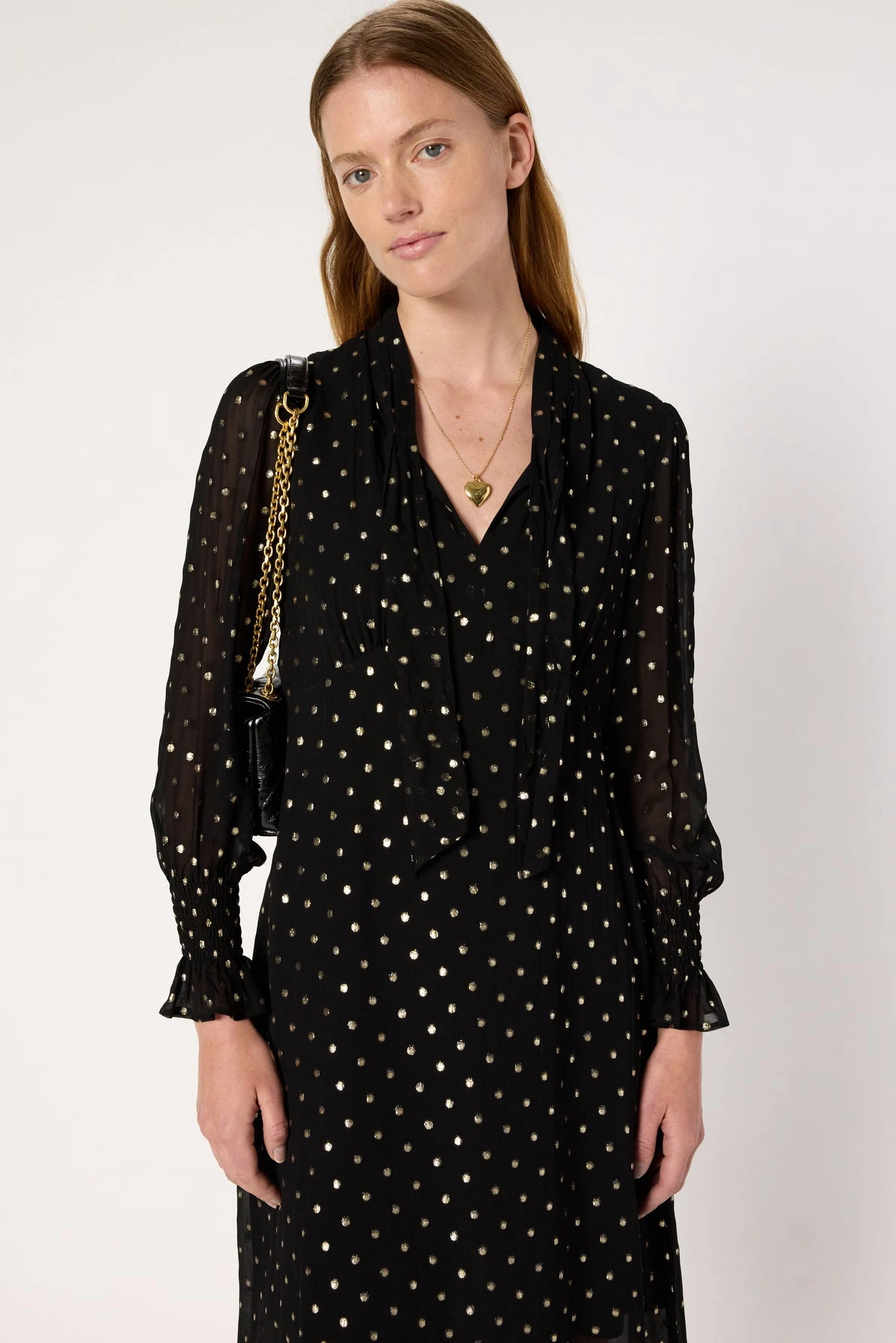 Allure sophistiquée pour cette robe en mousseline noire à col lavallière et ornée de pois en lurex doré.