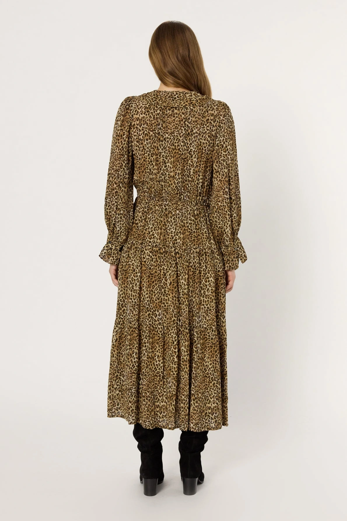 Confectionnée dans une matière lisse et fluide, la robe longue Lyza se démarque par son motif léopard, son jeu de volants et de plis. Elle est boutonnée sur toute la longueur et sa taille est élastiquée.