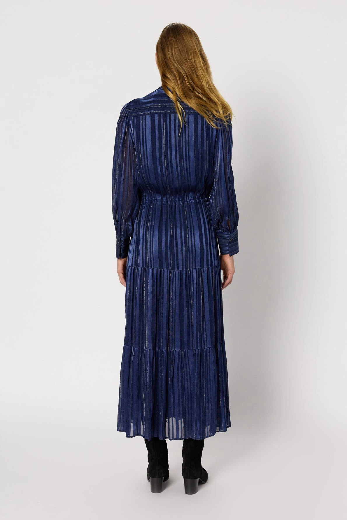 La robe longue satinée Lydie est ornée de bandes satinées et de bandes transparentes rehaussées d’un fil de lurex doré. Cintrée à la taille, ses manches longues et bouffantes structurent la silhouette. Elle se portera avec des bottes, ou avec des talons pour les événements habillés.