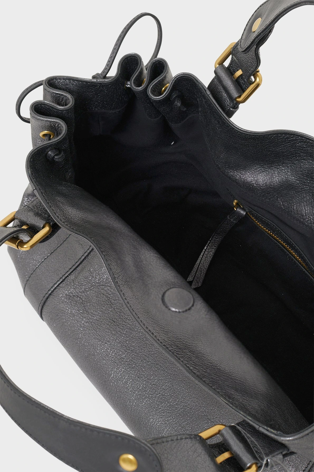 • Sac froncé sur les côtés par deux liens en cuir, enveloppé de bandes de corps.