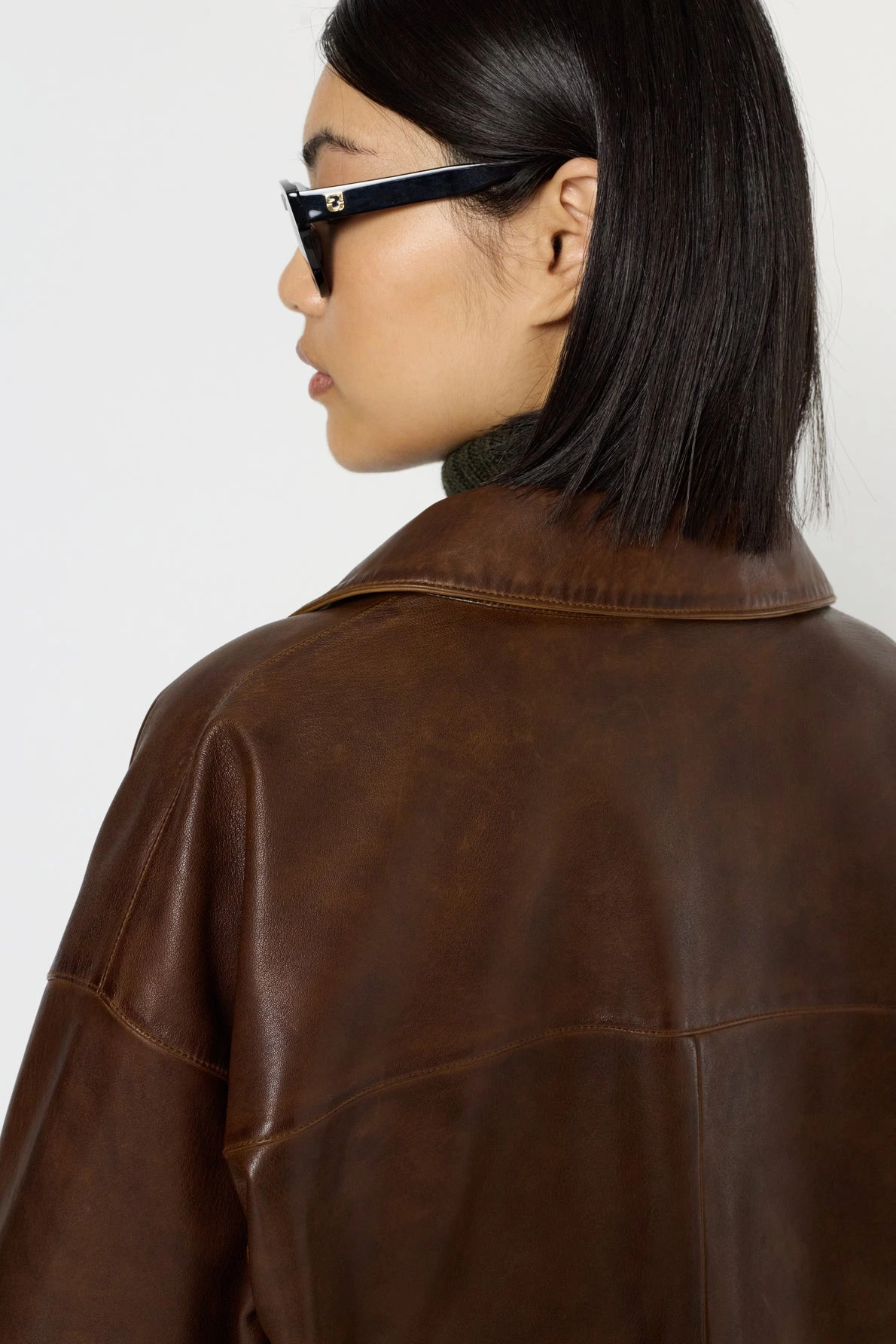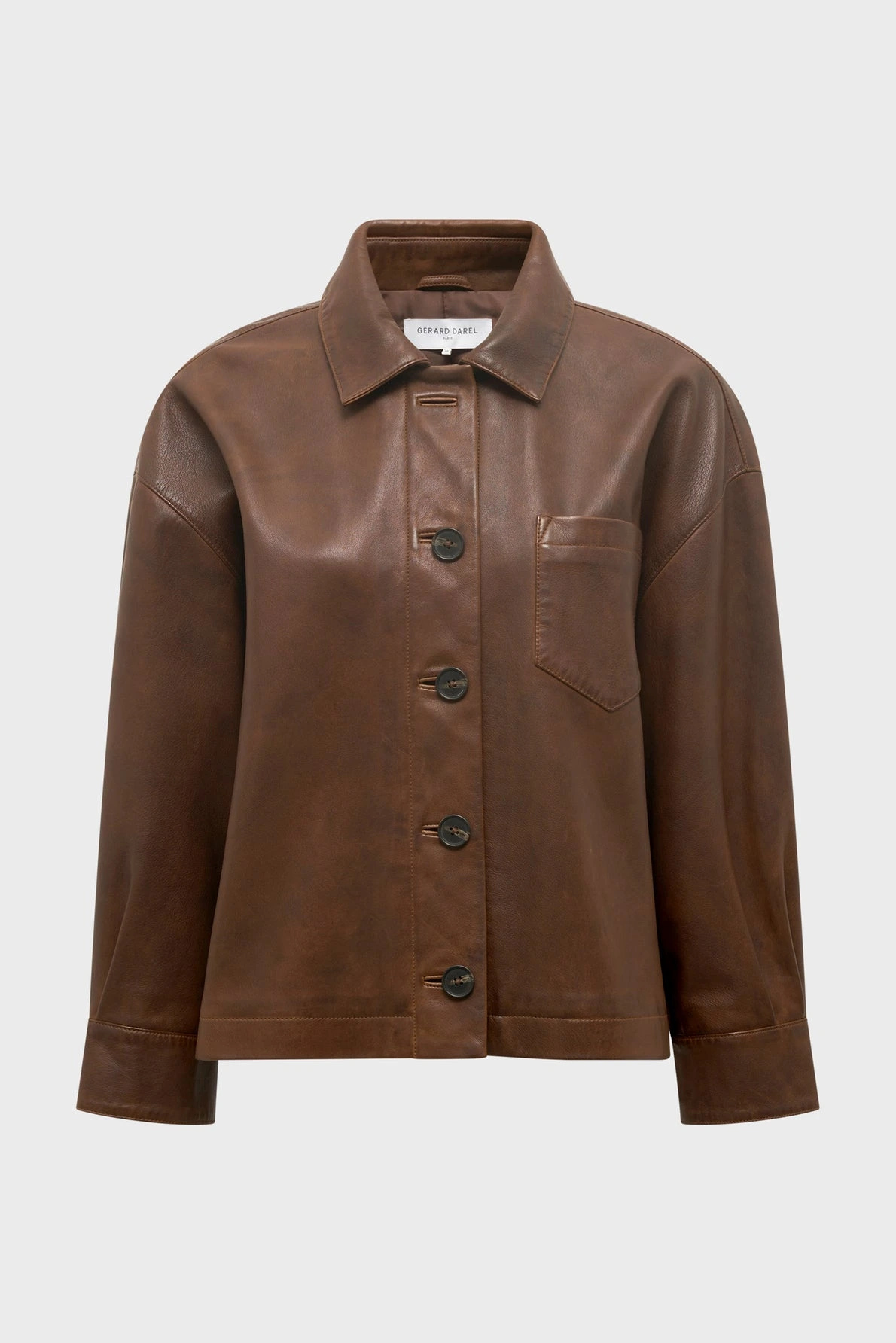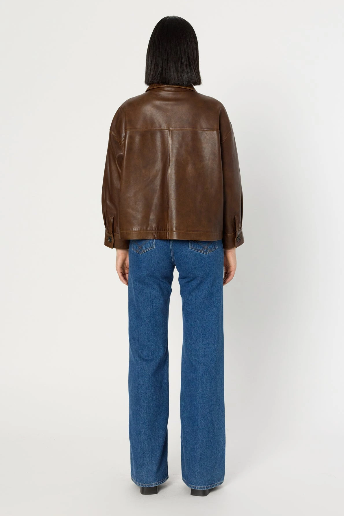 Veste courte et ample en cuir vieilli dans un esprit surchemise en cuir vieilli. Sur une robe, elle jouera le coté masculin – féminin. Son coloris marron se mariera avec une large palette de teintes, du camel au noir en passant par le bleu marine.