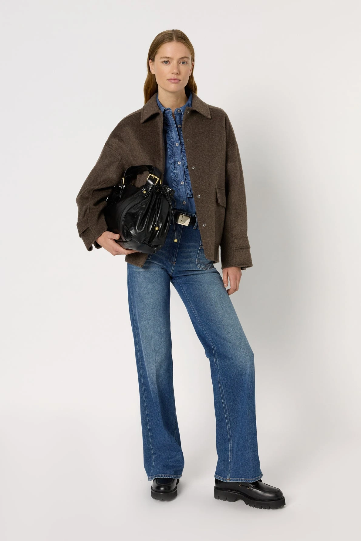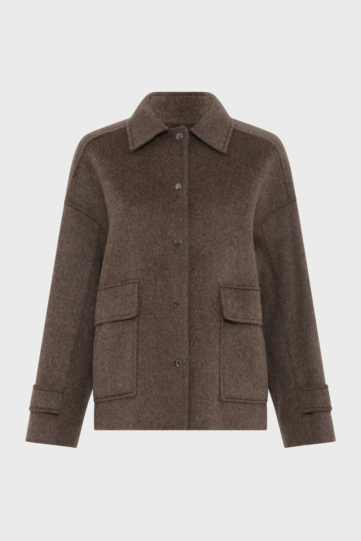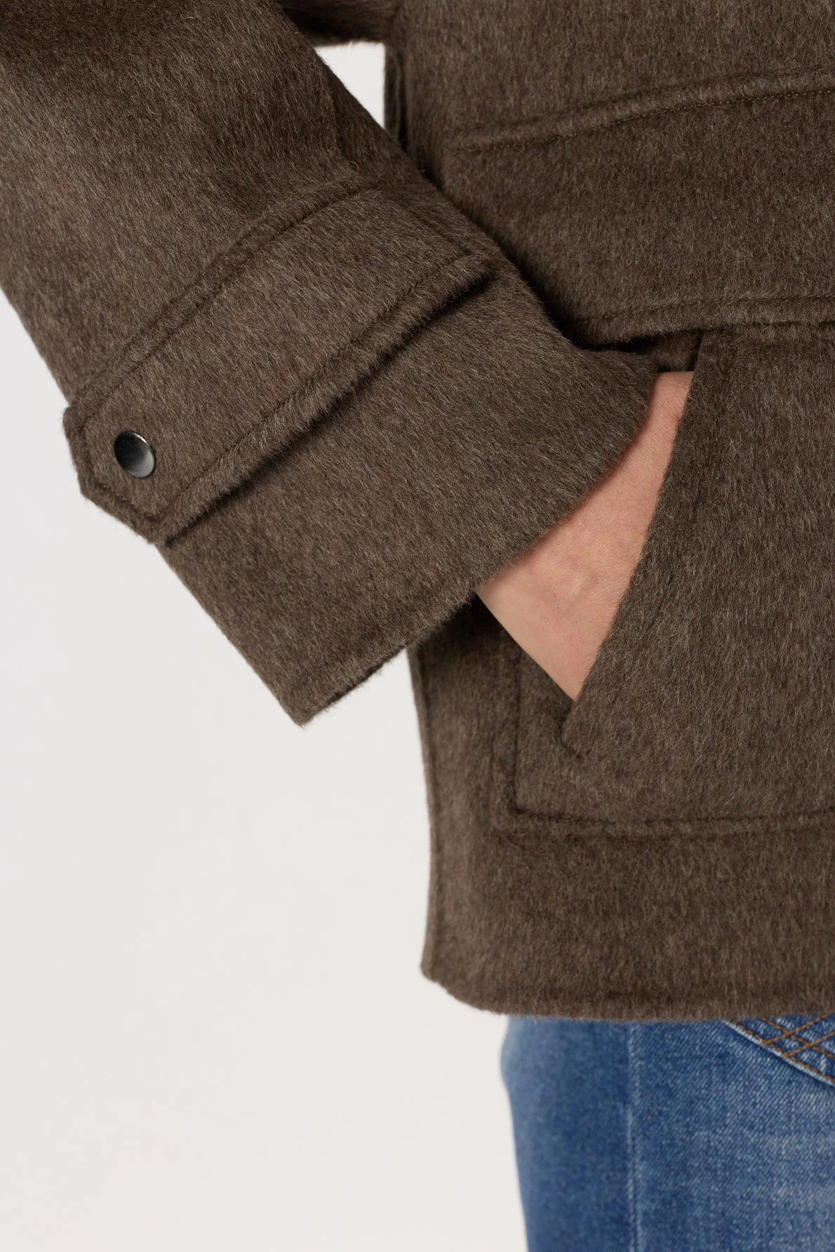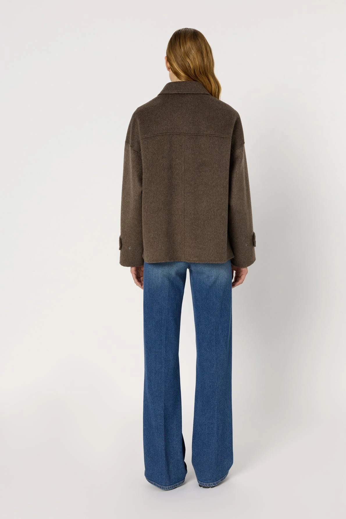 Manteau court oversize dans un esprit surchemise en laine pour un porter urbain et casual. Confectionné en 100% laine fine double face. Son coloris taupe est rehaussé par des boutons métallisés.