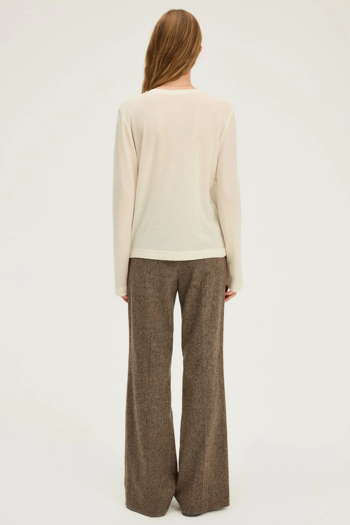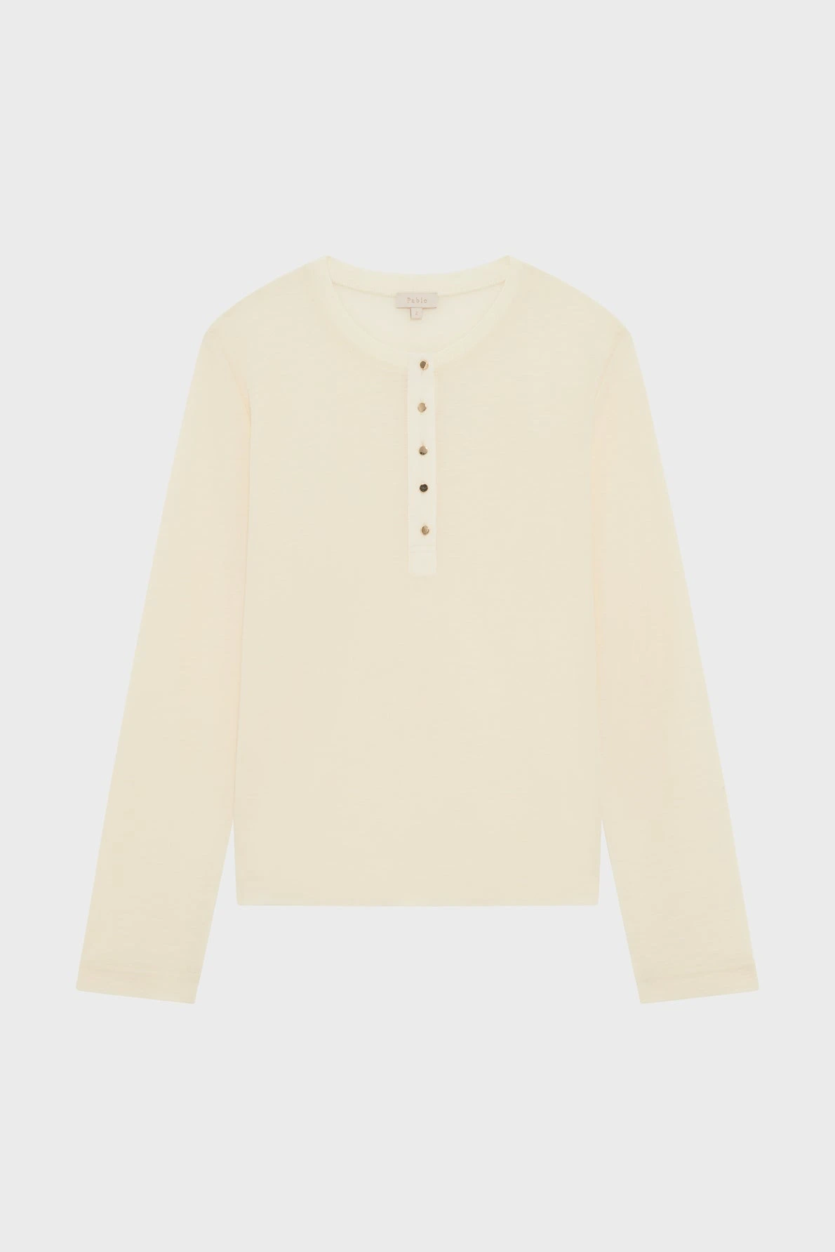 T-shirt en laine écru à l’encolure ornée de petits boutons dorés, à porter avec un blazer pour une allure sophistiquée. 100% laine fine.
