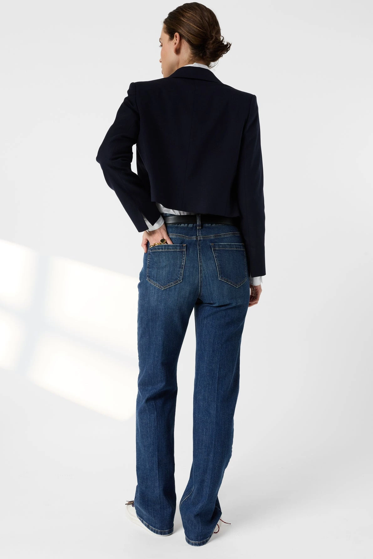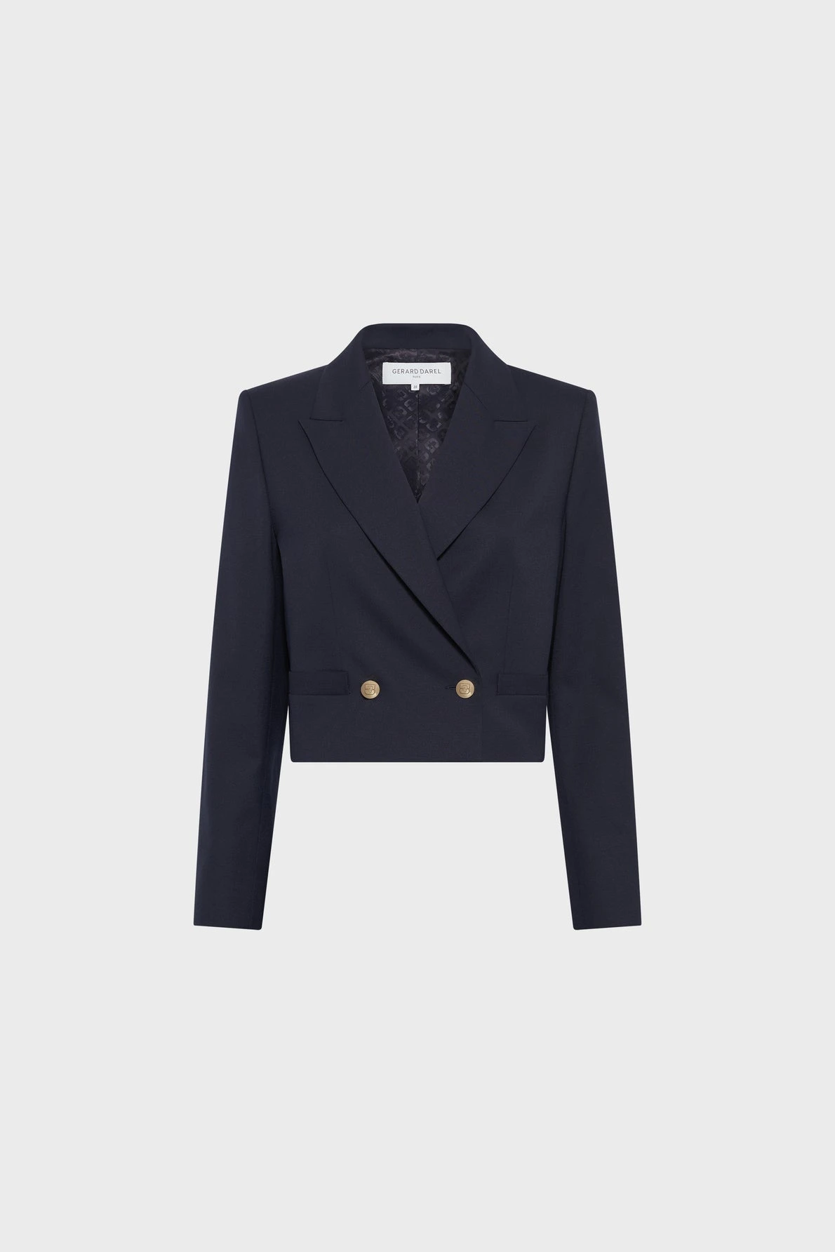 Veste courte Spencer bleu marine, à la coupe courte pour souligner la taille et moderniser la silhouette. Les boutons dorés apportent une touche chic et graphique. Une pièce idéale pour dynamiser un pantalon taille haute, ou pour porter avec le short assorti dans un esprit tailleur.