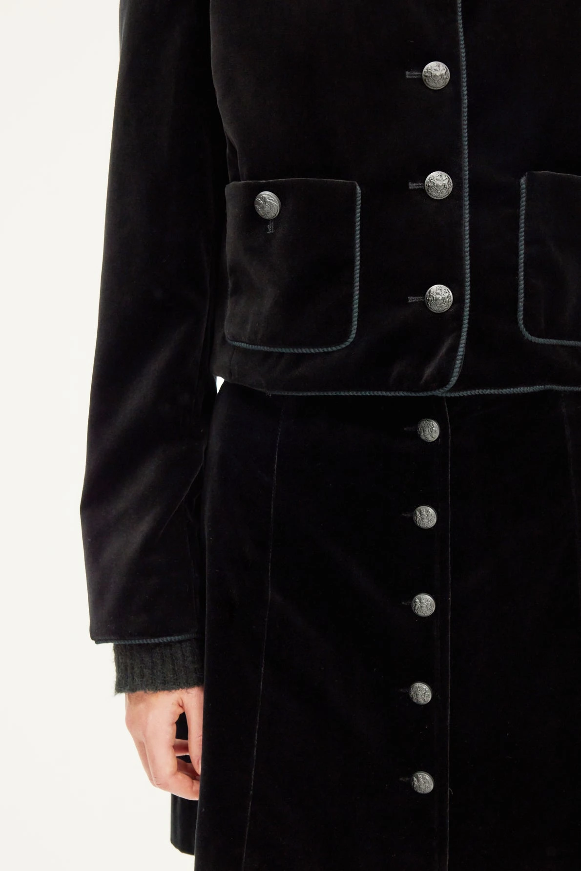 La veste courte sans col en velours Noa se distingue par ses détails gansés et ses boutons ornés d’un blason gravé. Elle se portera très chic avec la jupe assortie, ou avec un jean pour jouer le décalé. Velours lisse aux reflets moirés.