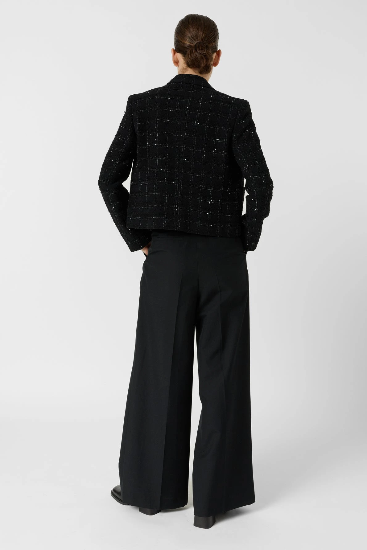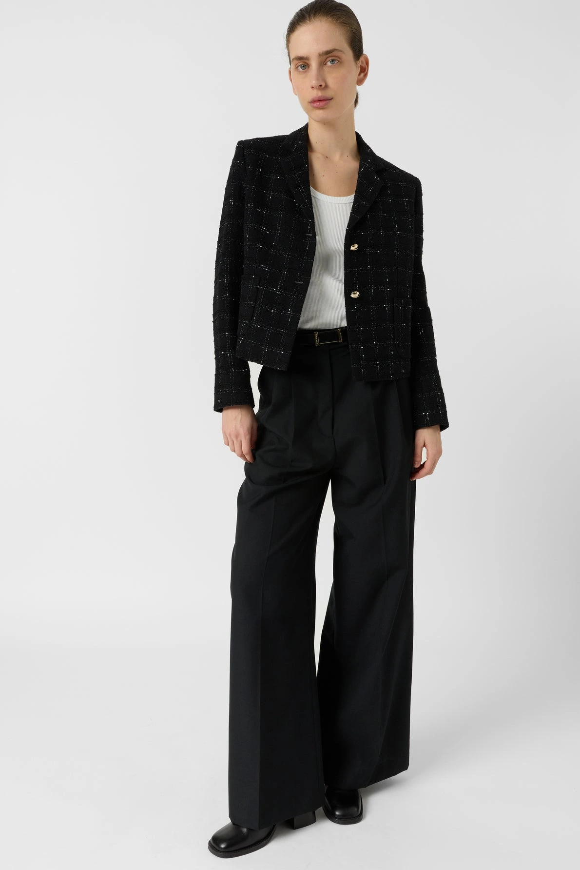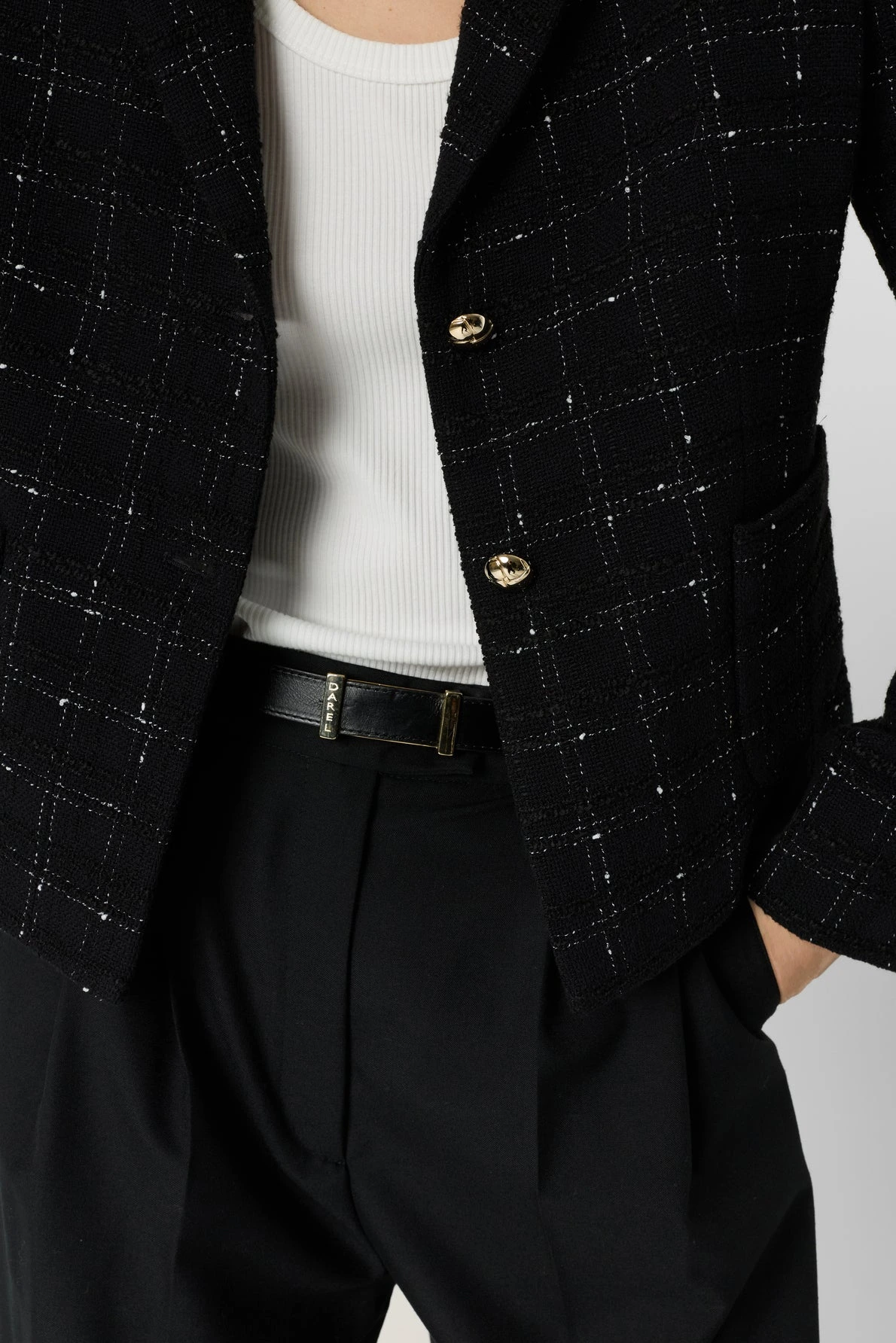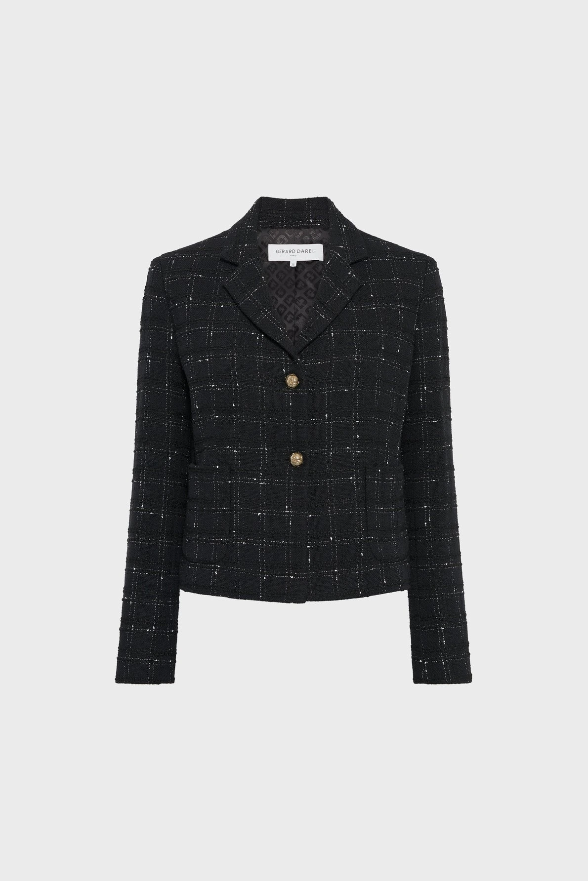 Veste de tailleur en tweed noir à carreaux discrets, structurée par un col classique et deux boutons dorés qui apportent une touche lumineuse. Sa coupe légèrement cintrée lui donne cette allure à la fois chic et moderne.
