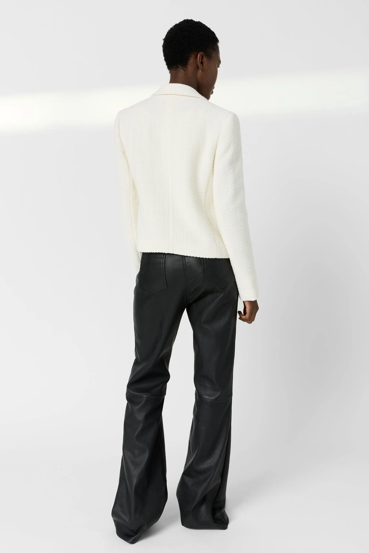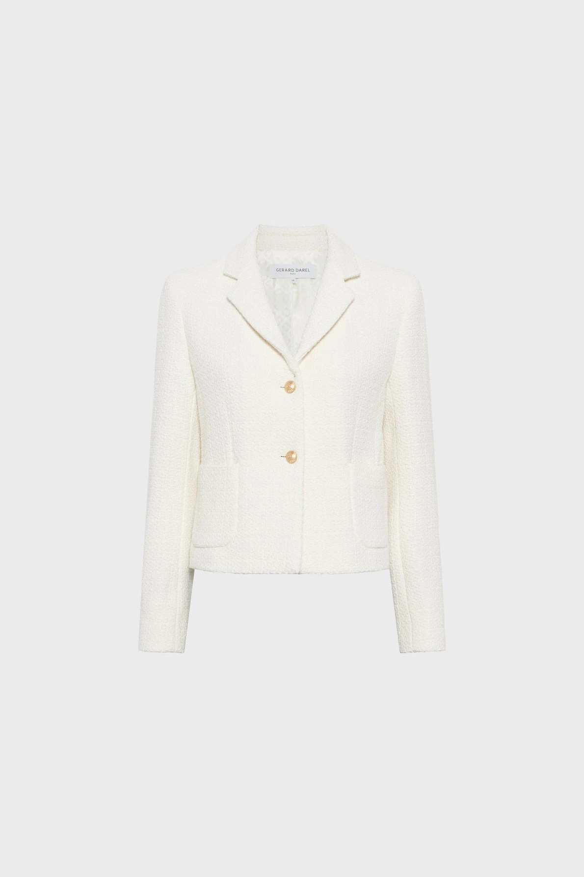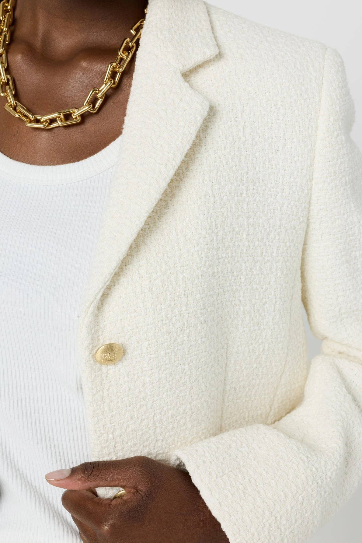 La veste de tailleur en tweed Tahiti séduit par son tweed uni d’un blanc éclatant, qui contraste avec des boutons dorés gravés. Les poches plaquées renforcent son esprit intemporel, facile à porter avec un jean comme un pantalon habillé.