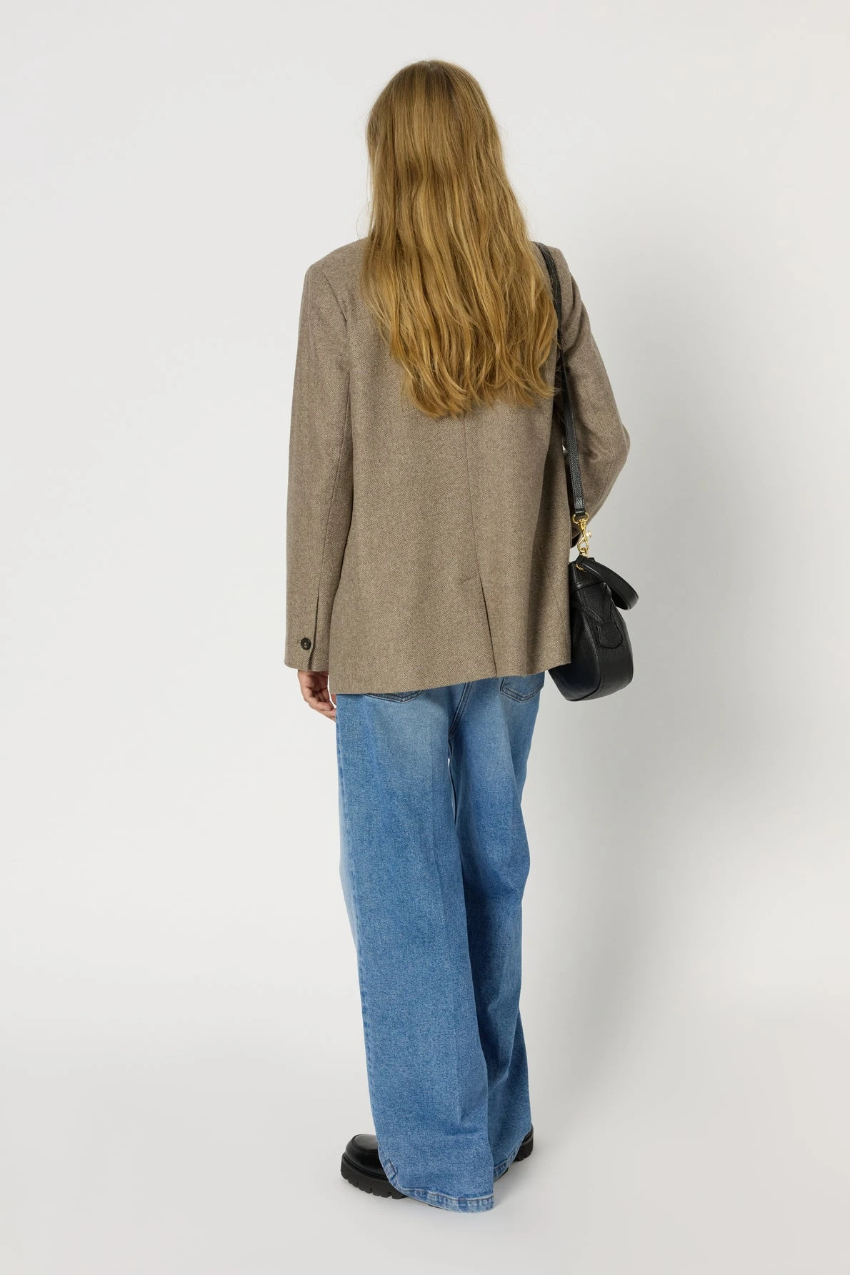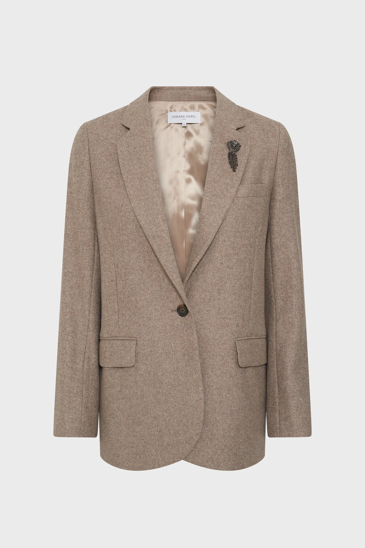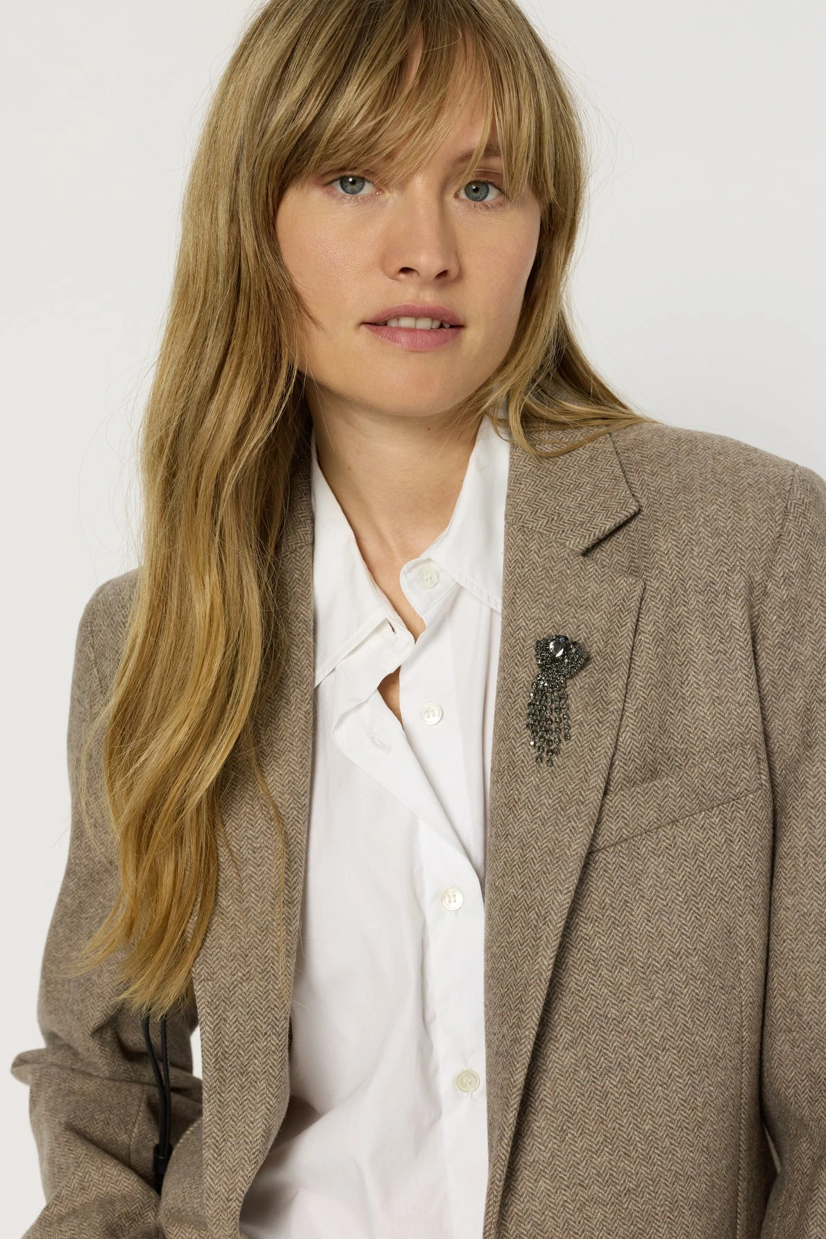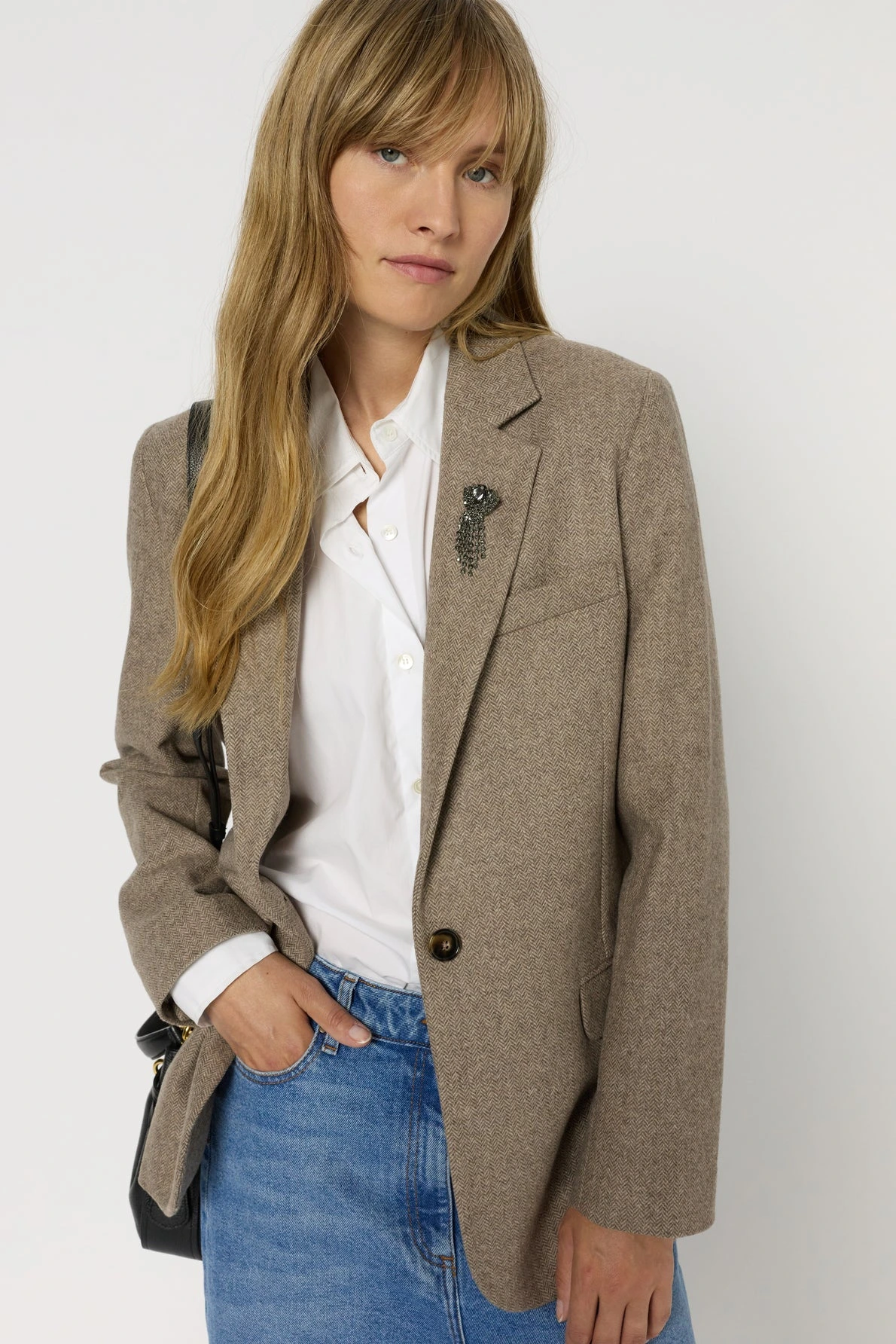 Veste droite à chevrons, pièce classique indispensable d’un dressing d’hiver. Confectionnée en laine mélangée, elle se portera aussi bien avec un pull en entrée de saison que sous un manteau pour le plein hiver. Elle est déclinée en beige pour éclaircir la tenue.