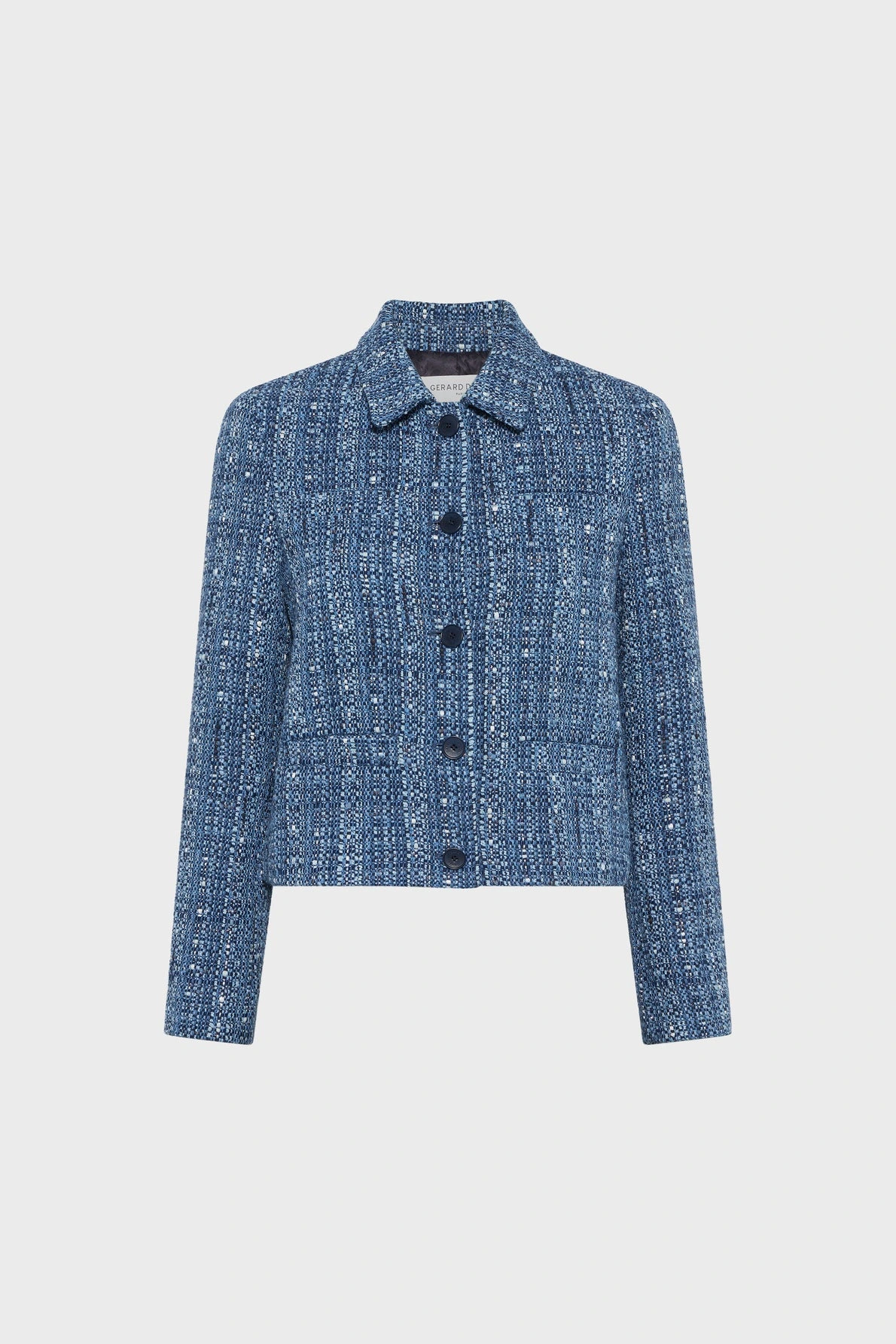 La veste en tweed à lurex Tahlia  incarne l’élégance à la française. Elle est ornée de lurex argenté qui rehausse ses nuances de bleu, et doté d’un col chemise dans un esprit fifties. Elle donnera une note de chic à toute une tenue, que l’on porte un jean, un pantalon de tailleur ou une petite robe. Elle est confectionnée dans un mélange contenant du coton (coton majoritaire).