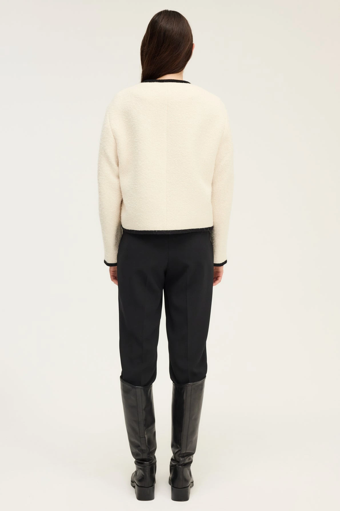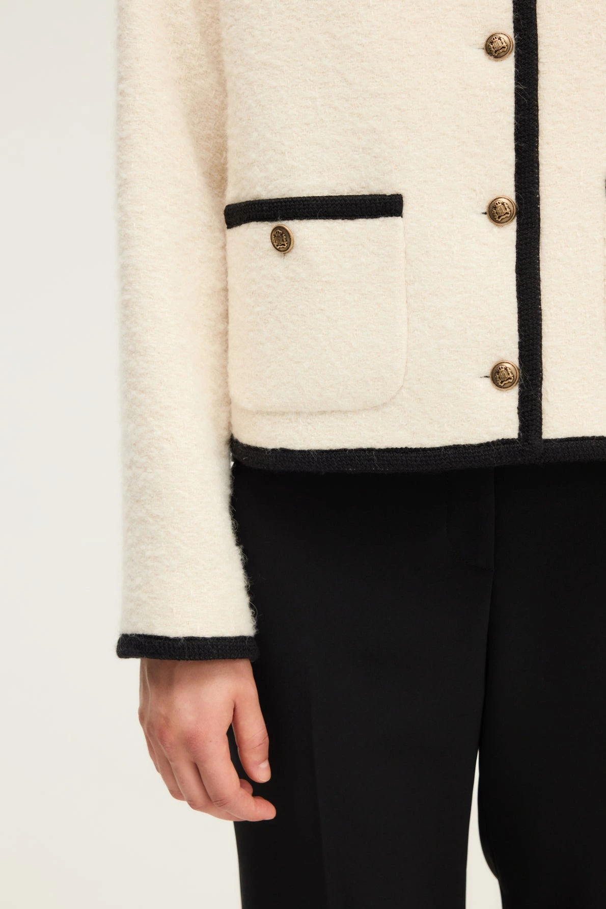 Esprit preppy pour la veste en tweed Nalya, qui se démarque par son côté bicolore écru et noir. Elle est confectionnée dans un mélange contenant de la laine et du coton à l’aspect bouclé, et orné de boutons gravés d’un blason.